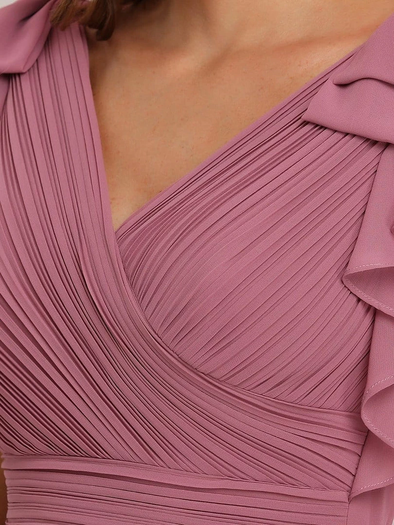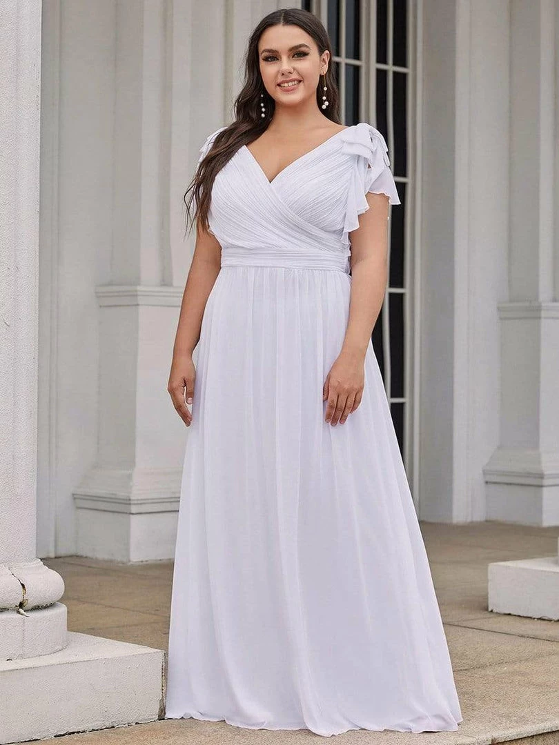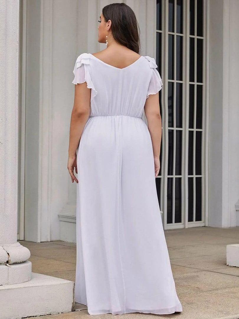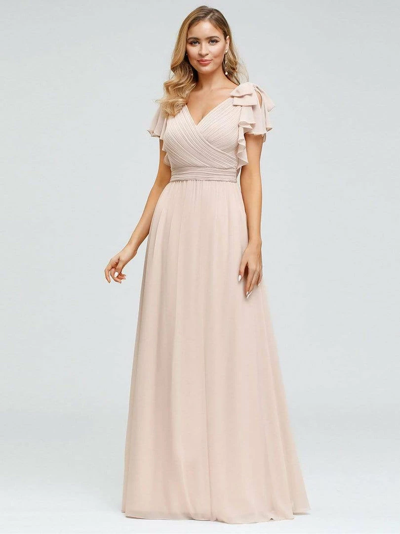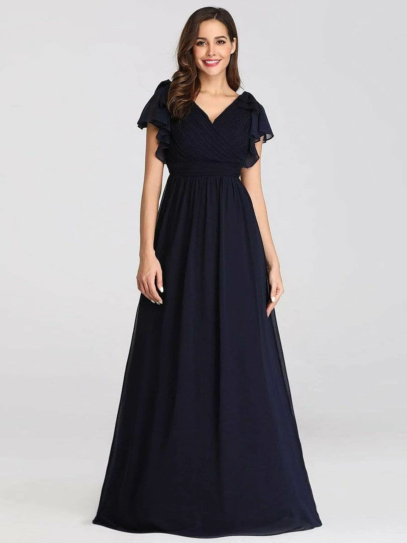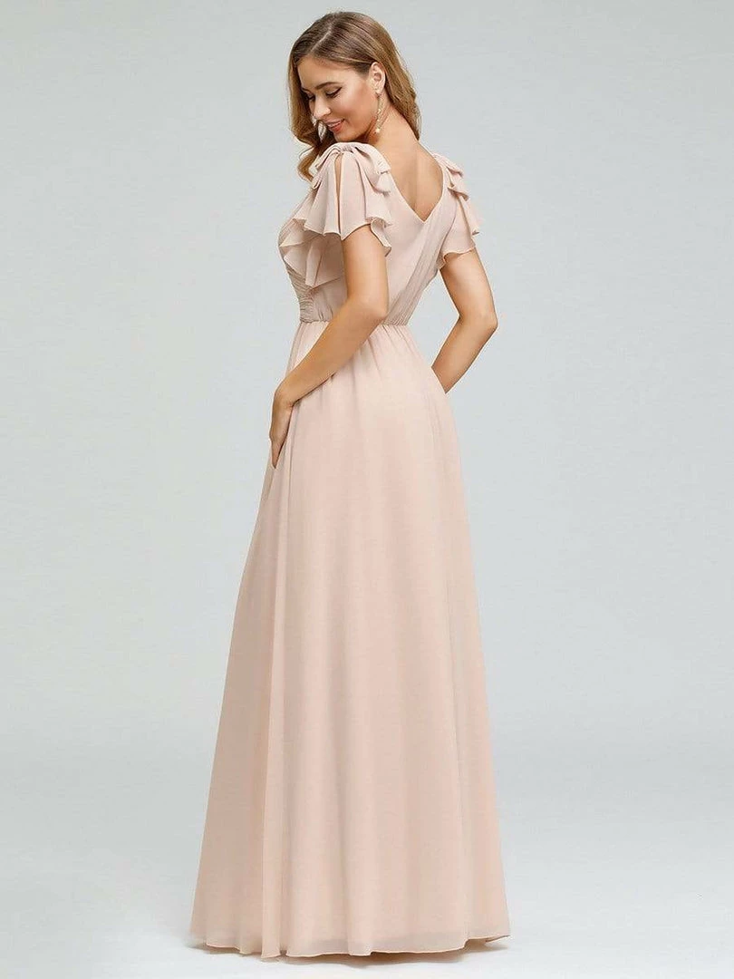 Elegant floor length chiffon evening dress with ruffle sleeves and a deep V neckline. Delicate ruching in the bust and waist creates a figure-flattering silhouette. We think this gorgeous chiffon ruffle evening dress with long sleeves is perfect for evening party,cocktail,prom,homecoming,graduation,weddings,and any other formal affair!