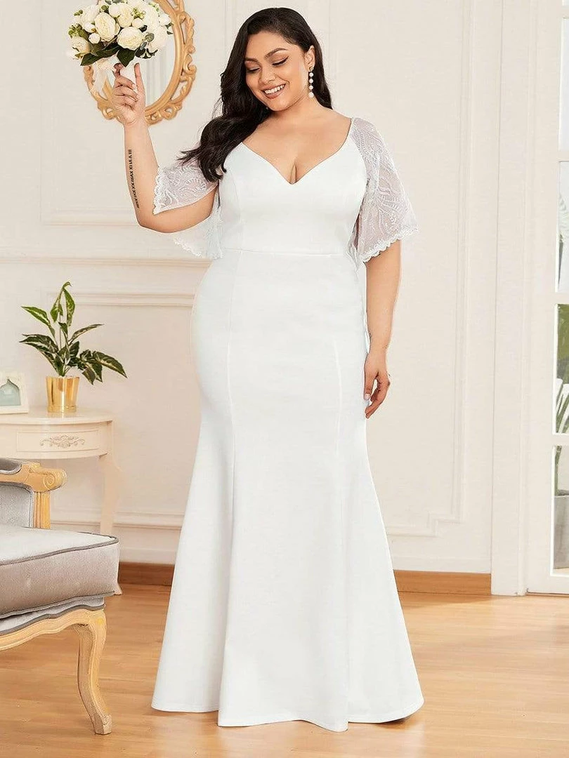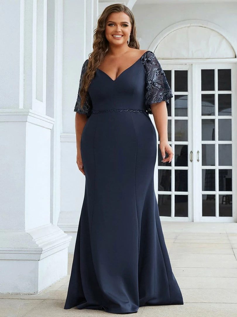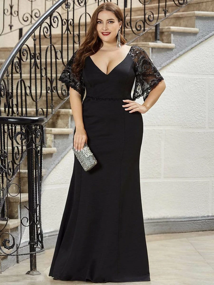 Trust me this sexy and elegant plus size evening dress would not only make you look beautiful, but it would also help to boost up your confidence level. This evening dress for curve is quite simple, but it would surely look so flattering on you. It features deep V-neck and short flare sleeves made of designed sequined net. A perfect choice for formal weddings and evening parties, cocktail, prom, homecoming, graduation, and any other formal affair! Learn more about how to choose plus size formal dresses and find right styles for your curvy body, Please read “Ultimate Guide to Plus Size Dresses“!