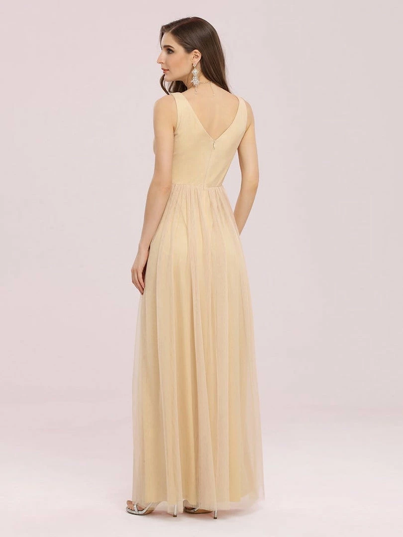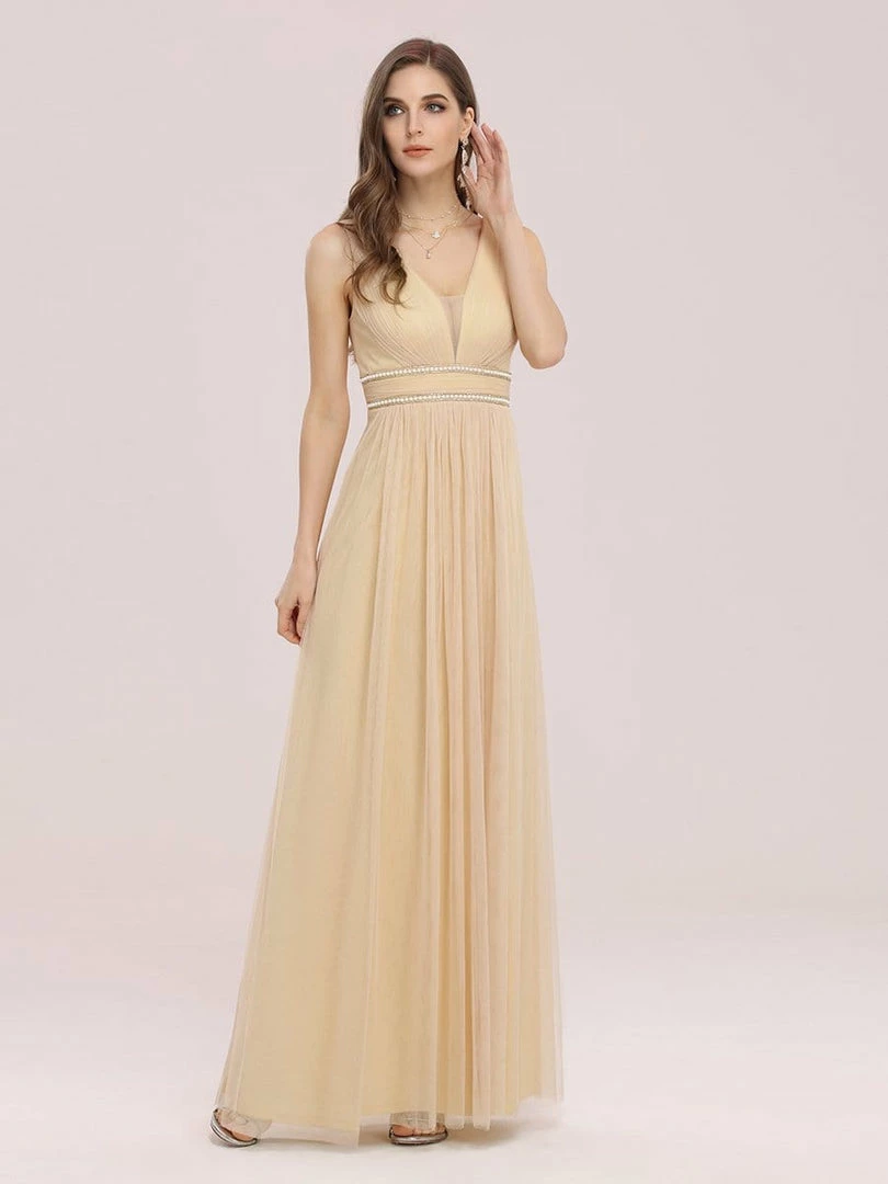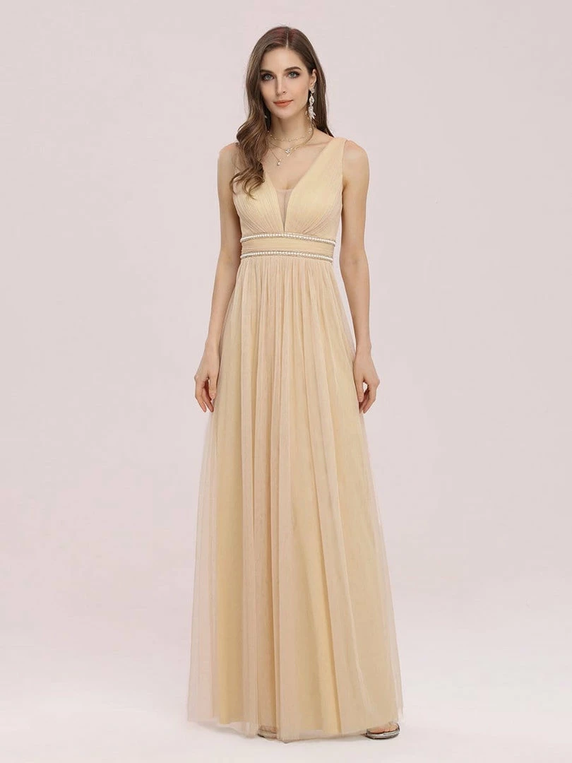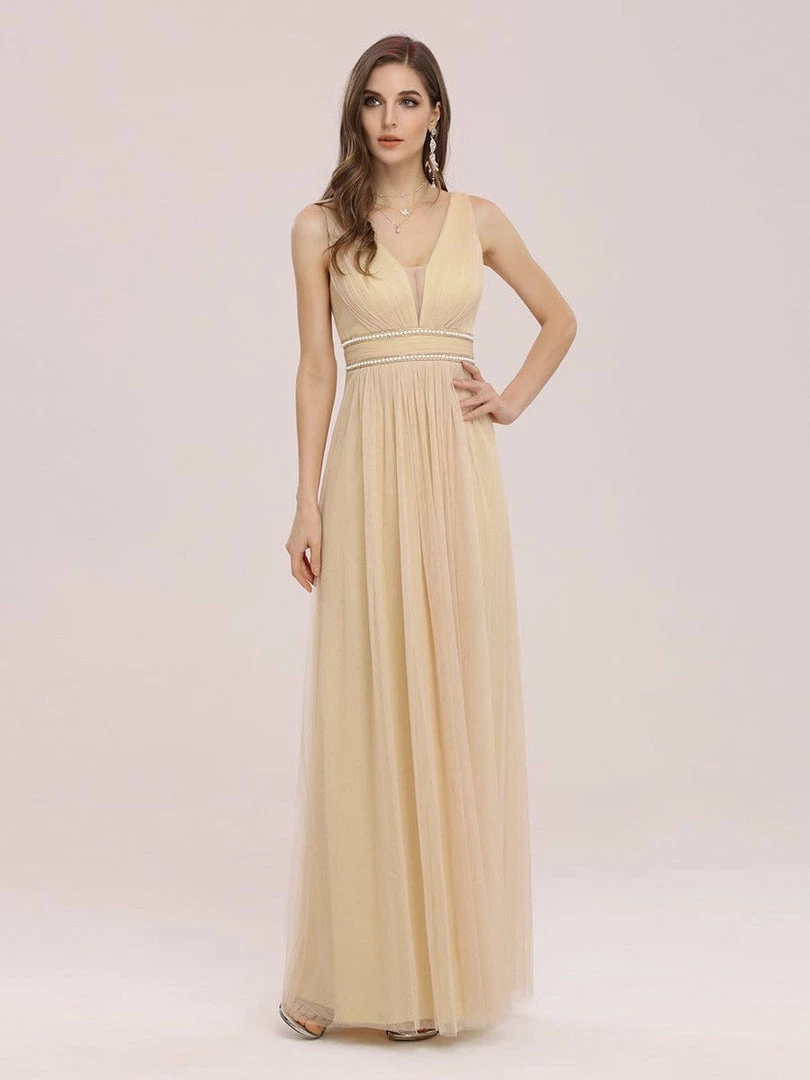 This beautiful tulle bridesmaid dress would be the best choice to wear at your friend’s wedding day. This beaded belt bridesmaid dress has a deep V-neck, A-line silhouette and is sleeveless. The pleated decoration and pearl waist belt will make the wearer look outstanding so buy it without thinking twice. We think this gorgeous maxi bridesmaid dress is perfect for all formal occasions, from evening party, cocktail, weddings to prom, homecoming and graduation!
