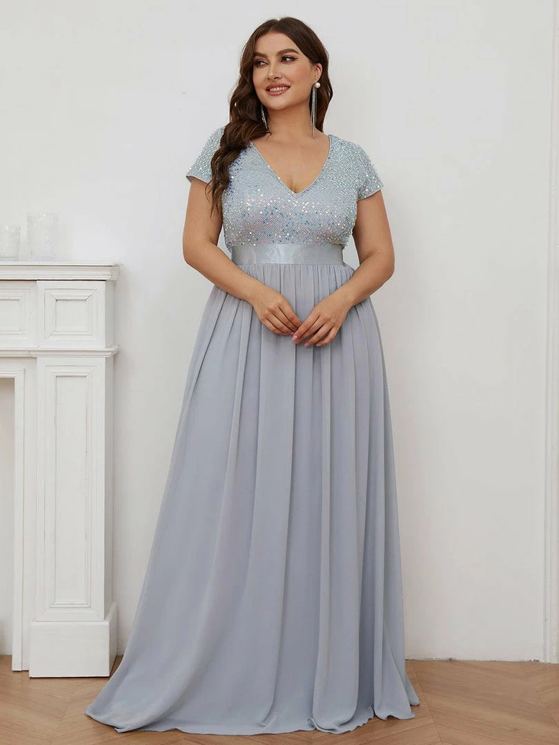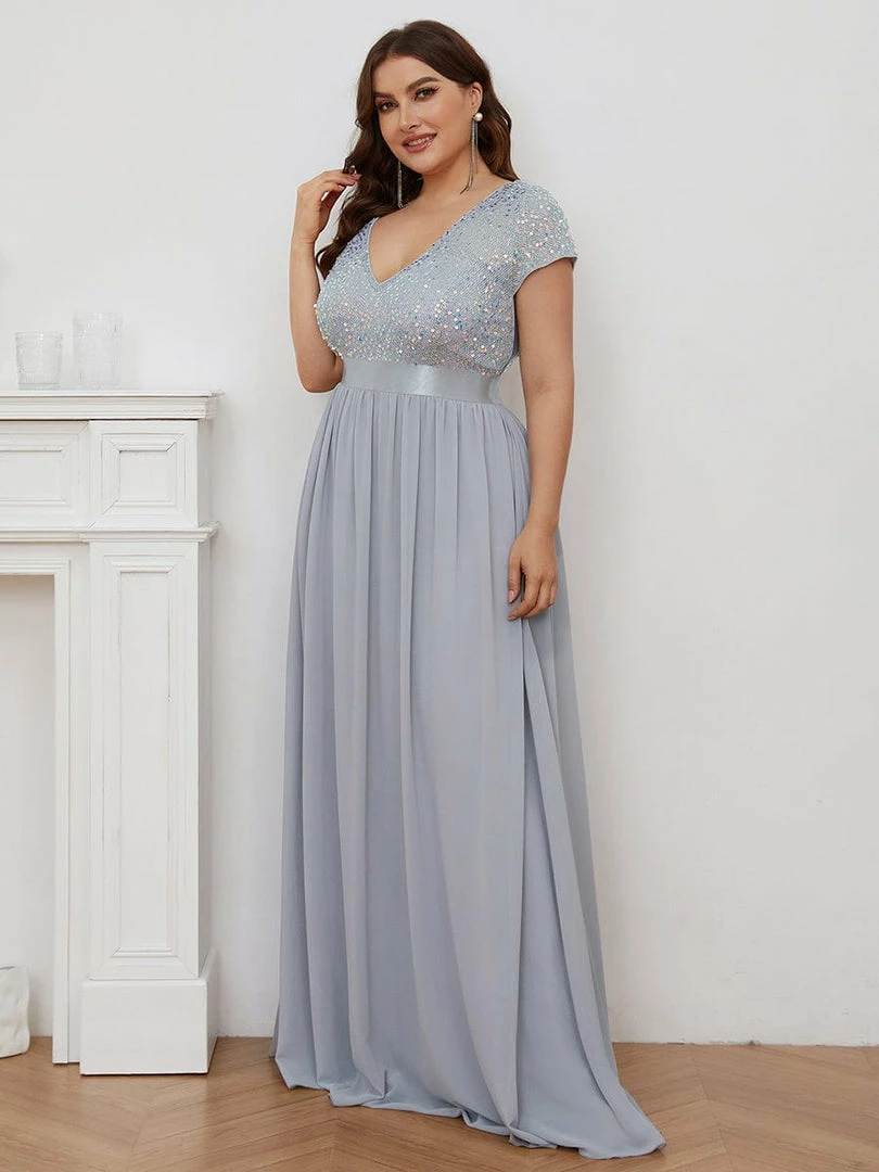 This stunning empire waist short sleeve evening dress features a beautiful ribbon in the middle and flowing floor-length chiffon layers, making this A-line evening dress the ultimate selection for any wedding, banquet, premiere, or formal event.