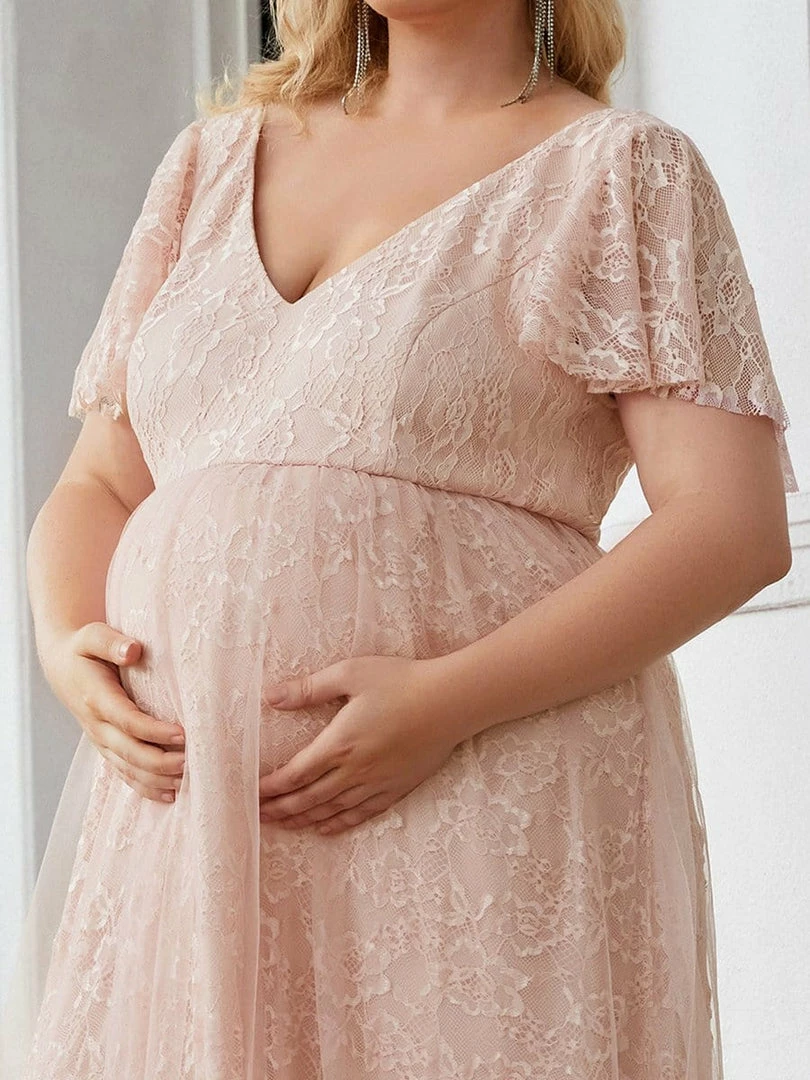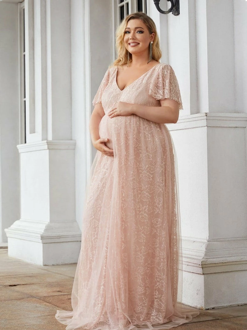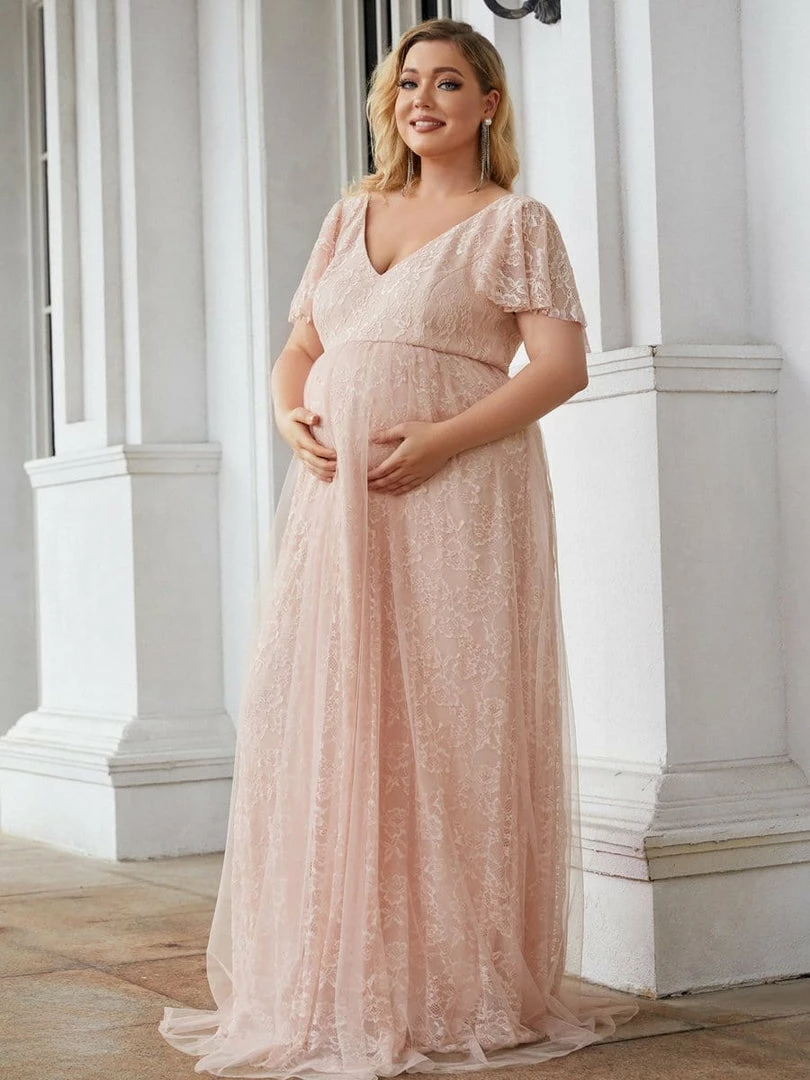 The elbow-length flutter sleeves provide just enough coverage for any weather on this gorgeous all-over lace floor-length plus size formal maternity dress. A v-neck, comfortable elastic waist, Â and A-line silhouette make this stunning double-layer plus size maternity dress fantastic for any formal function.