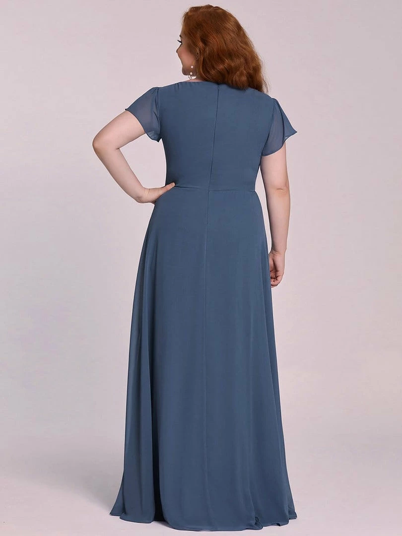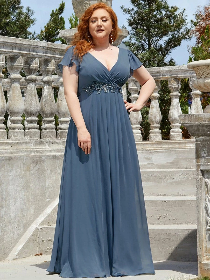 This beautiful V-neck plus size evening dress features a gorgeous sequin detailing in front, giving it a luxurious style perfect for any photo-worthy memories. Pleated material on this flowing floor-length A-line skirt gives this sophisticated evening dress an air of pure elegance, making it suitable for a wedding, concert, or other black-tie events.