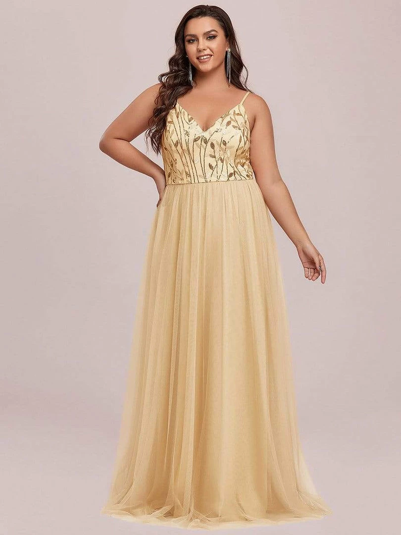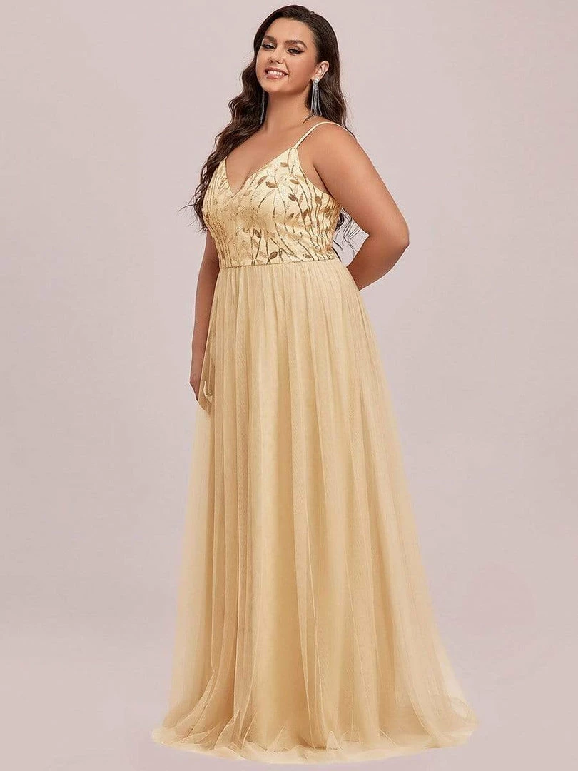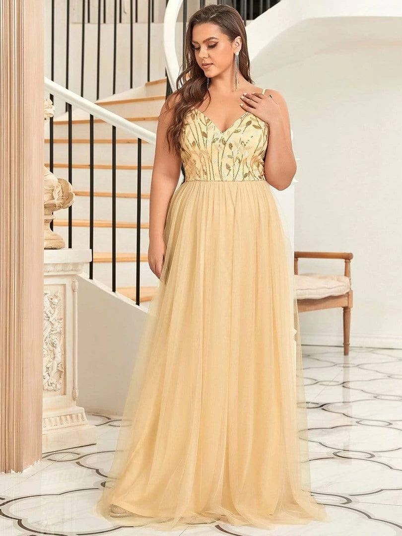 Elegant plus size evening long dress with v-neckline and flutter sleeves is perfect wear for any event. Hone this stunning gown to look fabulous at a wedding, graduation party, or prom. This classic v-neckline chiffon gown with a beaded belt is the best choice for you!