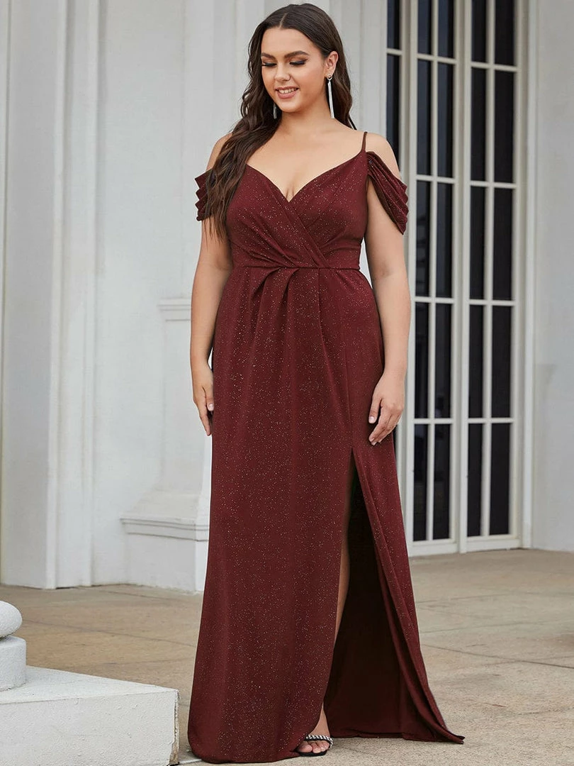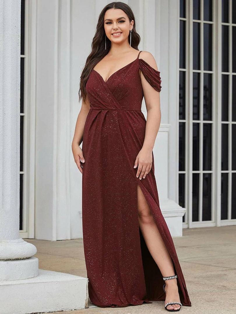 Make an elegant statement in style wearing this gorgeous cold shoulder floor-length plus size formal evening dress. This pretty elegant dress features a V-neck collar and a comfortable bodycon bodice that gives way to a beautiful floor-length skirt with a flirty slit in front.