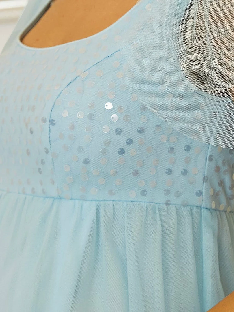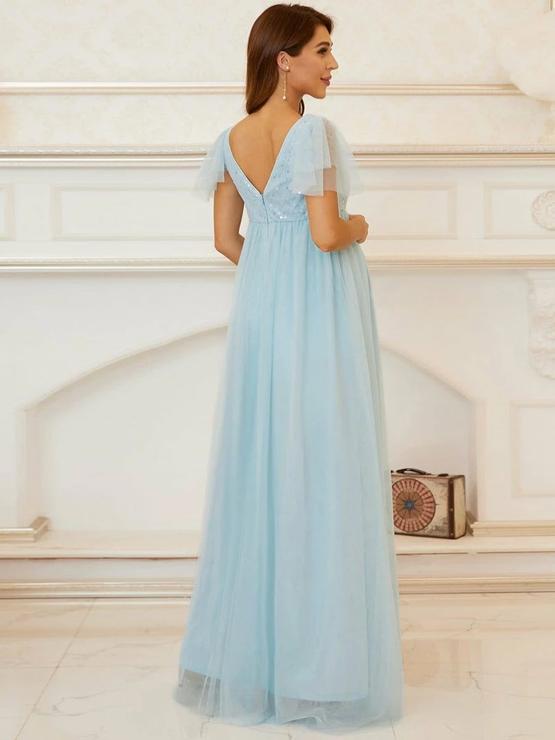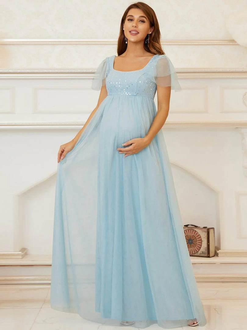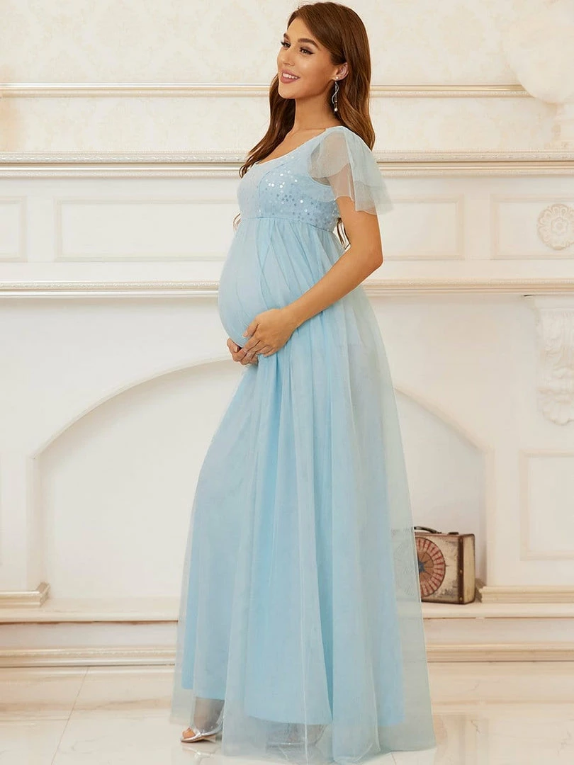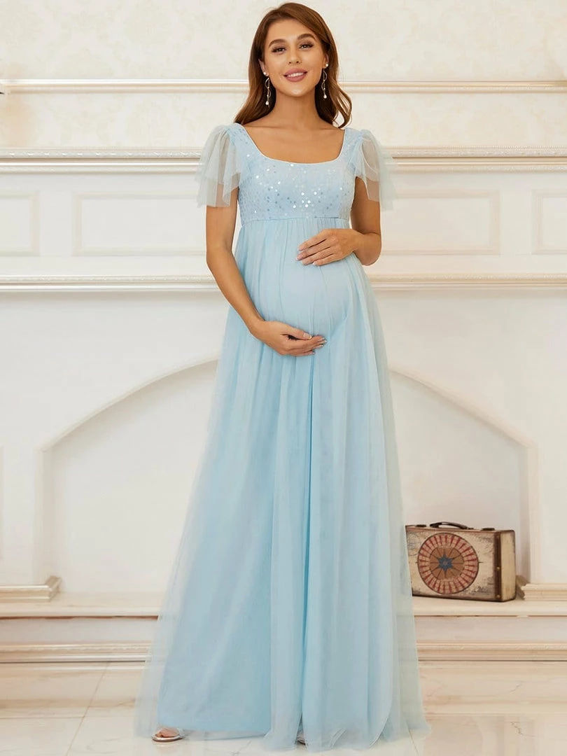 This effortlessly beautiful A-line maternity dress features shiny sequins on top, making it the perfect selection for a bridesmaid dress or any black-tie event. The flowing multi-layered floor-length silhouette, along with a comfortable elastic waist, showcases your growing baby bump in sophistication.