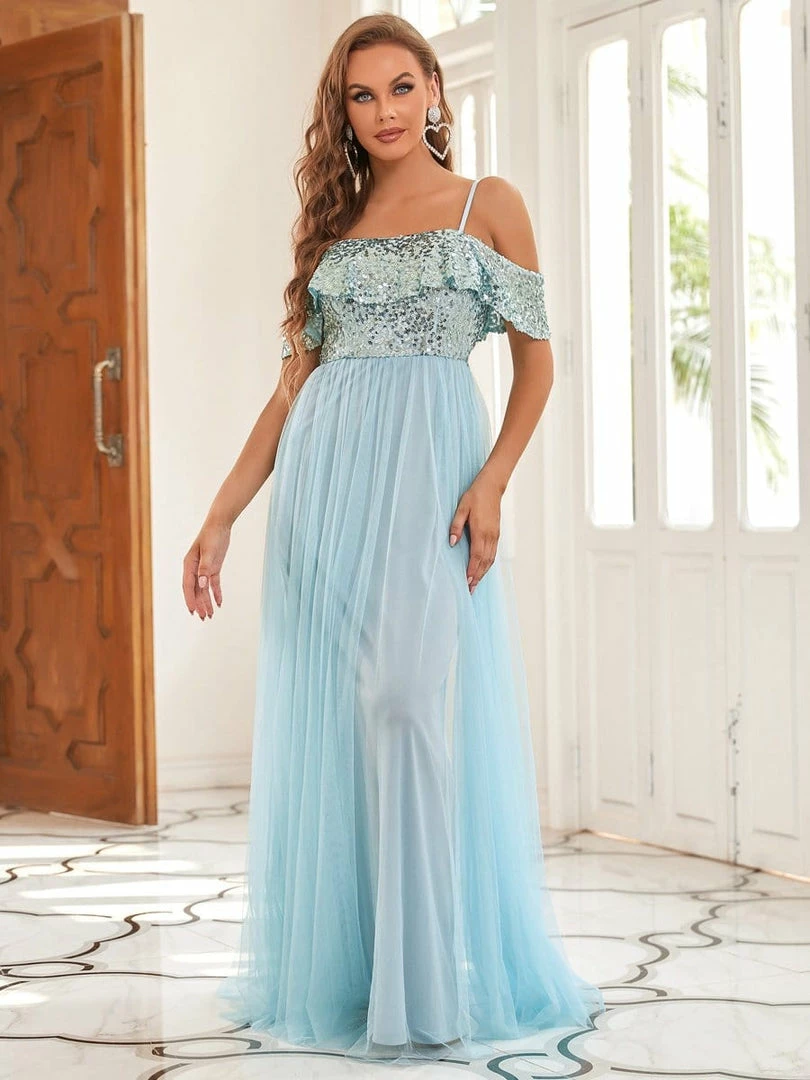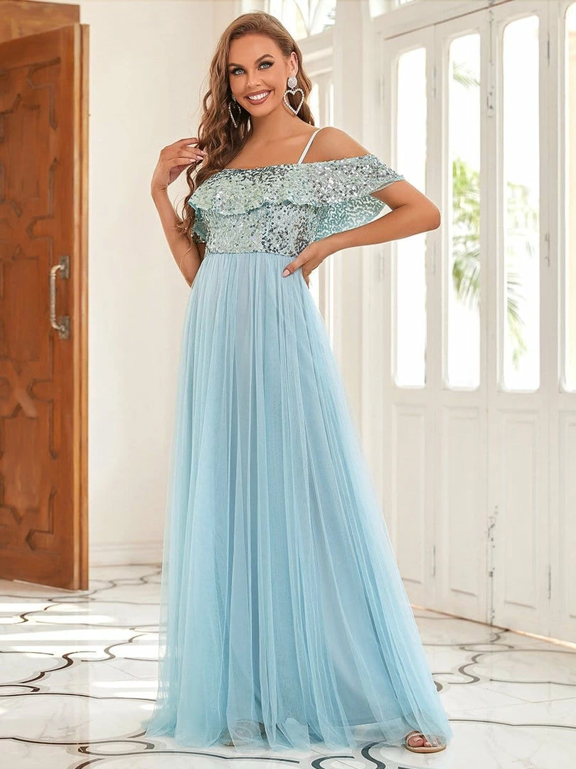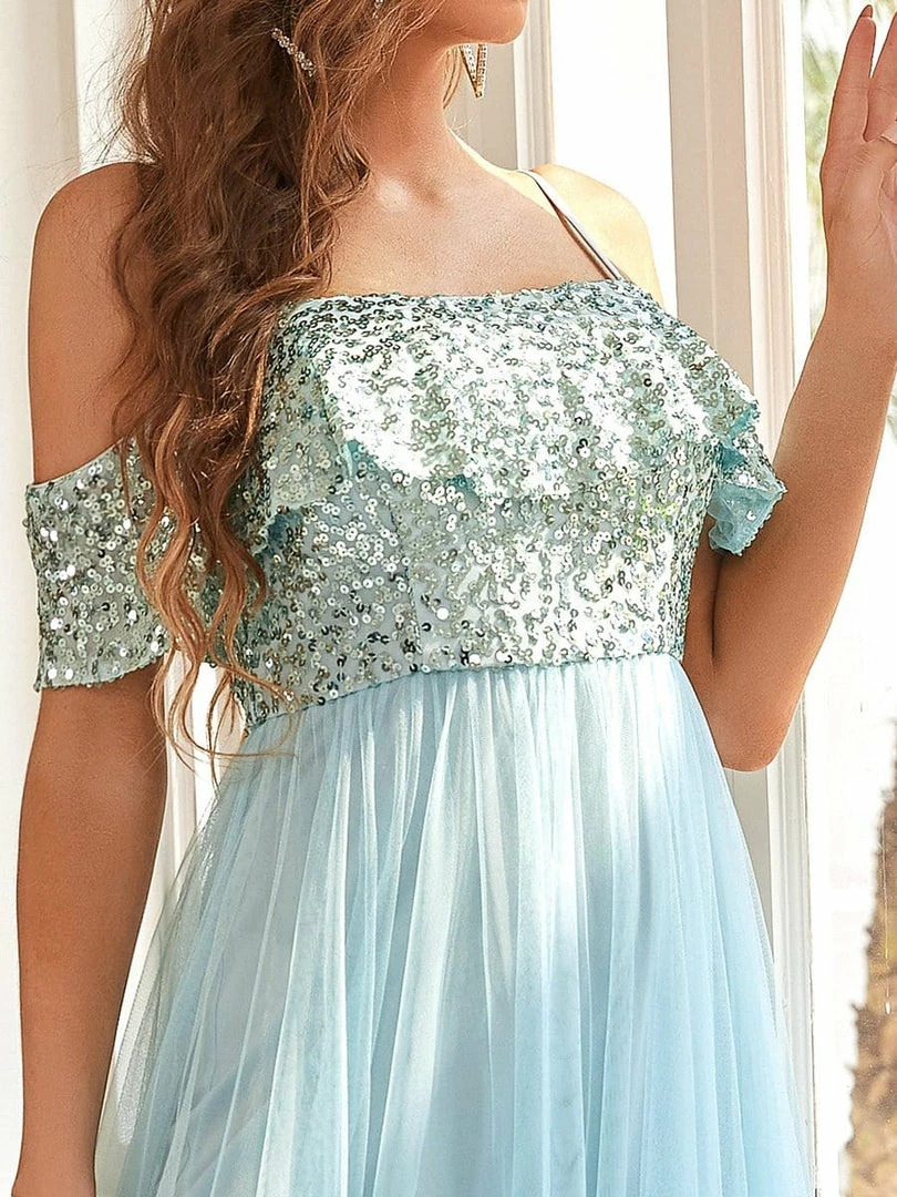 Sparkling sequins on top give this contemporary bridesmaid dress pure elegance complemented by a ruffled top and spaghetti straps. A cinched bodice and flowing multi-layered bottom provide the perfect balance for this princess-inspired bridal gown.