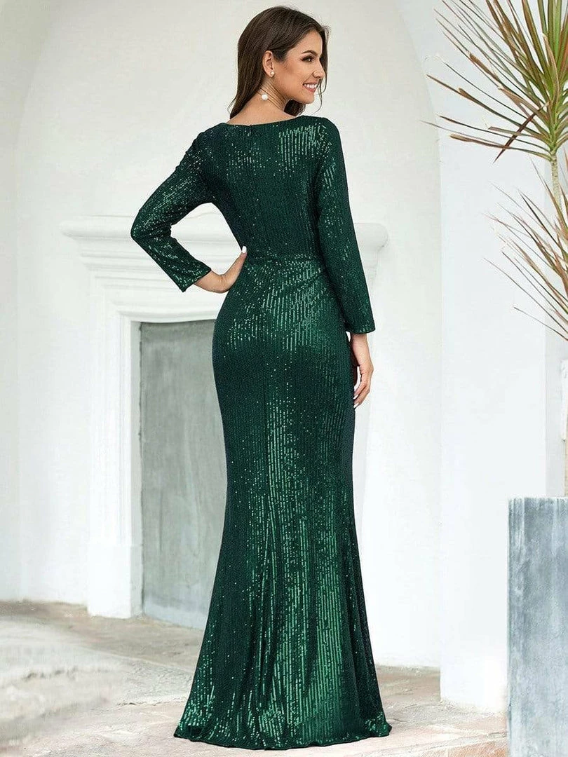 Featuring a deep V neckline,long sleeves,and thigh-high slit,this sexy long sleeves sequin evening dress is sure to make a statement no matter where you wear it. Perfect for all formal occasions,from evening party,cocktail,weddings to prom,homecoming,and graduation!