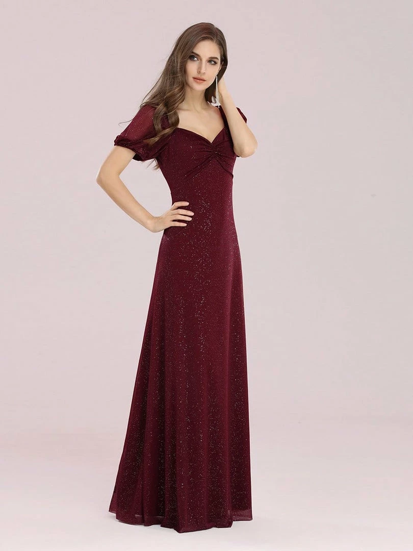 This adorable and dainty evening dress is made to make every woman jealous who aren’t wearing it. This classy dress features an A-line silhouette, sweetheart neckline and short sleeves. This dress is made of shimmery fabric and looks really gorgeous on everyone. Gold chunky jewelry also look great with this dress.