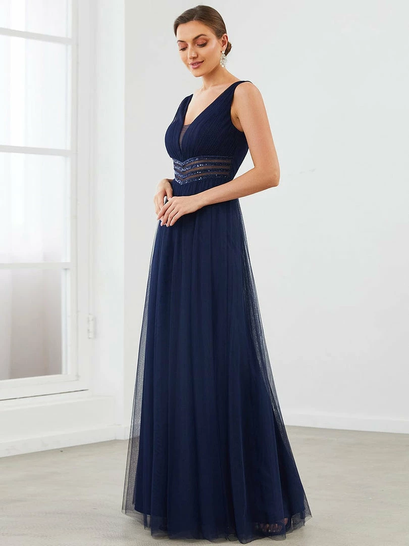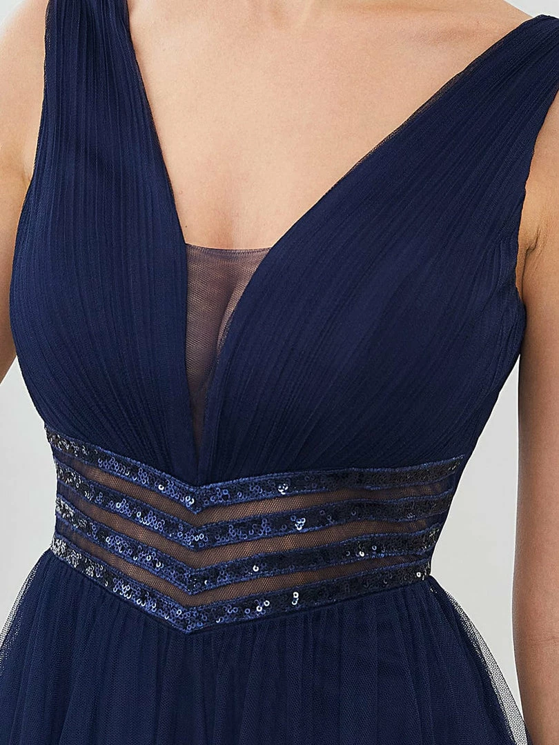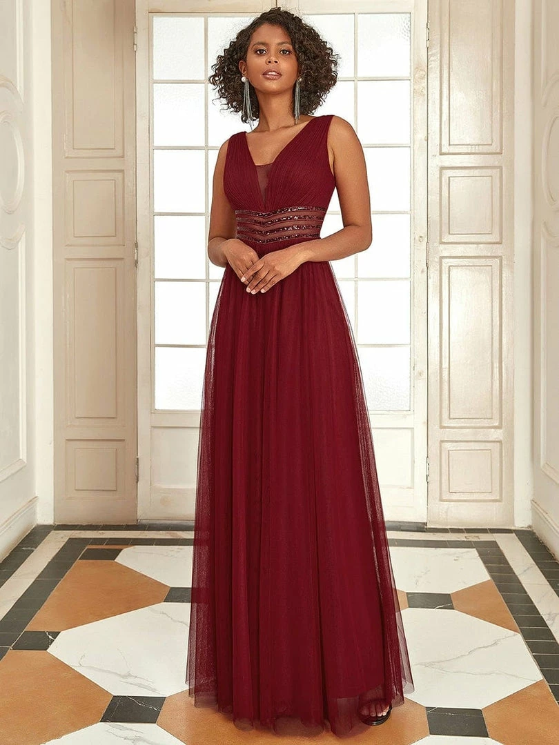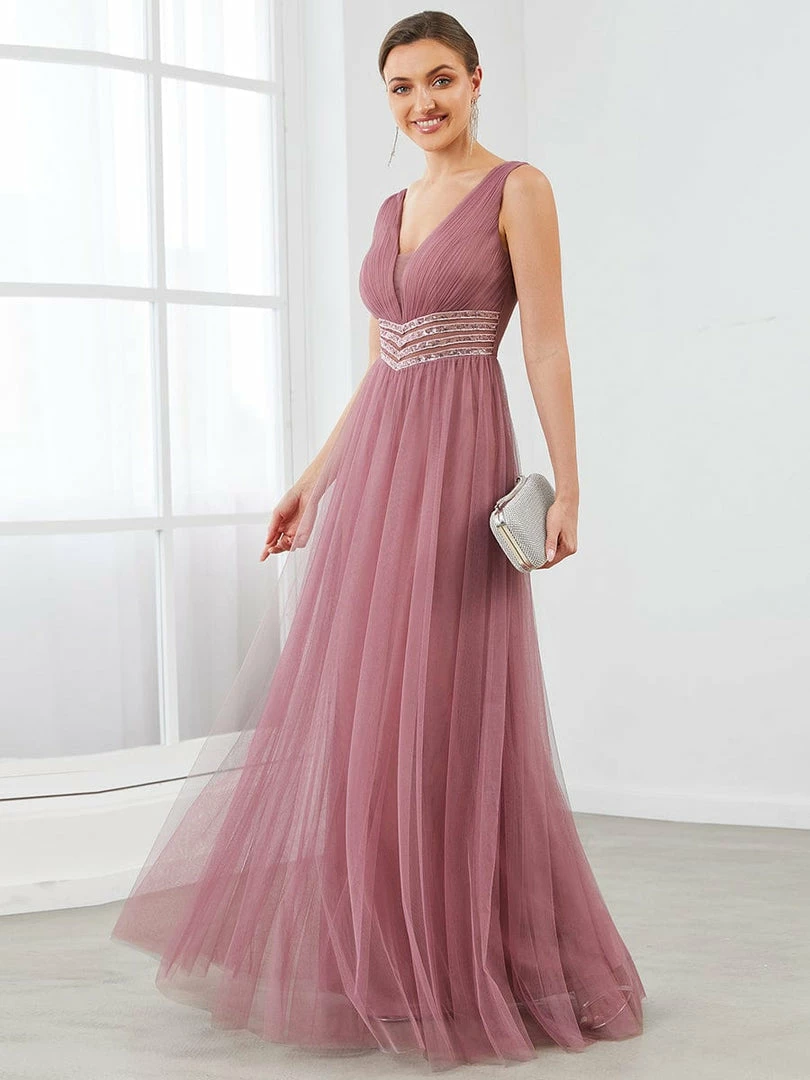Celebrate any formal occasion with this uniquely elegant empire waist evening dress, featuring layers of dreamy tulle and a gorgeous double v-shaped chevron sequin pattern with flattering pleats. The sleeveless fit and plunging v-neckline give it retro vibes with a touch of modernity, just right for your next formal event.