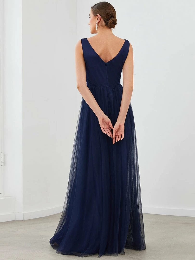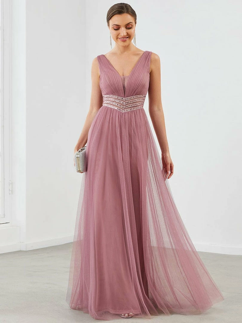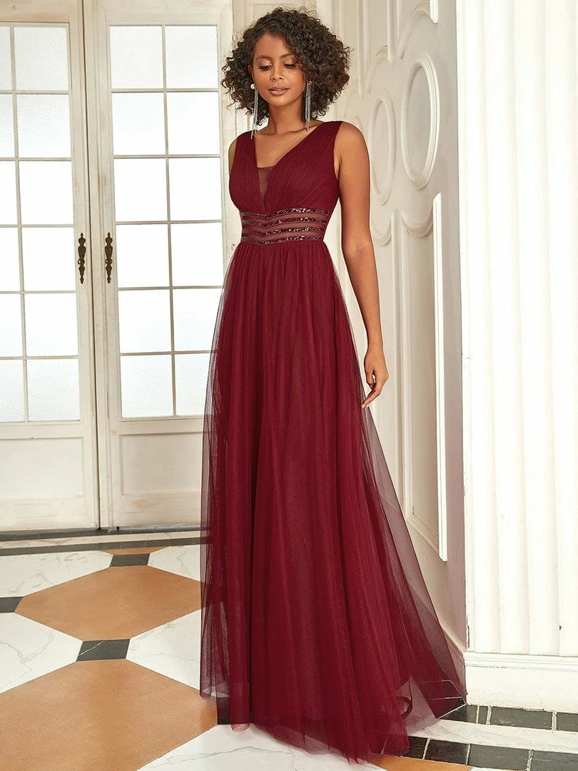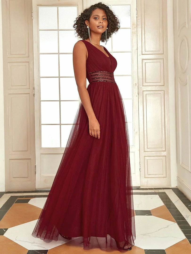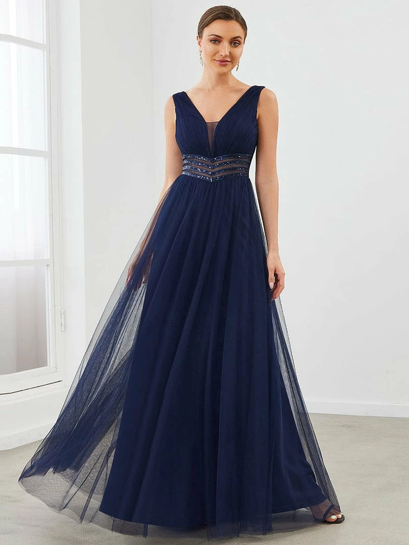 Celebrate any formal occasion with this uniquely elegant empire waist evening dress, featuring layers of dreamy tulle and a gorgeous double v-shaped chevron sequin pattern with flattering pleats. The sleeveless fit and plunging v-neckline give it retro vibes with a touch of modernity, just right for your next formal event.