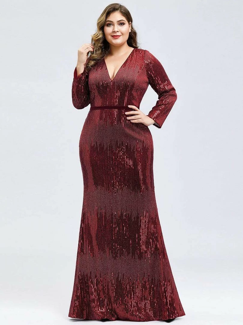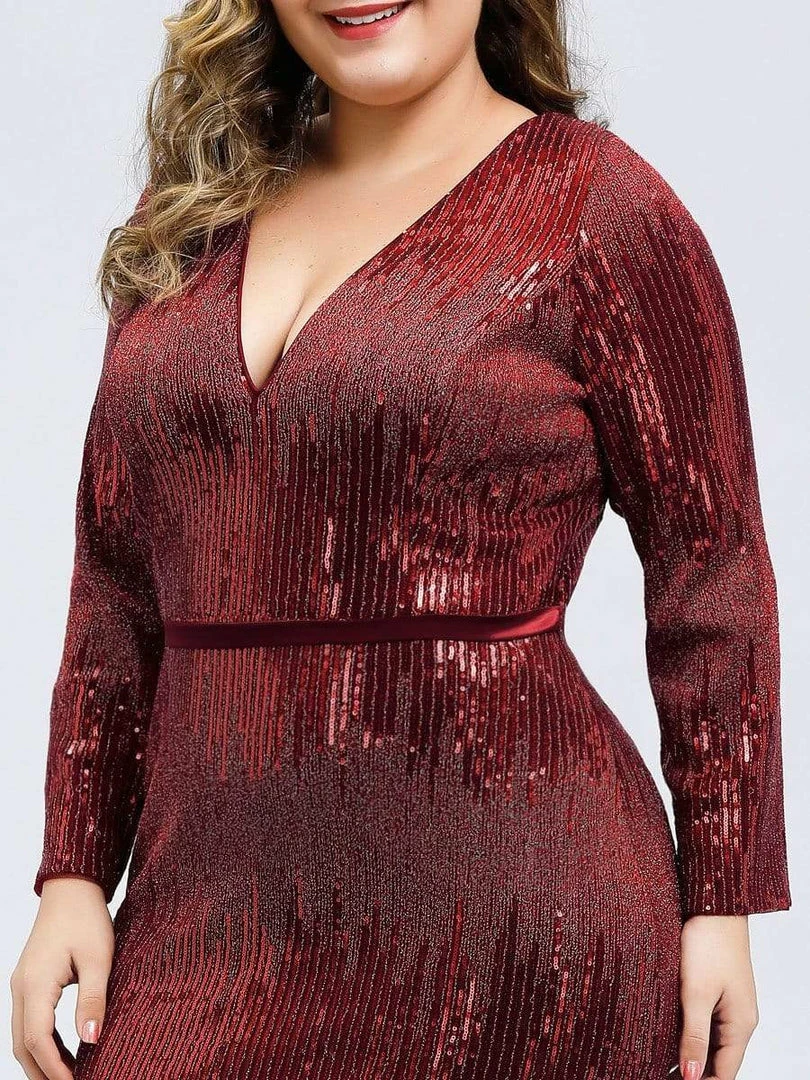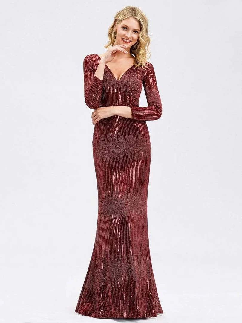 Featuring a deep V neckline, long sleeves and a fishtail skirt, this burgundy sequin dress is a perfect choice for dancing the night away! This gorgeous evening dress is perfect for evening party, cocktail, prom, homecoming, graduation, weddings, and any other formal affair!