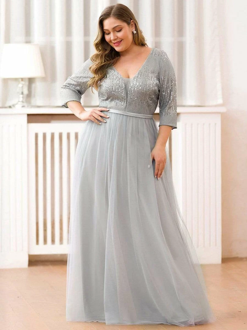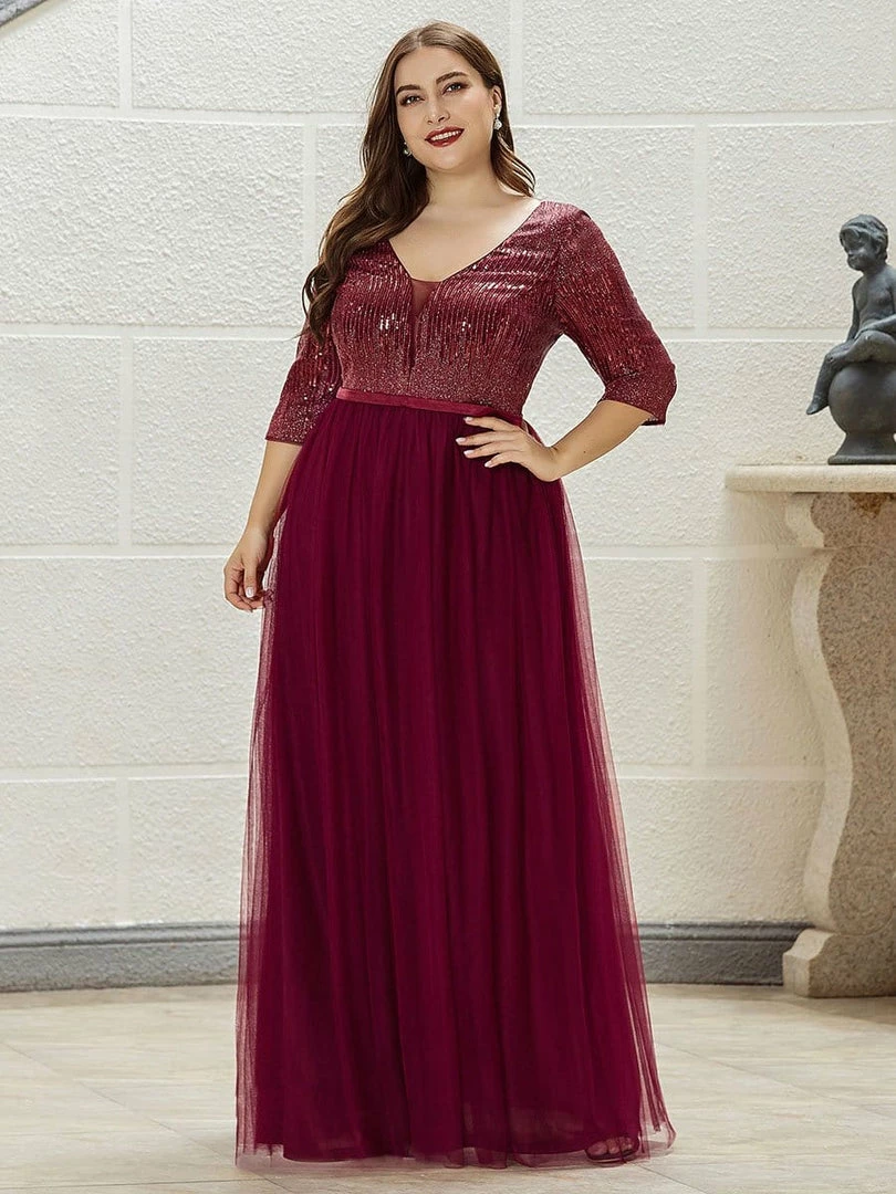 Mixed materials are a hot trend and what better combination then sequins and tulle! This plus size evening dress features a deep V neckline, half sleeves, a belt design, a flowy tulle skirt and a sequins top. Perfect for evening party, cocktail, prom, homecoming, graduation, weddings!