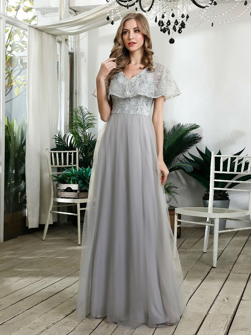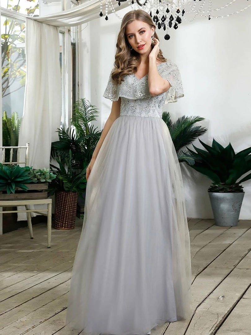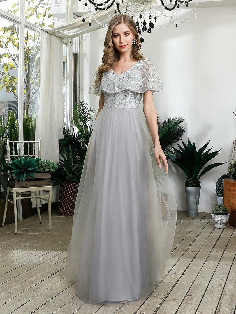 Featuring a sexy deep V neckline and delicate ruffle lace sleeves, this gorgeous prom dress is a perfect choice for people who are looking for something elegant and romantic. The flowy A-line tulle skirt makes it friendly to most body types. We think this stunning evening dress is perfect for evening party, cocktail, prom, homecoming, graduation, weddings, and any other formal affair!