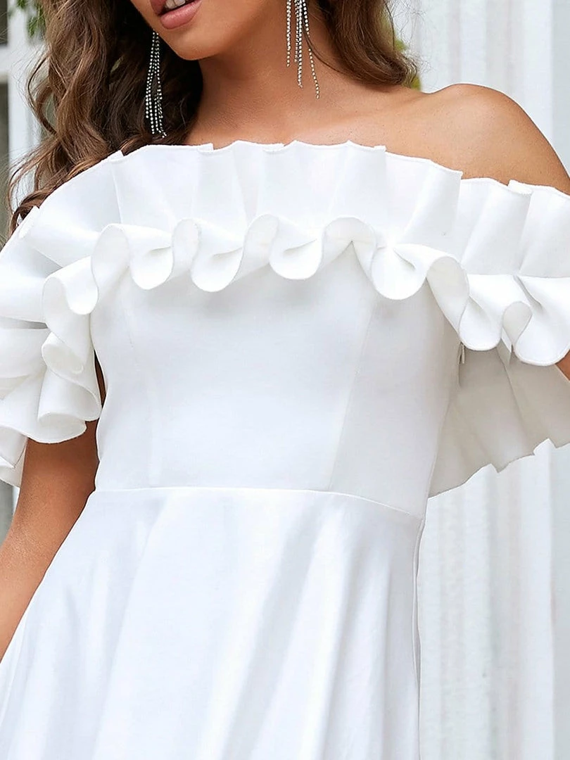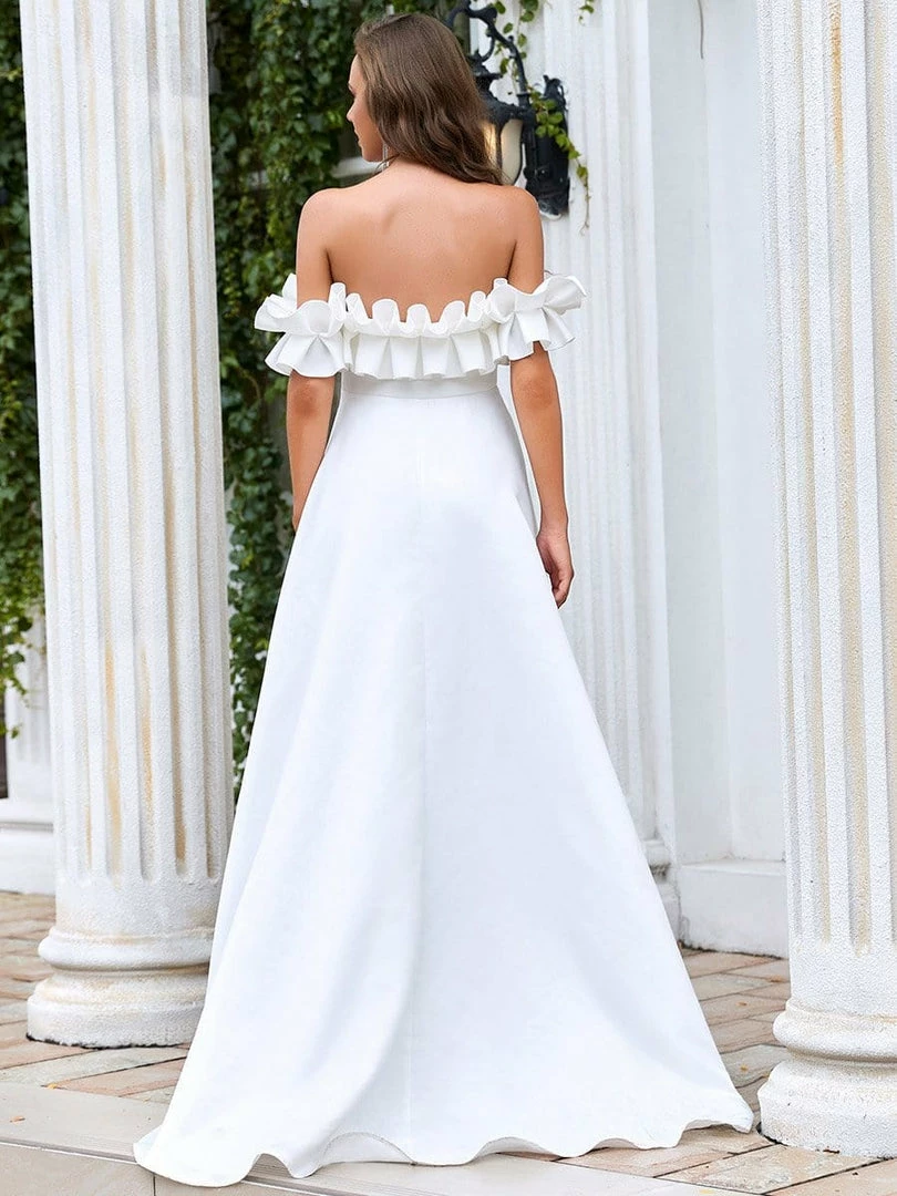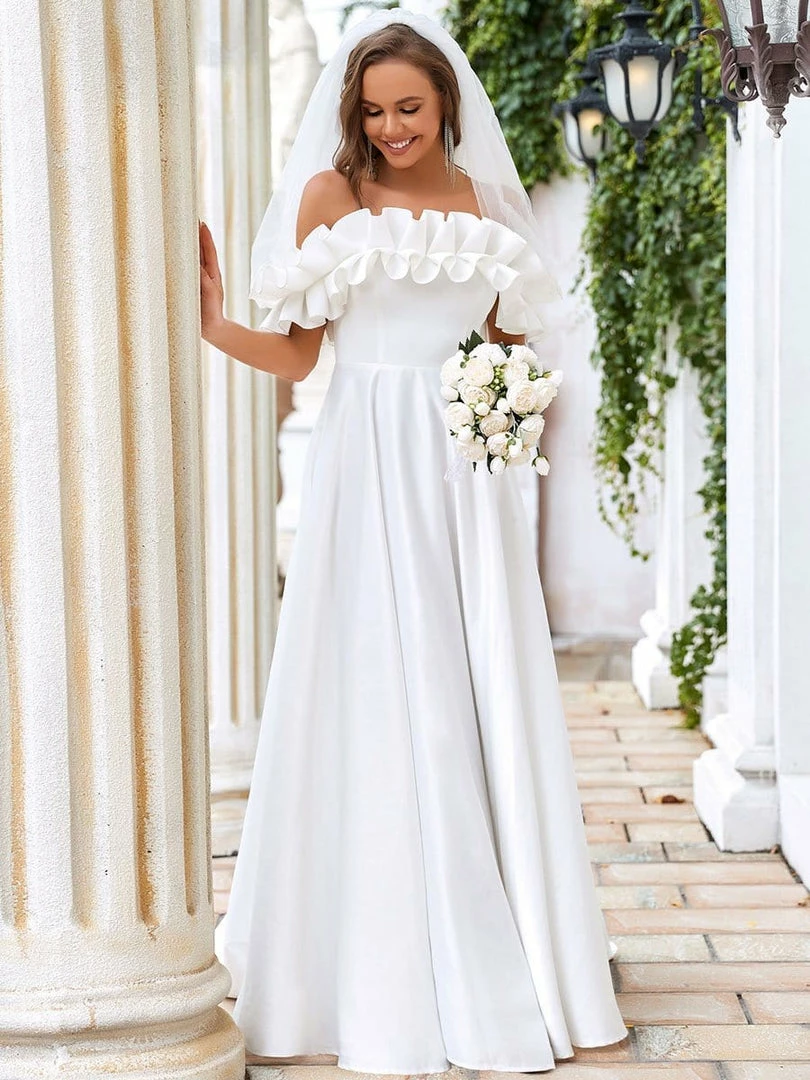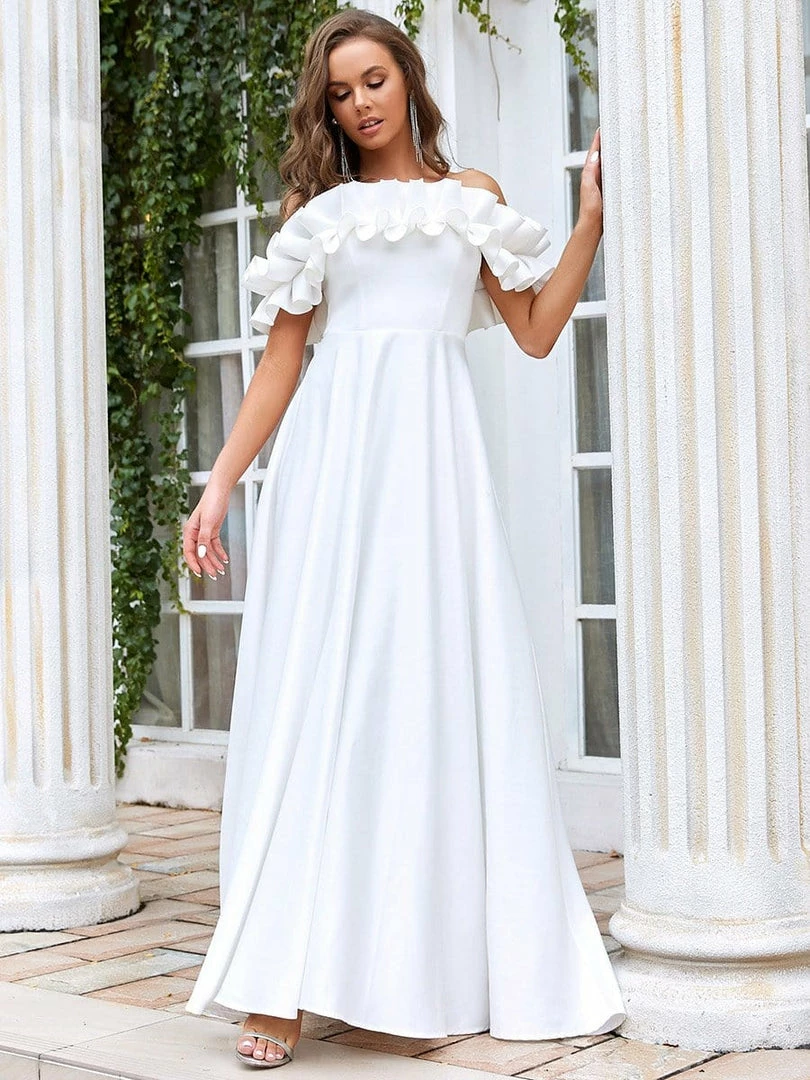 Make a glamorous entrance on your special day wearing this sleeveless A-line wedding dress. The gorgeous double ruffle top and cinched waist accentuate the silhouette and flatter any figure. The floor-length flowing skirt makes this wedding dress elegant and sophisticated.