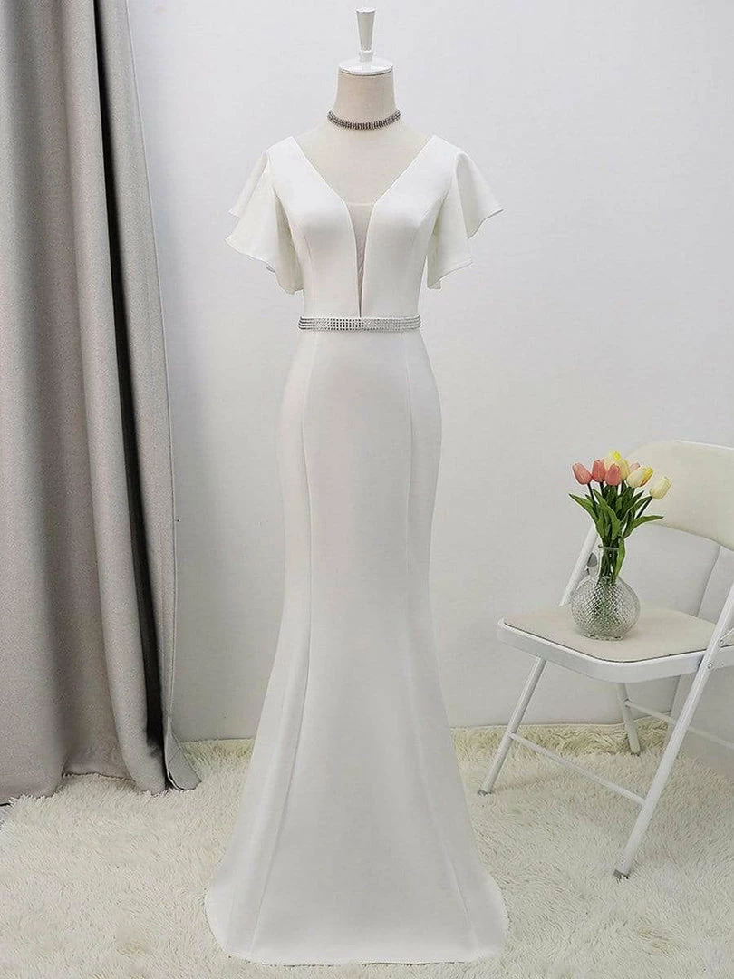 If you’re looking for a modern silhouette, this figure-hugging simple mermaid corset wedding dress is the perfect choice. With unique features like flutter sleeves, a deep V neck, and a rhinestone band to accentuate your waist, you will feel like the most beautiful woman in the world as you walk down the aisle.
