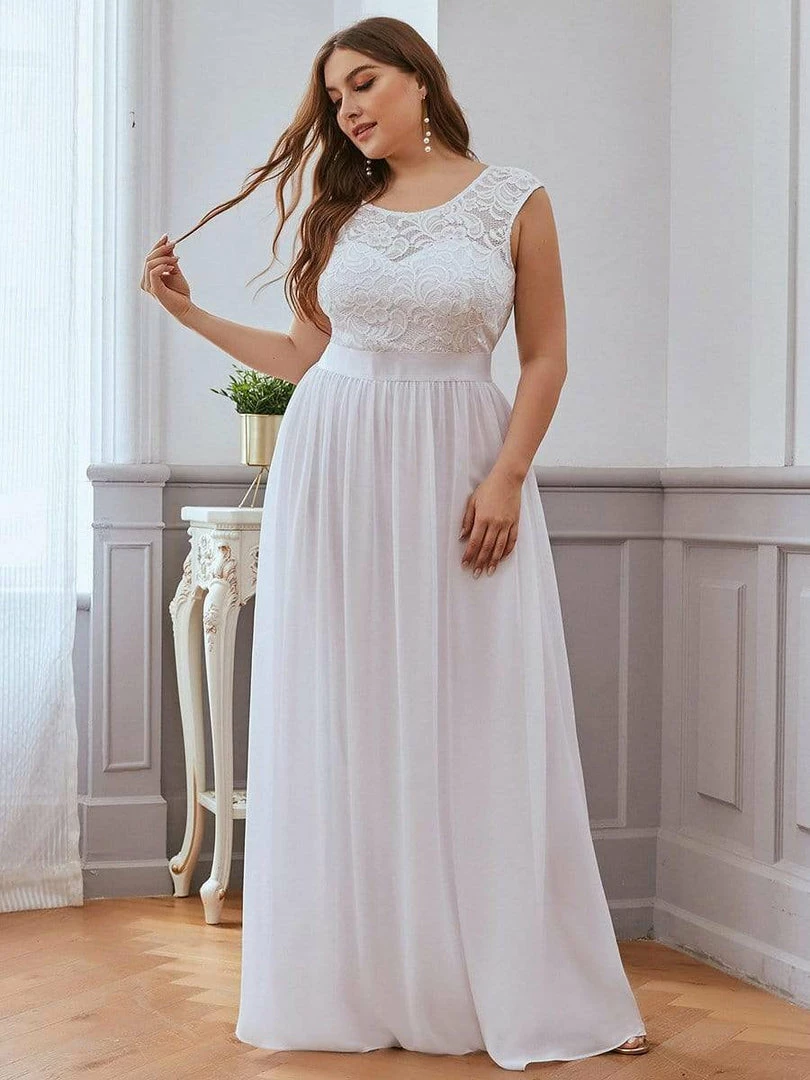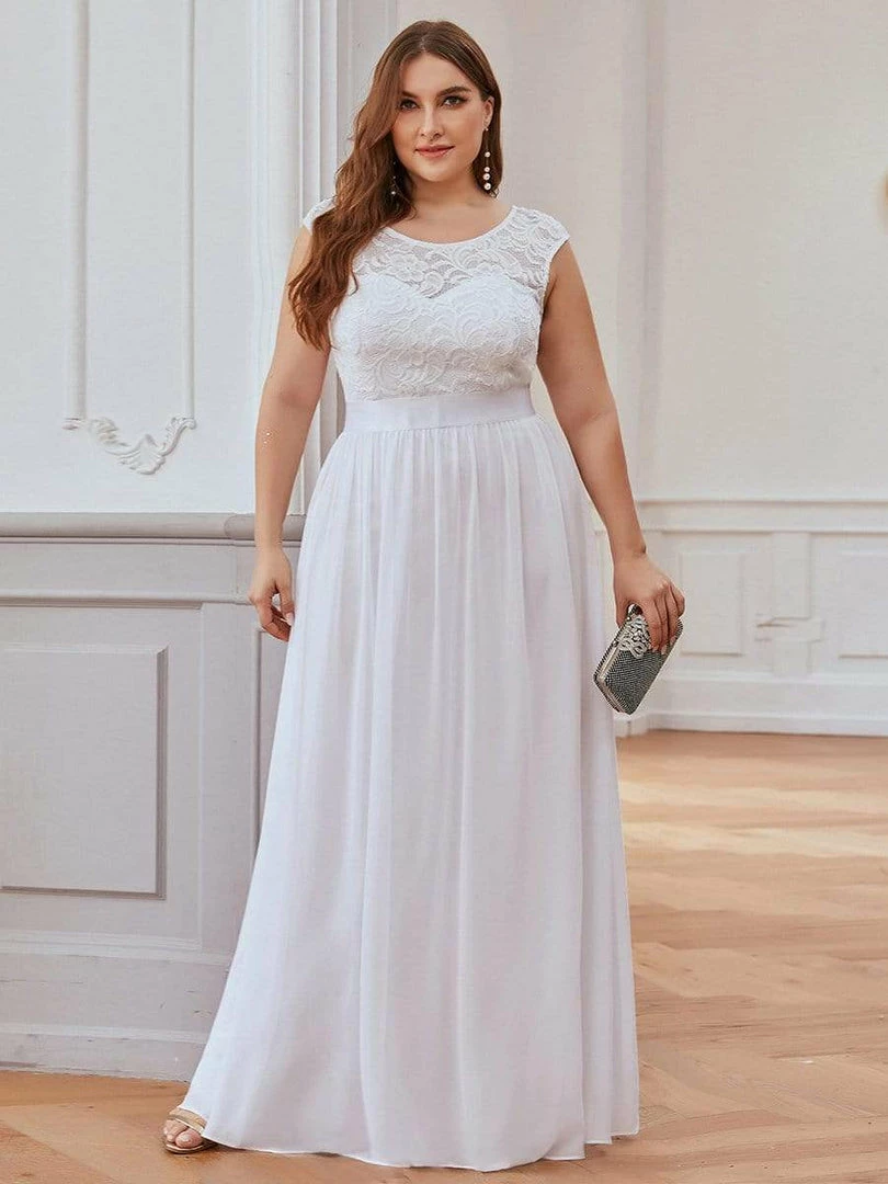 The classic round neckline and delicate floral lace bust add timeless glamour to this plus size casual wedding dress for curvy figures, a deceptively simple design, this simple plus wedding dress is classic and elegant, you will never have to worry about it going out of style. This gorgeous plus size bridal dress is perfect for summer weddings, especially for elopement weddings and beach weddings. Learn more about how to choose plus size formal dresses and find right styles for your curvy body, Please read “Ultimate Guide to Plus Size Dresses“!