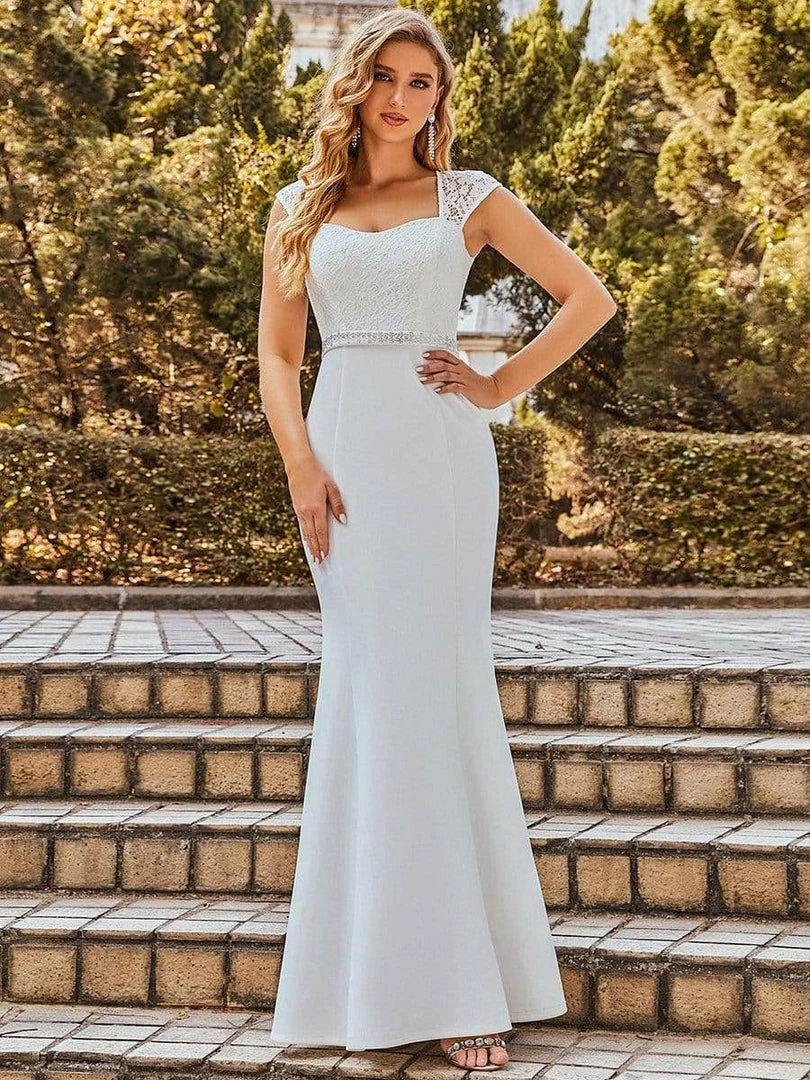 Be ready for the aisle with this sweetheart mermaid simple wedding dress on your big day. This simple wedding dress is a fit and flare bodycon style fishtail wedding dress. The Beaded embroidered lace decorates the short sleeves and bodice to create an elegant look. The skirt of this cap sleeves wedding dress is of floor length. With elegant v neckline and lace covered back, this simple wedding dress creates a modest look. Wear it on your big day and make an unforgettable memories now!