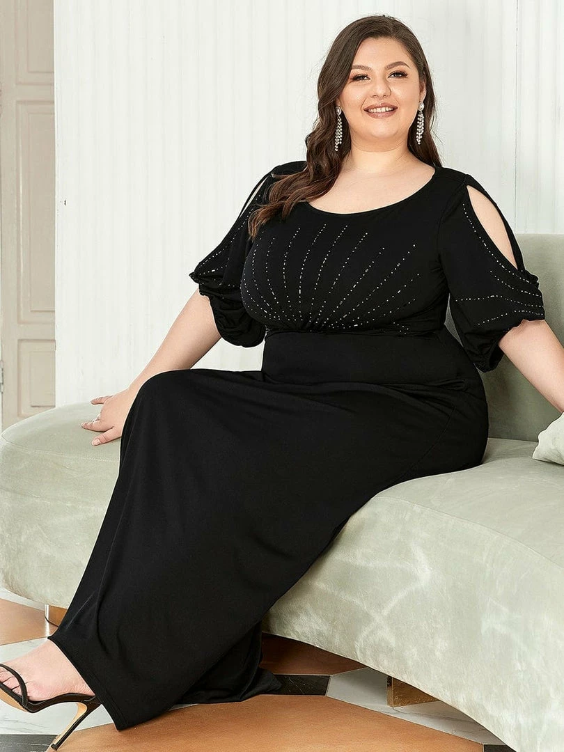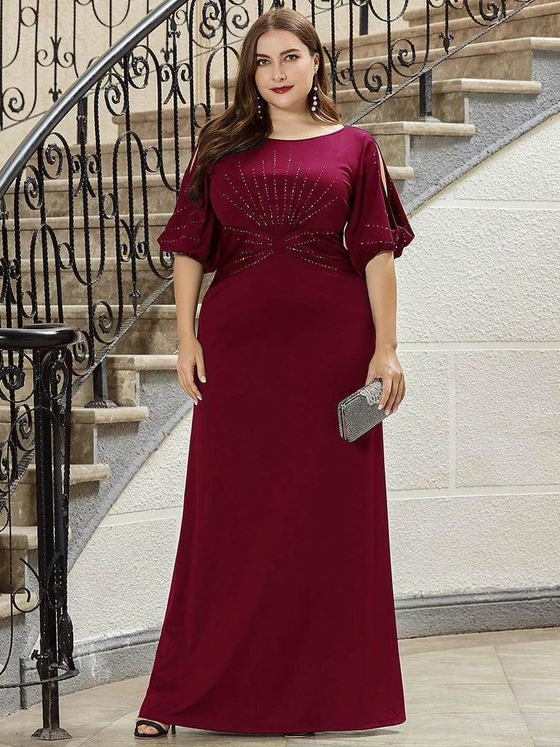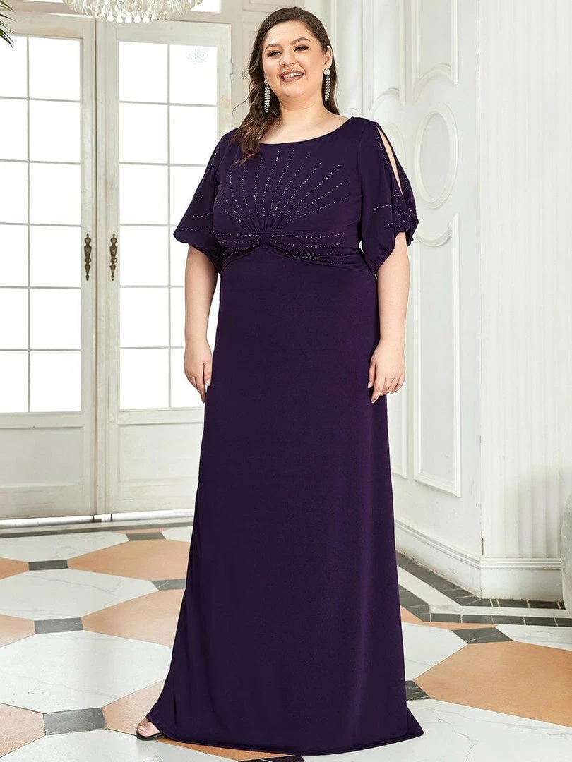 Want to look like a model? If yes, then buy this plus size pretty formal evening dress. It features an A-line silhouette, round neck and half sleeves. The silver hot drill decoration on the dress make it look elegant and classy. This gorgeous long formal dress can easily be paired with silver accessory and you will definitely make all head turns. We think this gorgeous formal dress is perfect for all formal occasions, from evening party, cocktail, weddings to prom, homecoming, and graduation!