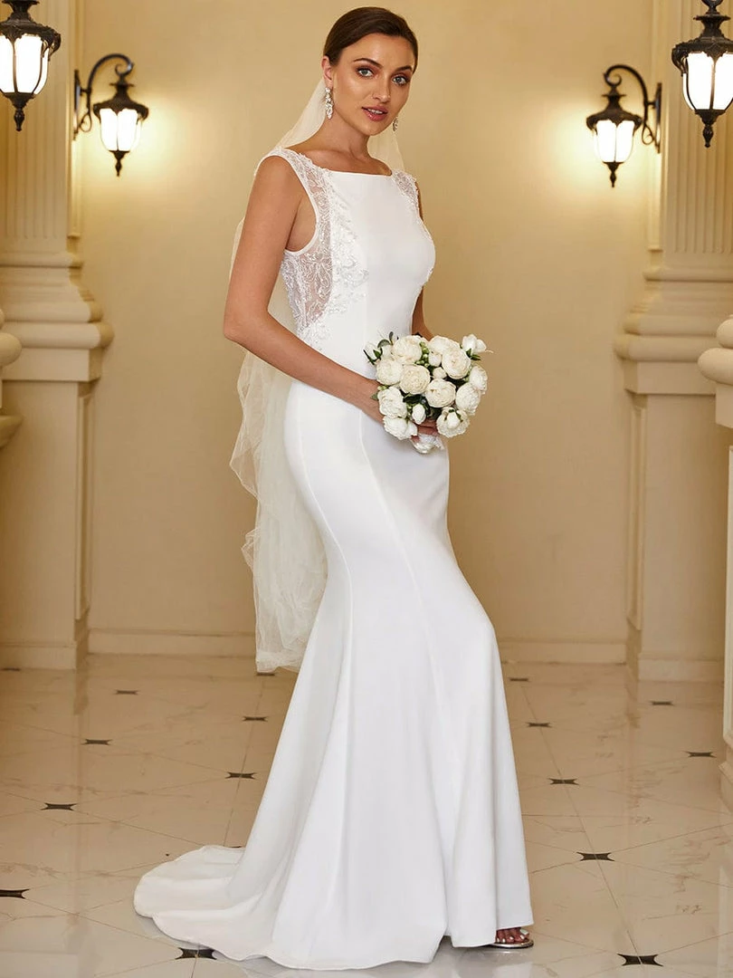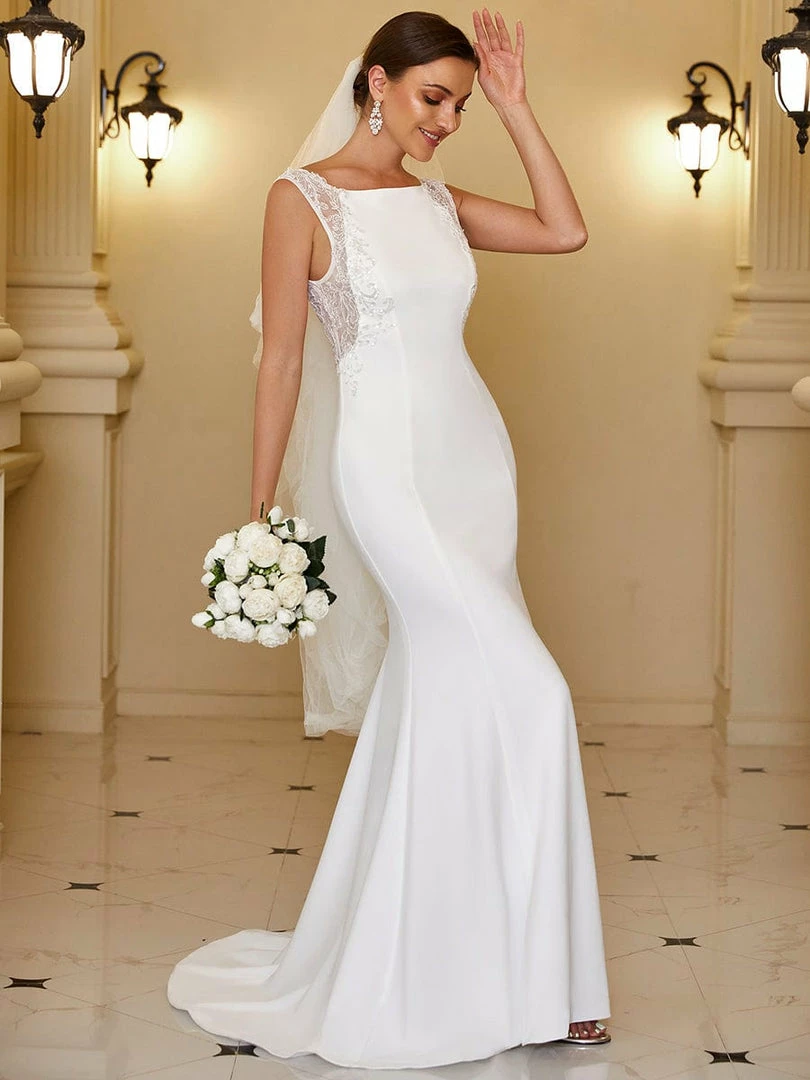 This sophisticated wedding dress features a flowing bodycon fishtail silhouette. A high square neckline, floral lace sleeveless fit, and plunging v-back provide the perfect balance of glamor that meets classic style. Celebrate your special moment in refined elegance, perfect for any wedding theme.
