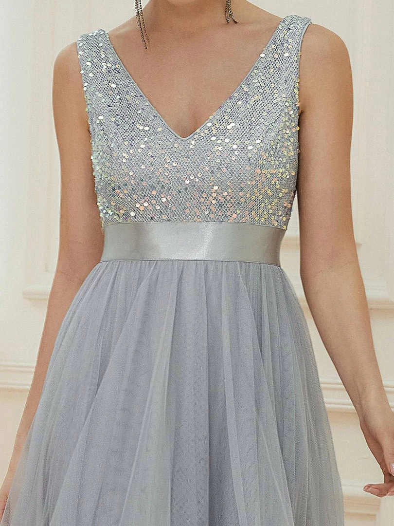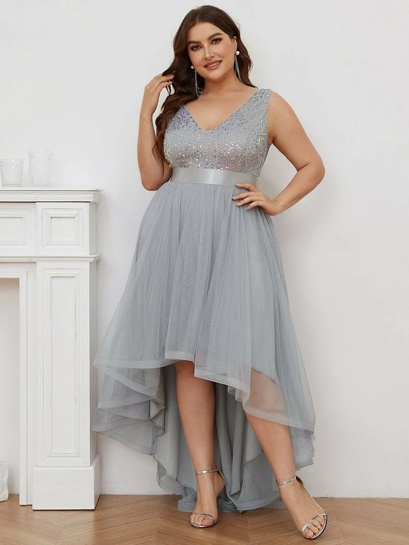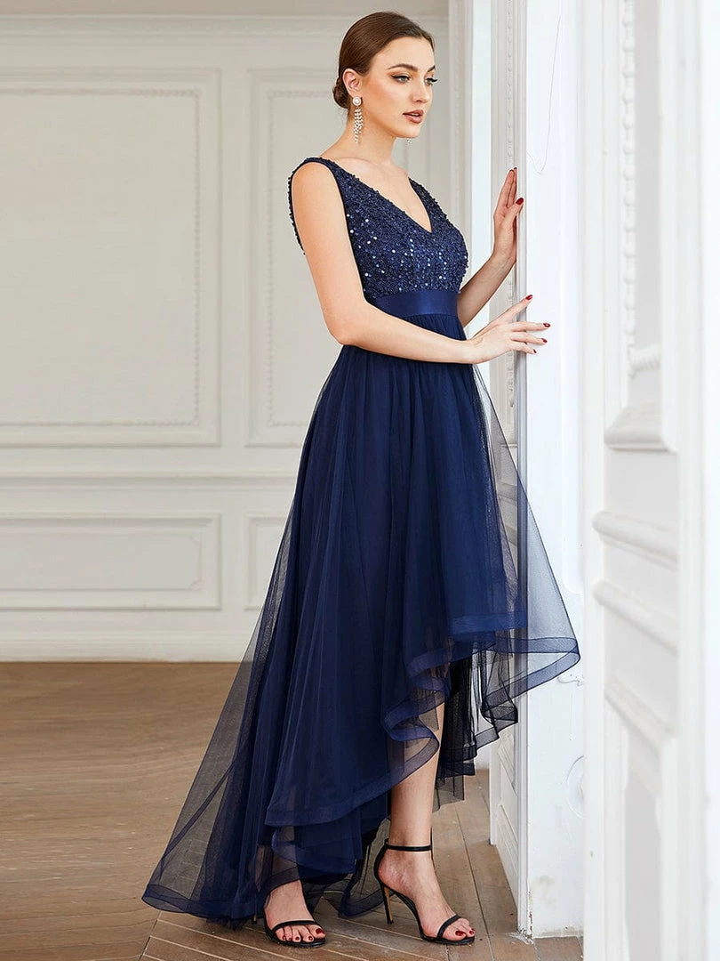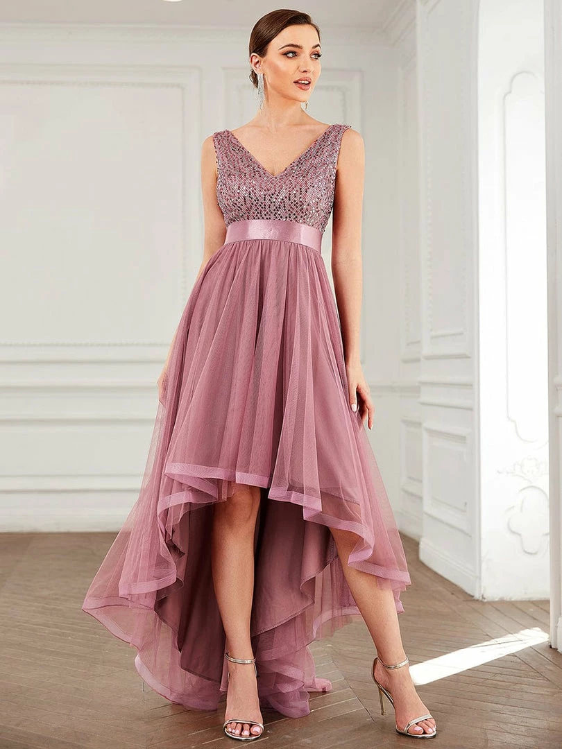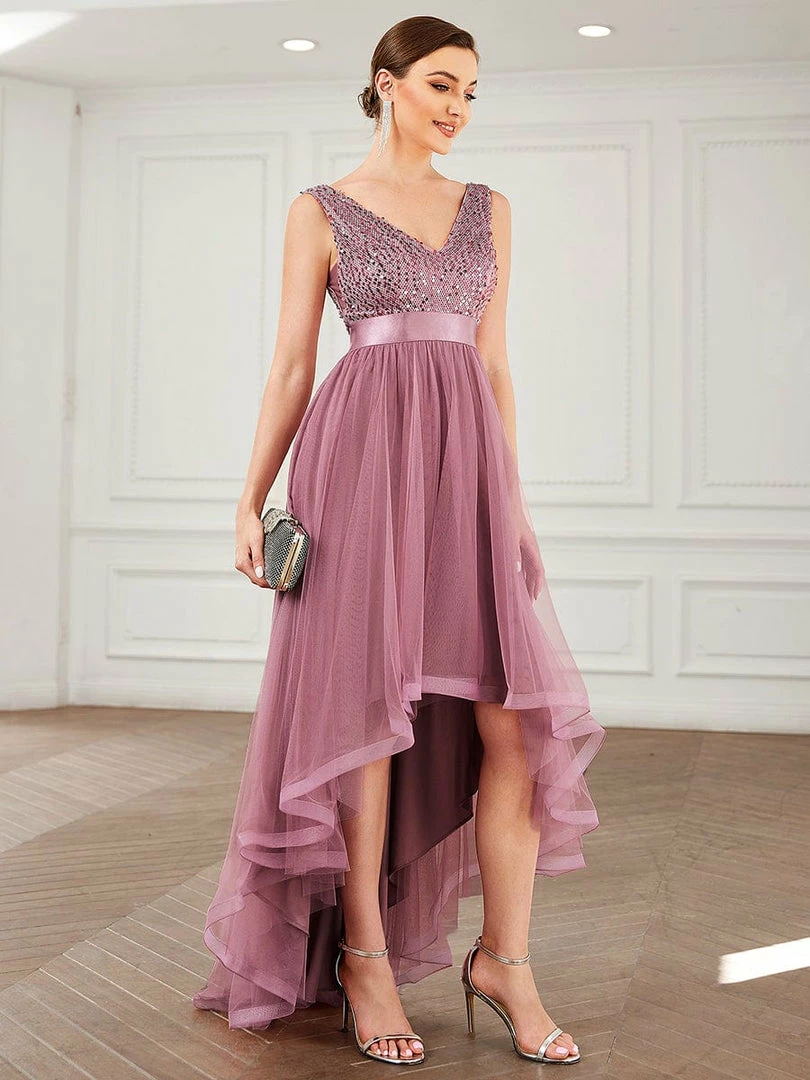 Make a sophisticated statement wearing this gorgeous high low evening dress featuring a sparkling sequin sleeveless top, ribbon cinched waist, and gorgeous layers of tulle. The asymmetrical high low hem showcases your favorite heels, pulling the look together in grace.