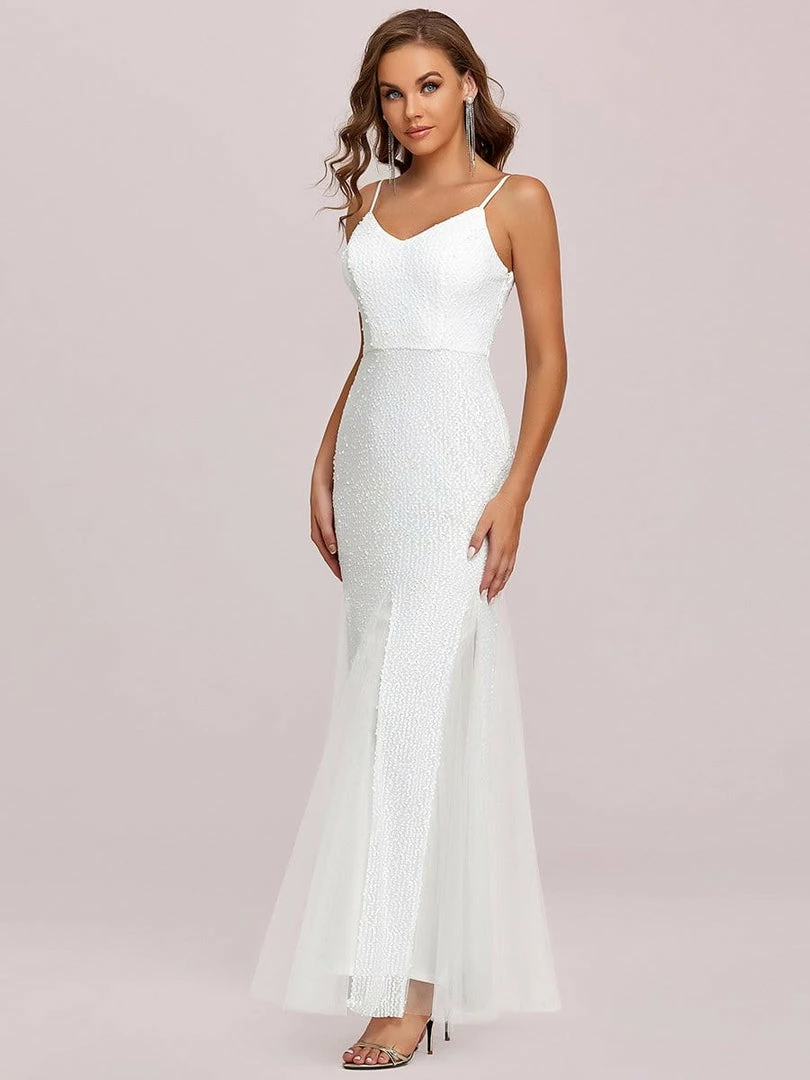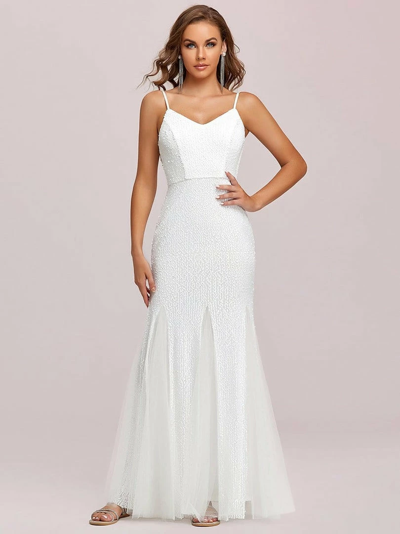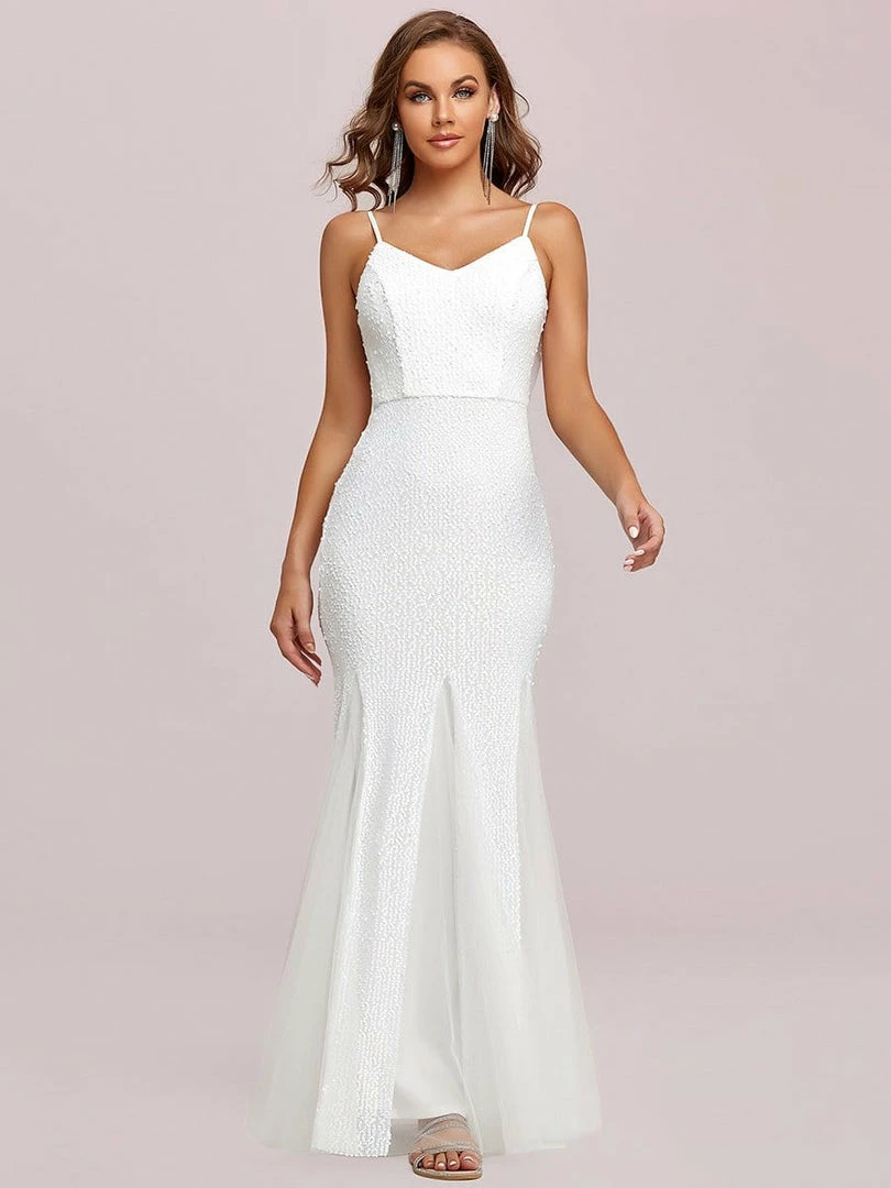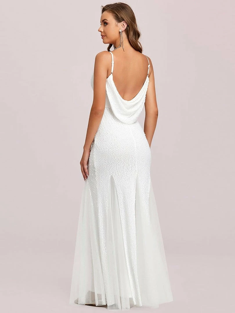 Select this effortless open back evening dress and make a sophisticated impression with its flattering spaghetti strap v-neck, cinched bodice, and flowing floor-length mermaid silhouette for a dramatic style. Pair this stunning open back bodycon evening dress with crystal, silver, white, or gold high heels and complete your look for day or night.