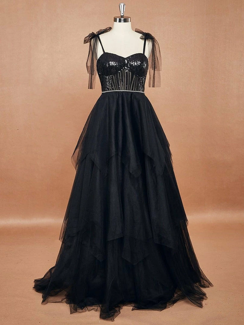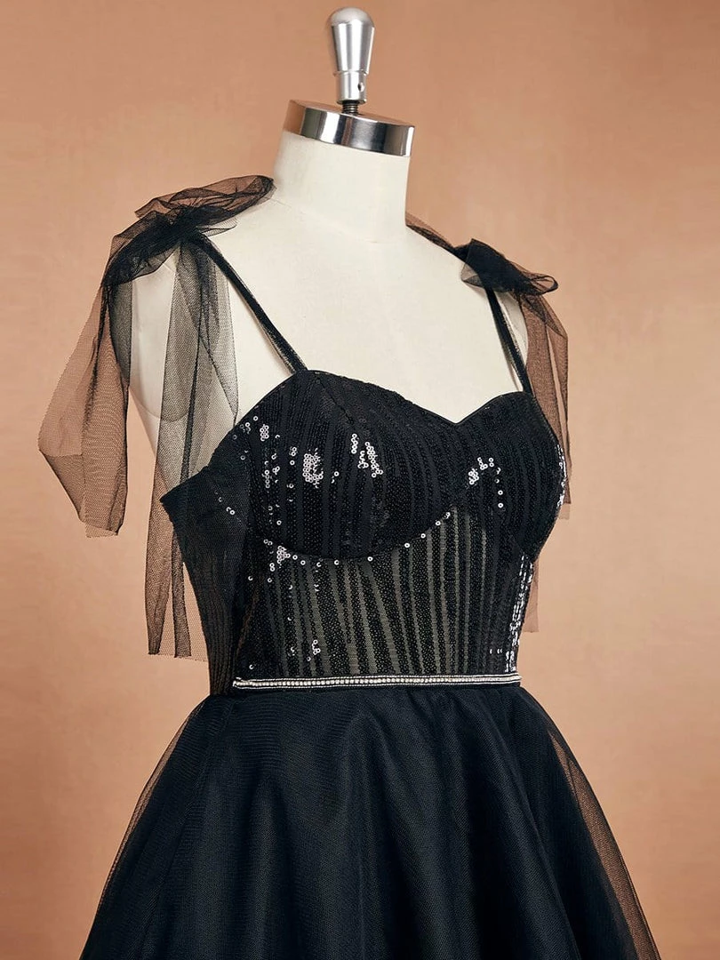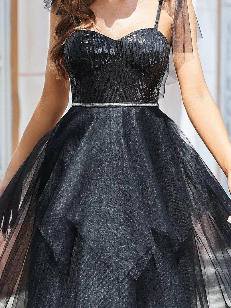 This sweet, black tulle wedding dresses features a sheer layered dress and cinched bodice covered in beautiful sequins and finished with a flattering sweetheart neckline. The spaghetti straps give this A-line see-through wedding dress a summer vibe, but also make this style perfect for year-round weddings.
