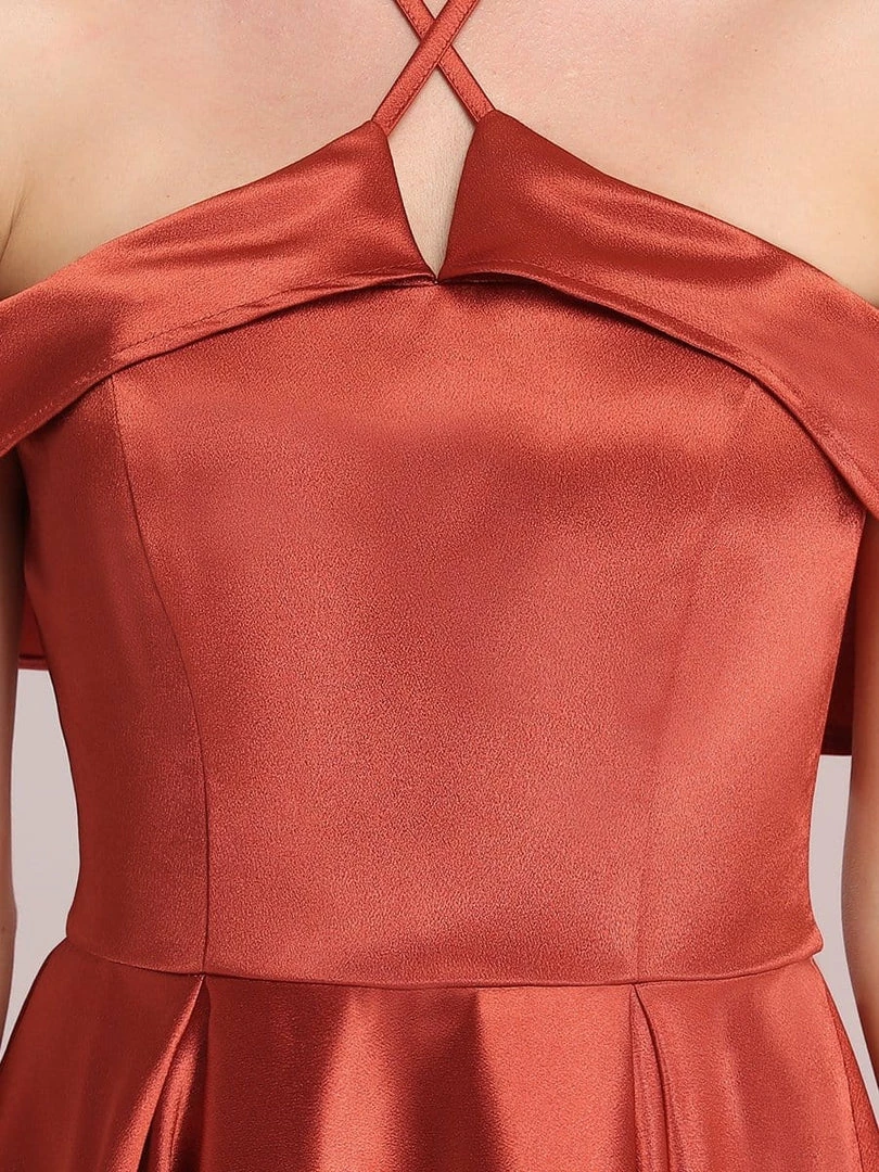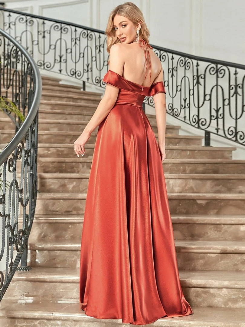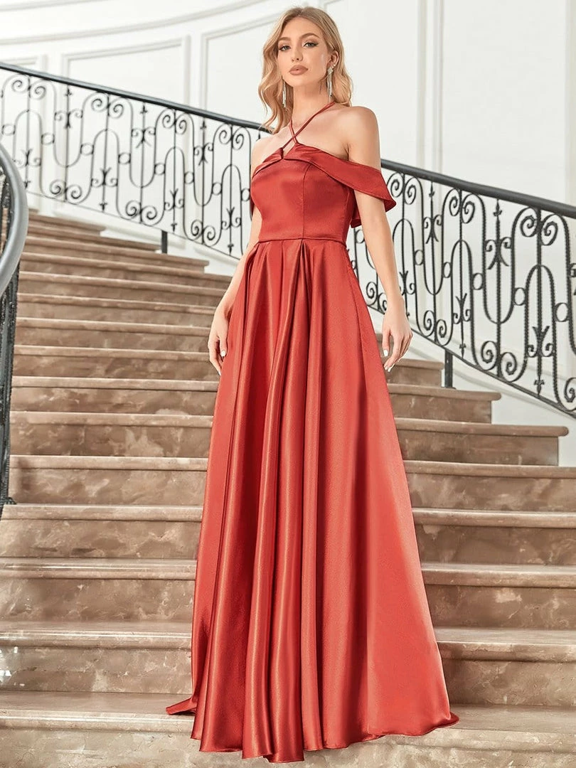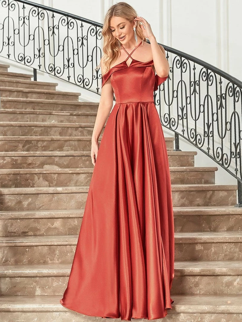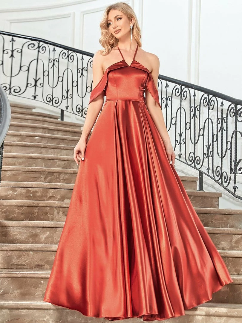 This breathtaking floor-length evening dress features an adjustable criss cross halter and backless fit, along with a cinched bodice that gives way to a stunning A-line/ball gown circle skirt. The fold-over v-neck collar adds a unique detail. Wear this pretty frenulum evening dress to a wedding, as a bridesmaid dress, to the prom, and more.