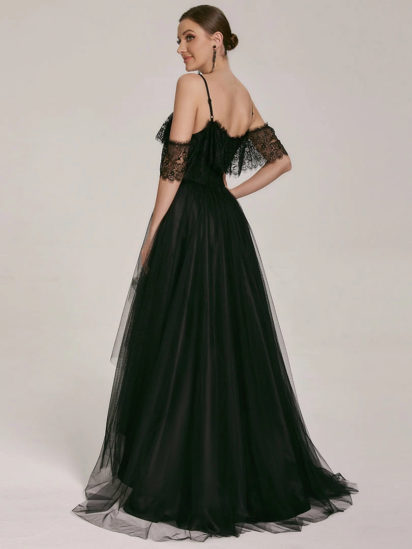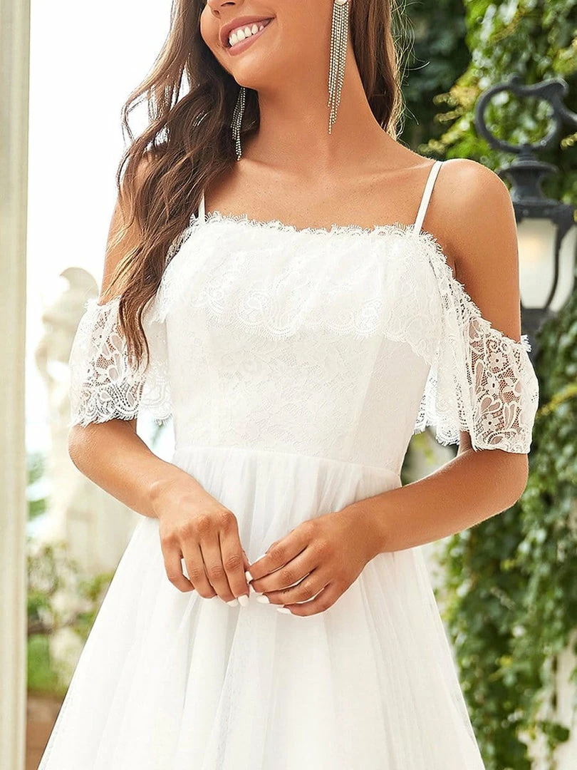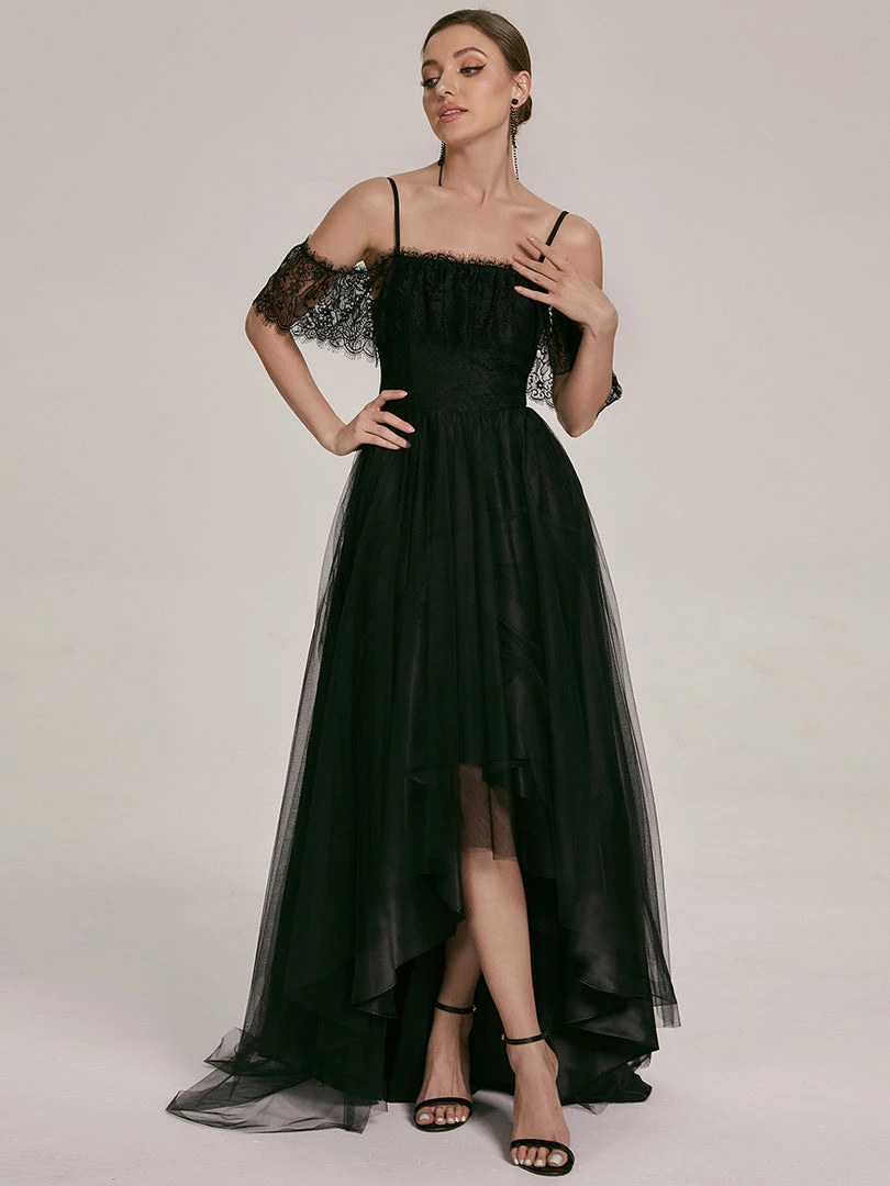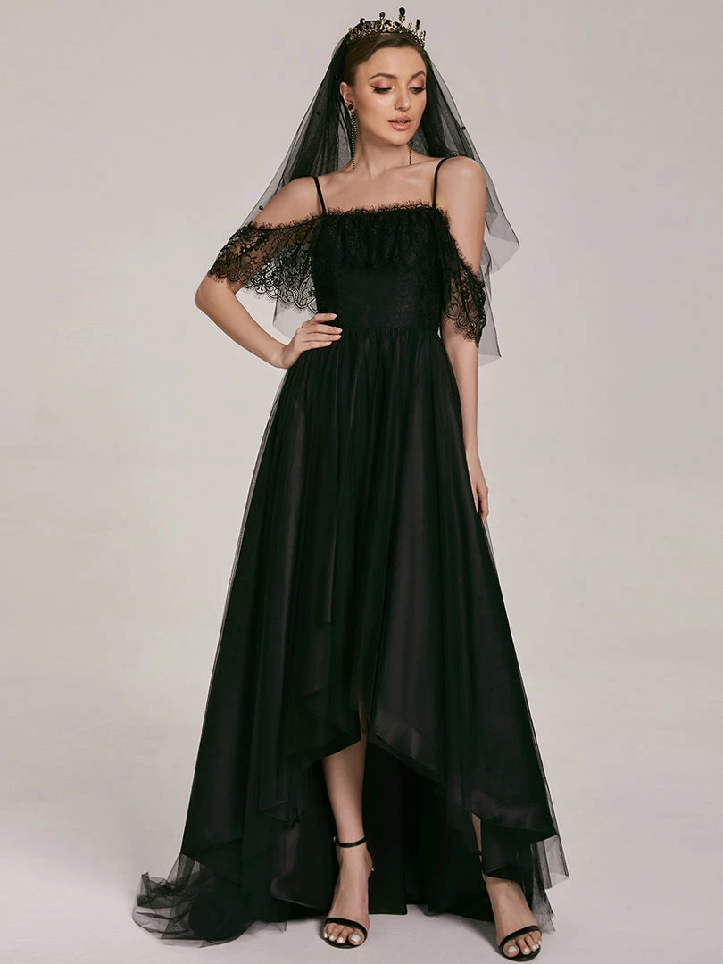Celebrate your most momentous occasion with this?lace hi low?wedding dress featuring an easy-to-wear high-low hem, cinched waist, and summery cold shoulder spaghetti strap top. Wear this vintage-style lace hi low wedding dress with your favorite heels of choice for an indoor or outdoor wedding.