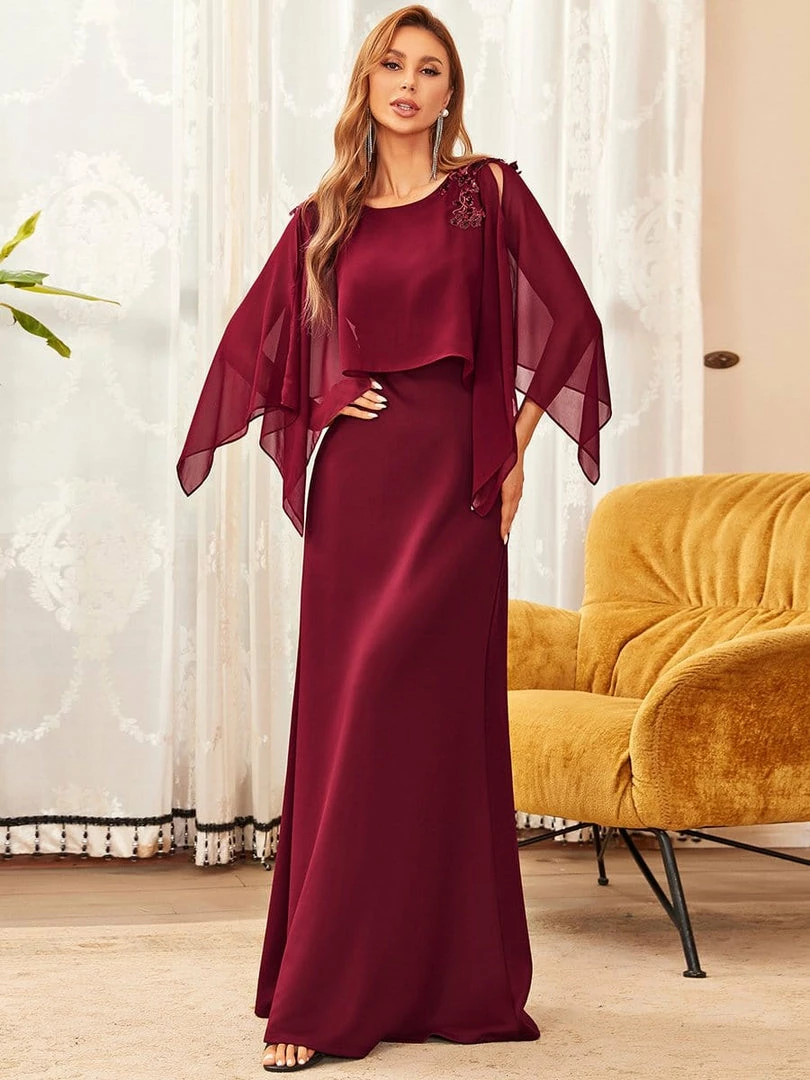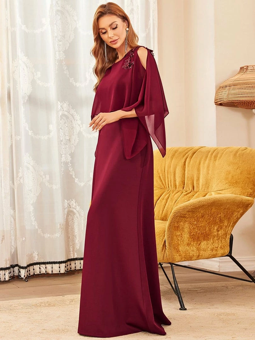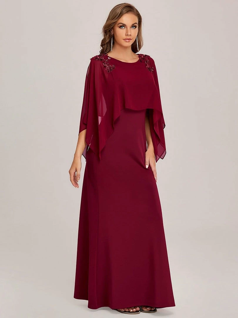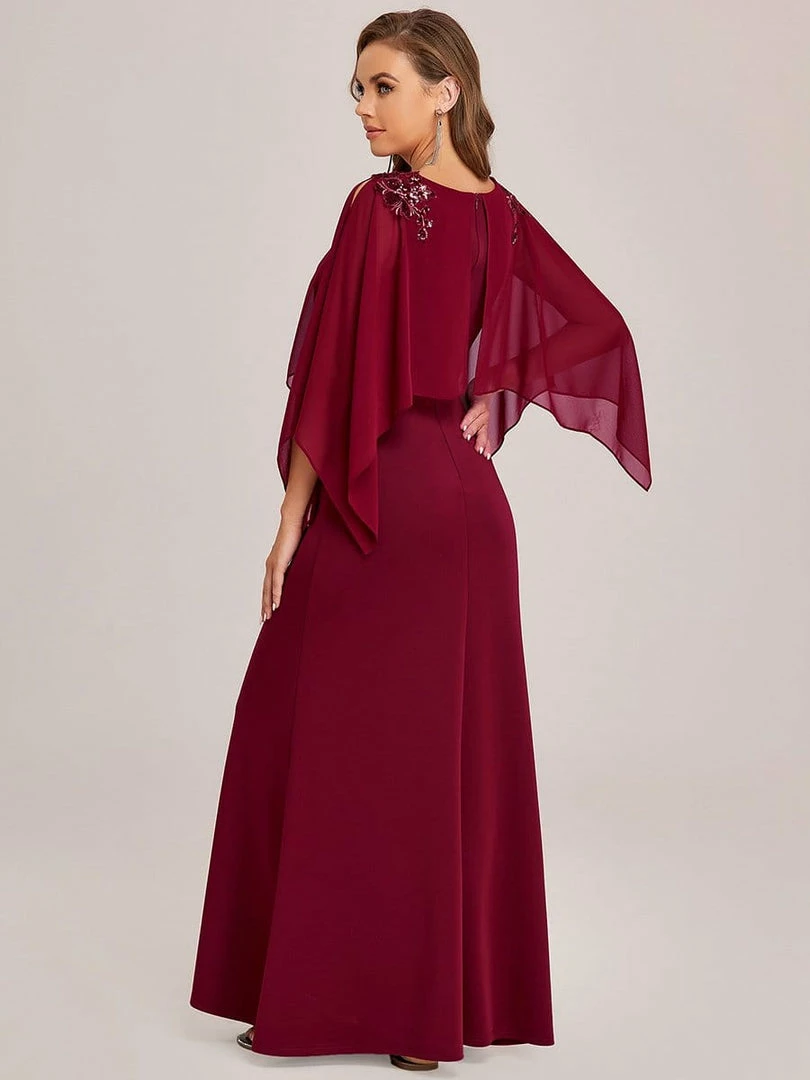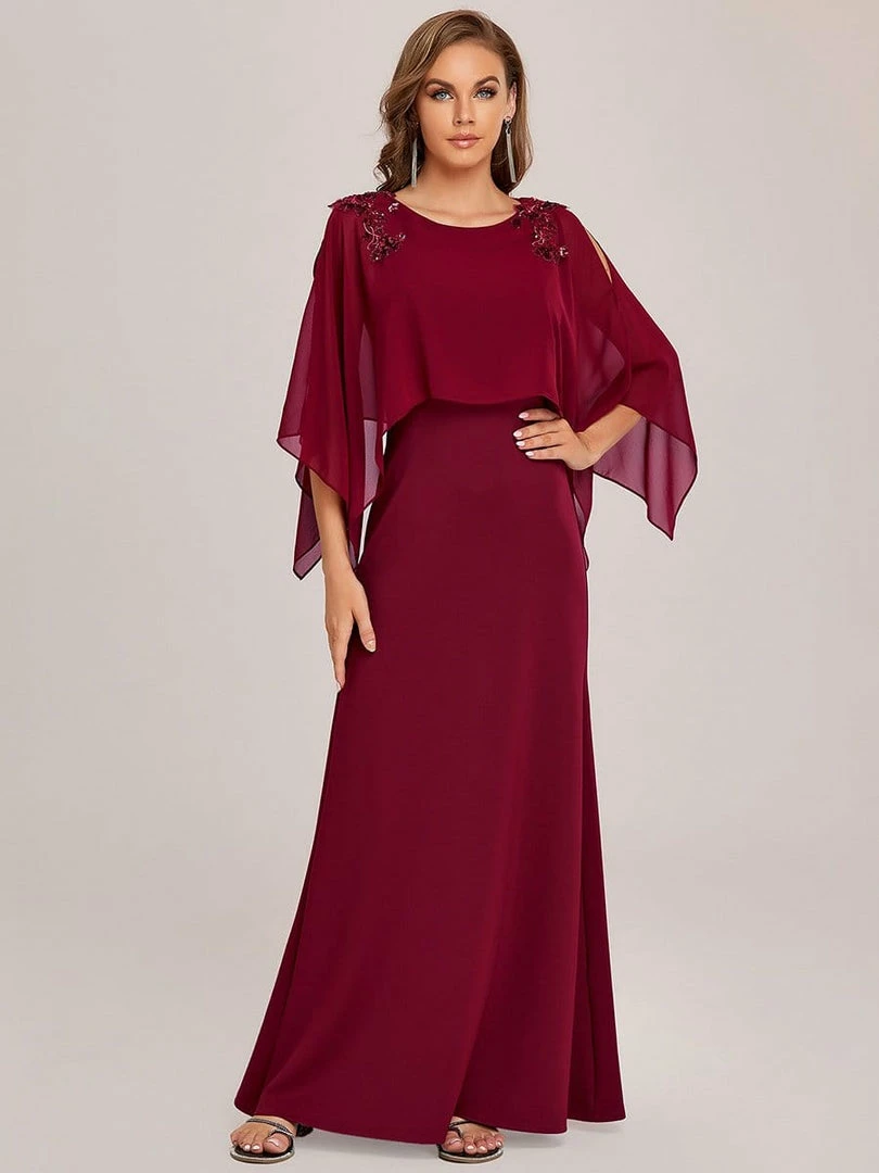 This elegant and mature floor-length column mother dress features a sheer overlay with long sleeves and floral sequins on the shoulders for luxurious detail. The fitted bodice and flattering silhouette make this mother dress effortless to style.