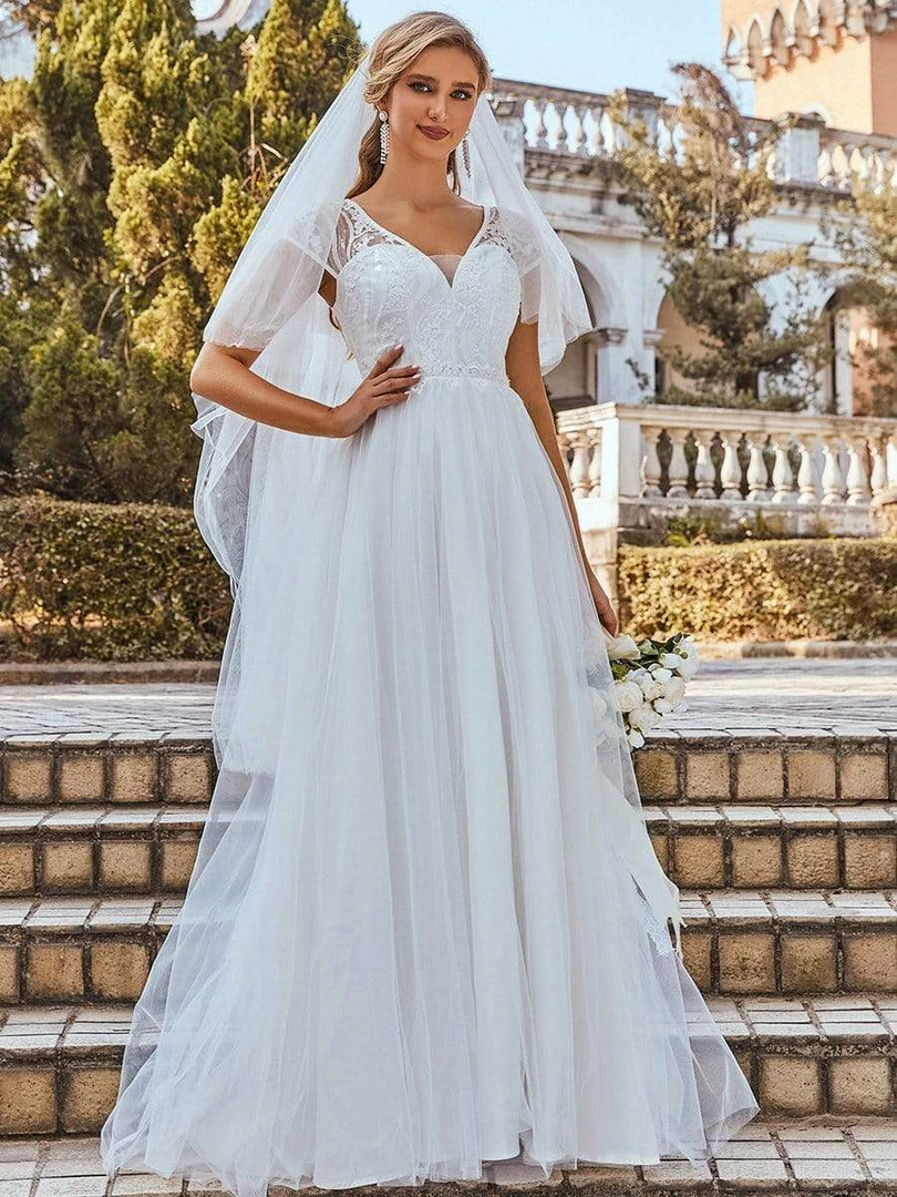 Custom size wedding dress at Ever Pretty. This casual a line outdoor wedding dress will make you look awesome on your big day. Sheer cap-sleeves, plunge neck and the empire bodice along with beautiful lace back goes beyond graceful and romantic. Delicate floral belt decorated around waist-line gives your figure a slimming shape. The bodice is lined and paired with a floor-length fishtail tulle skirt for a classic bride-to-be. If you are a plus-size girl, then this casual a line outdoor?wedding dress is available for you too. We have plus size options too. Select yours and be unique bride now!