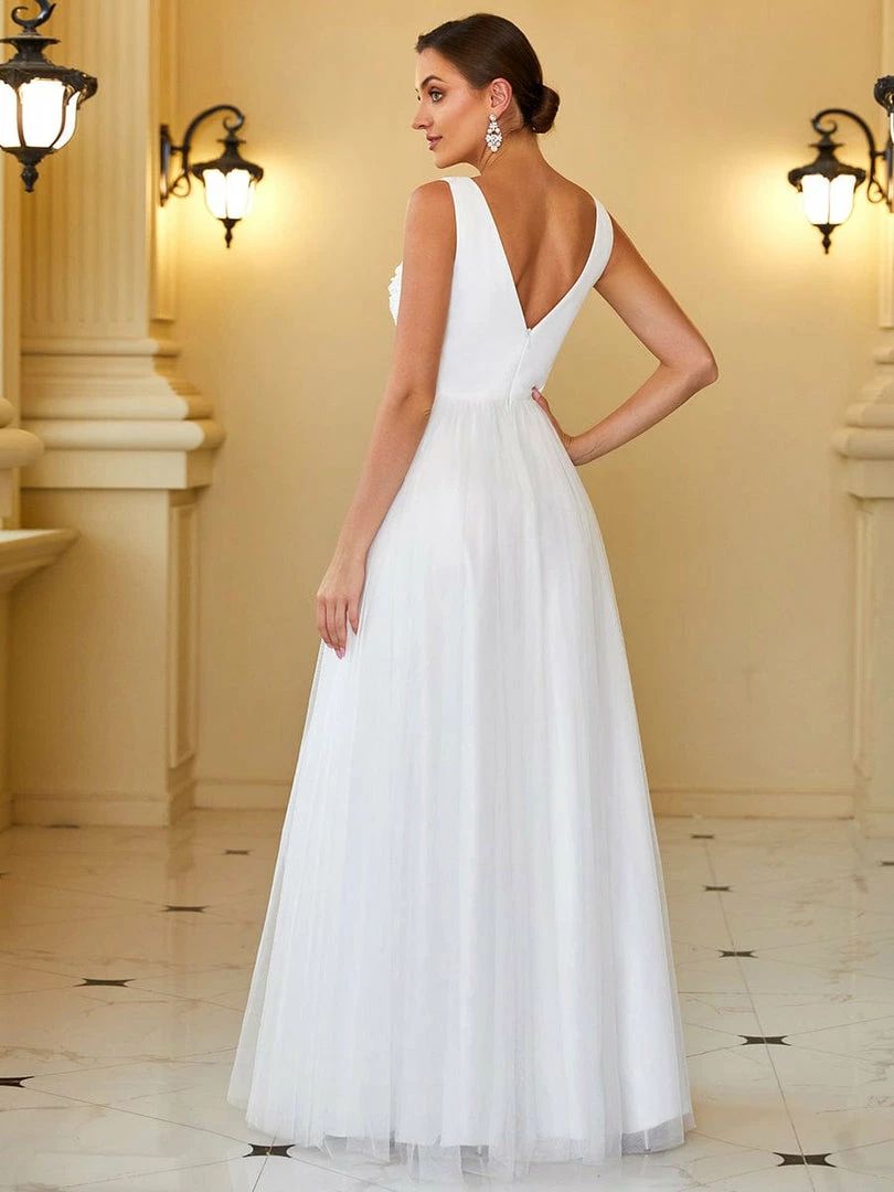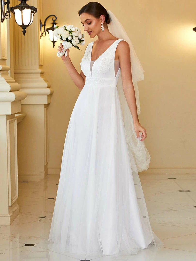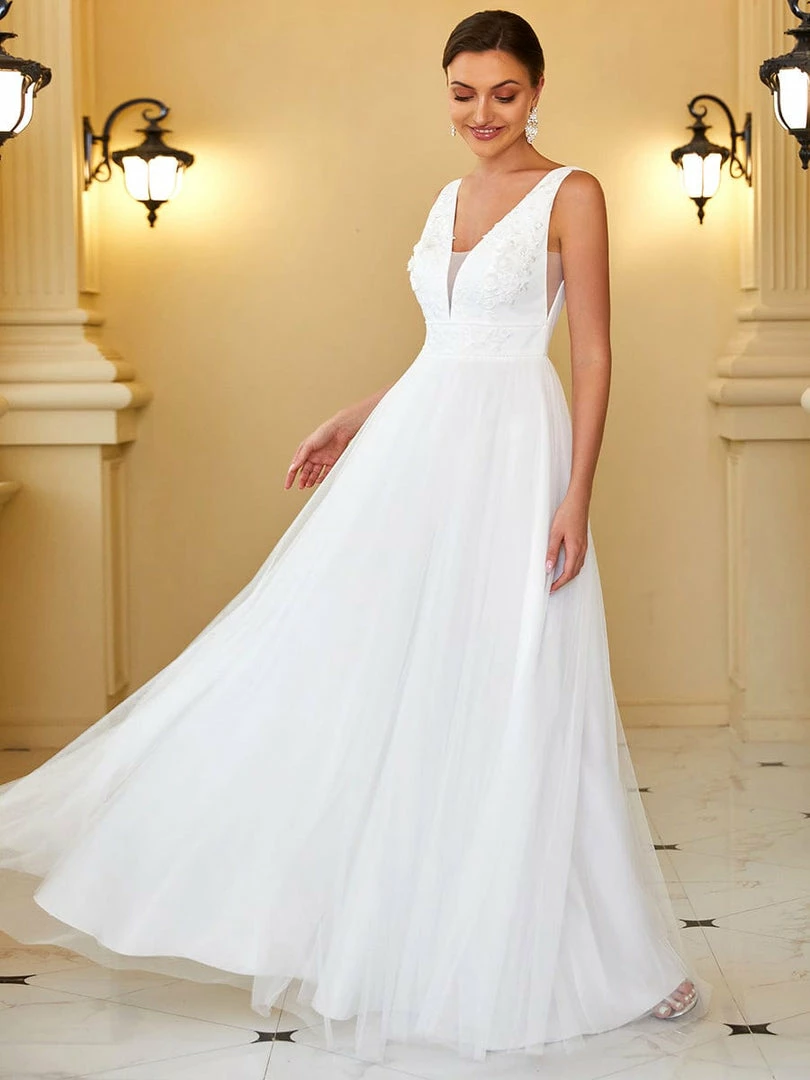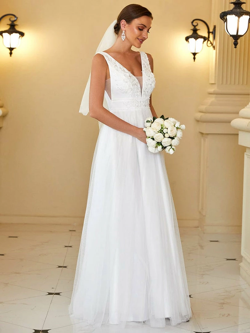 This stunning A-line wedding dress features a plunging illusion panel v-neck and v-back. A sleeveless fit and romantic floral applique give way to layers of beautiful floor-length tulle. Make an elegant entrance for any wedding with this timeless bridal gown.
