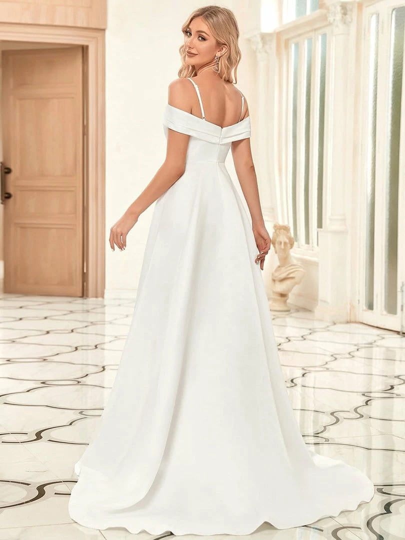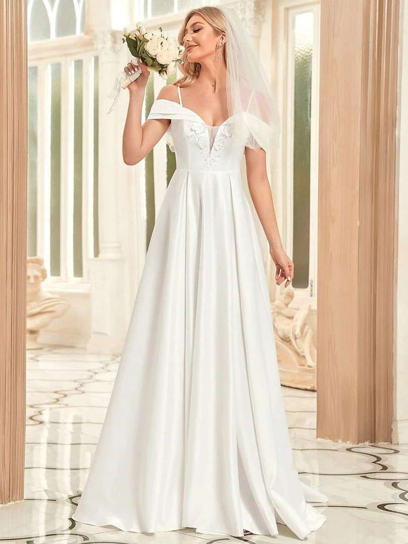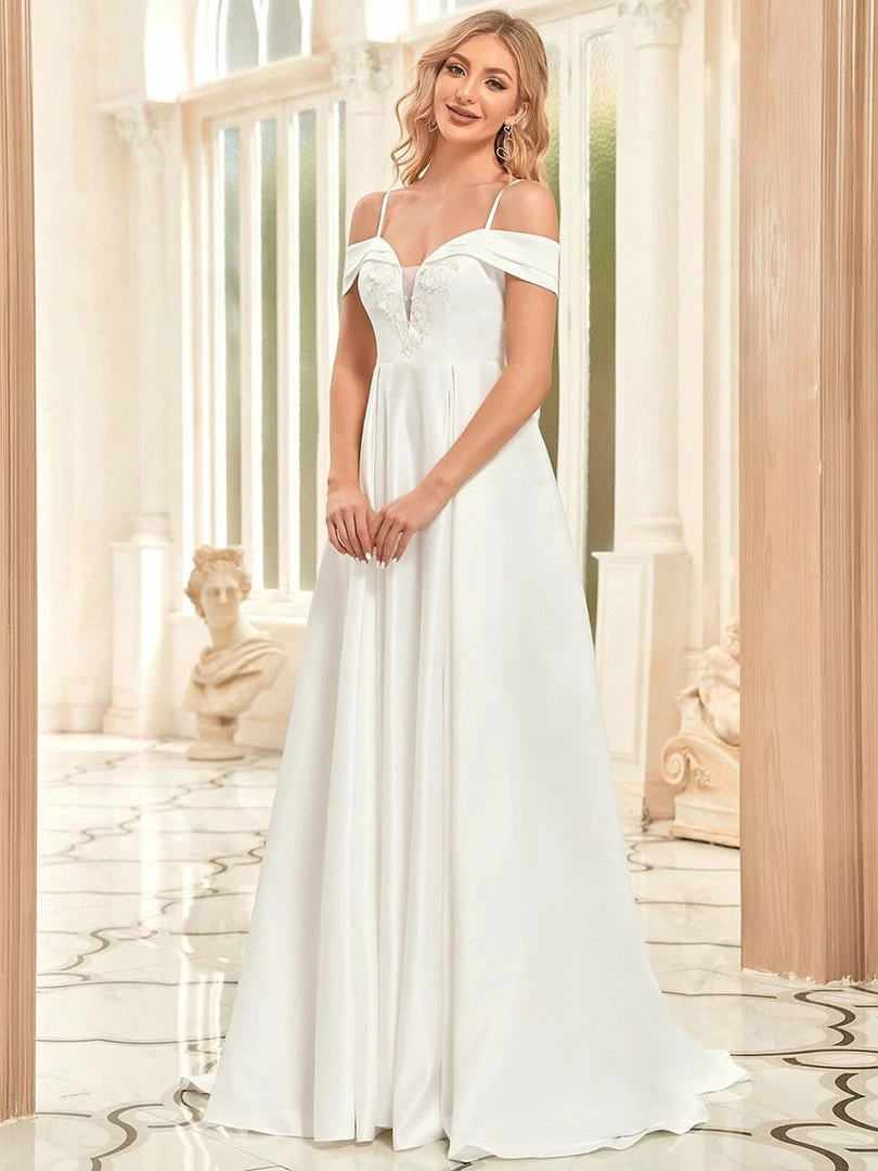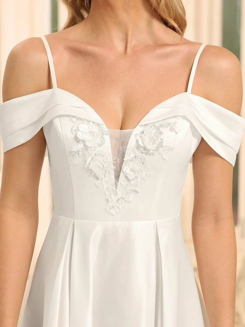 This vintage-style bridal gown features an ethereal floral applique on the front and a spaghetti strap cold shoulder sweetheart neckline. An illusion panel on the decolletage and cinched waist give way to a sweeping ball gown/A-line silhouette, providing the perfect balance of style elements for a look of pure elegance and sophistication.