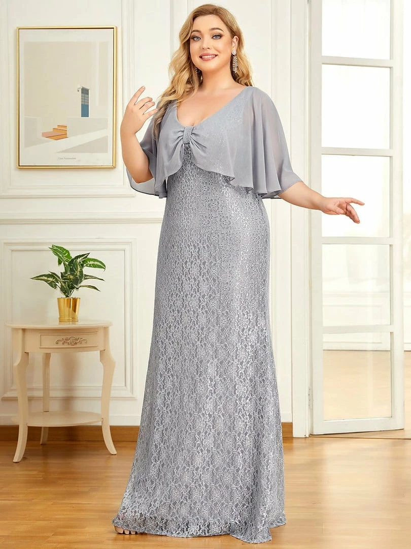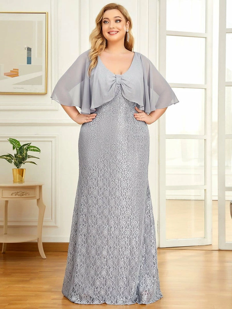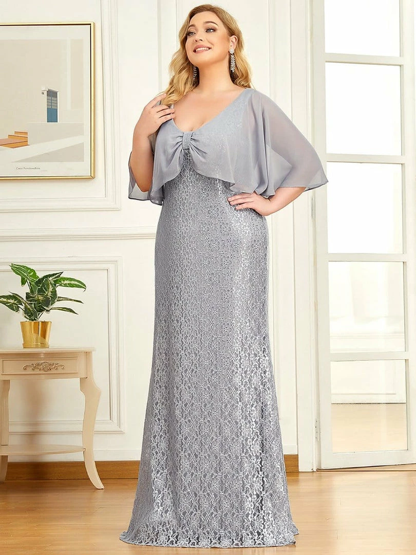 Take part in the wedding ceremony in unforgettable style with this gorgeous, demure fold-over chiffon top fishtail mother of the bride dress. Sparkling sequins adorn the front in a beautiful bow tie. Floral lace and a bodycon mermaid silhouette take this elegant evening dress to another level of glamour, worthy of every picture-perfect occasion.