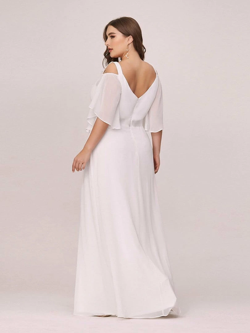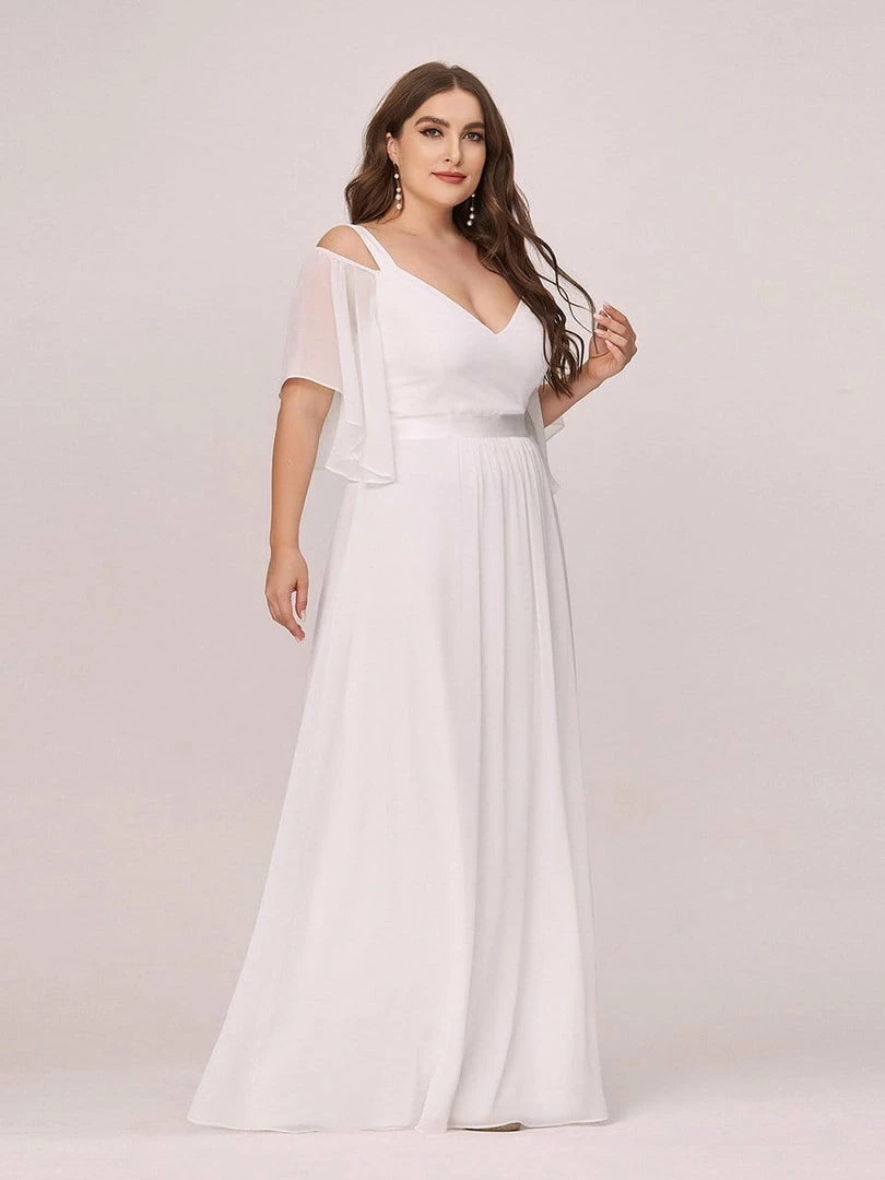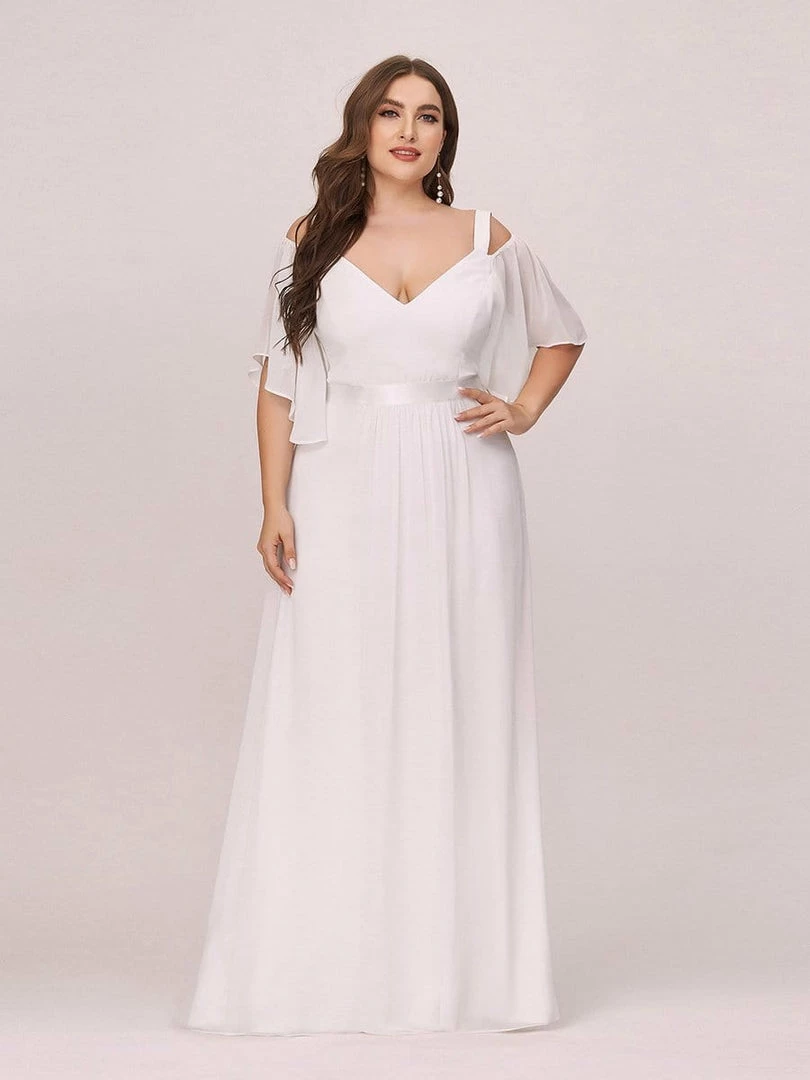 This romantic plus size off the shoulder outdoor white formal dress features a empire waist, flutter sleeves, and belt design. The shoulder straps are unadjustable. This comfortable chiffon off shoulder wedding dress with sleeves is perfect for summer beach or any weddings.