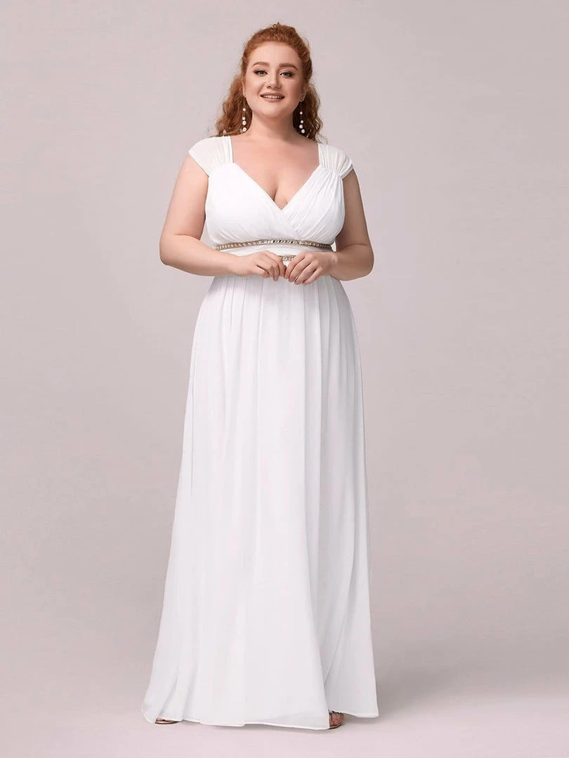 Featuring a deep V neckline, cap sleeves, and a sequins belt design, this flowing plus size simple wedding dress is perfect for any brides! Whether you are planning an outdoor weddings or an elopement wedding, this causal wedding dress is perfect for you. Style your hair in a loose braided up-do and pair with lots of gold jewelry to solidify your goddess status.