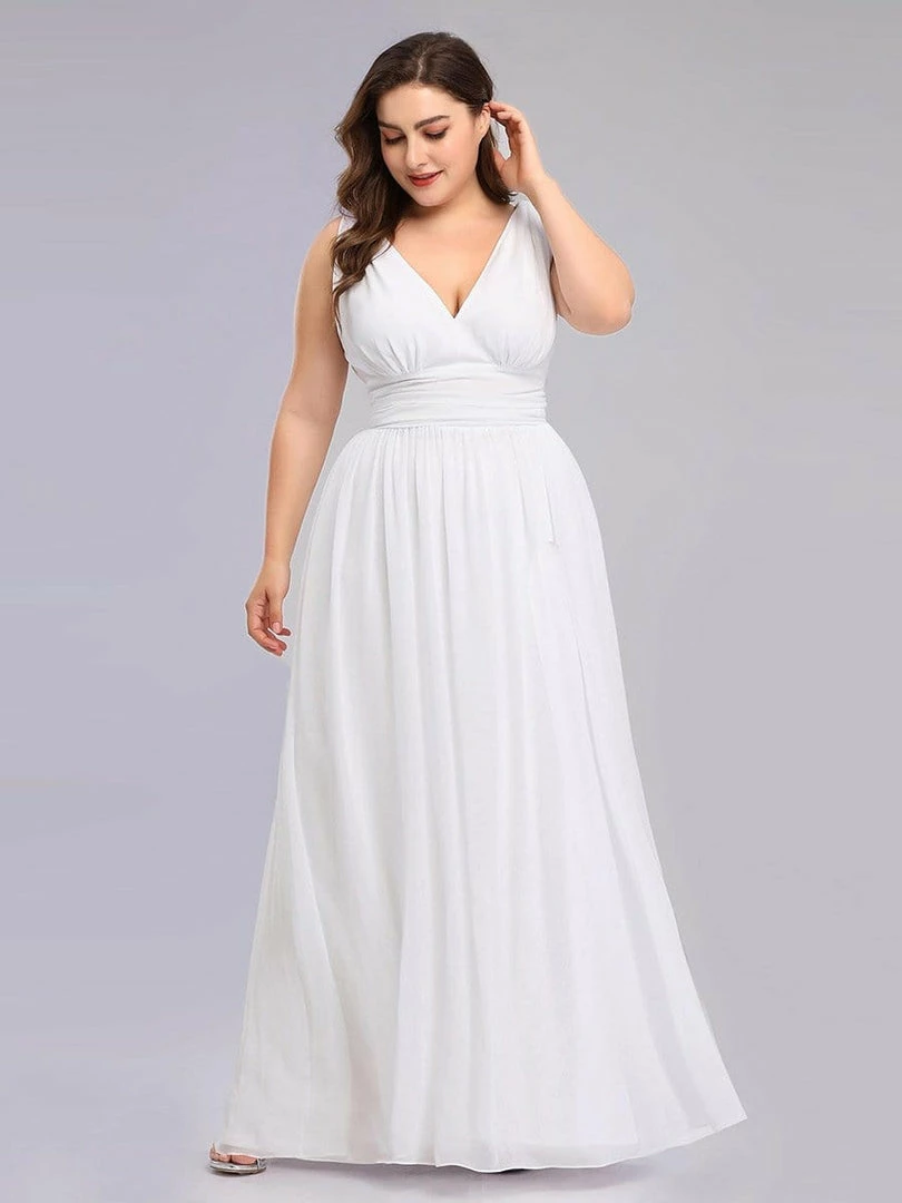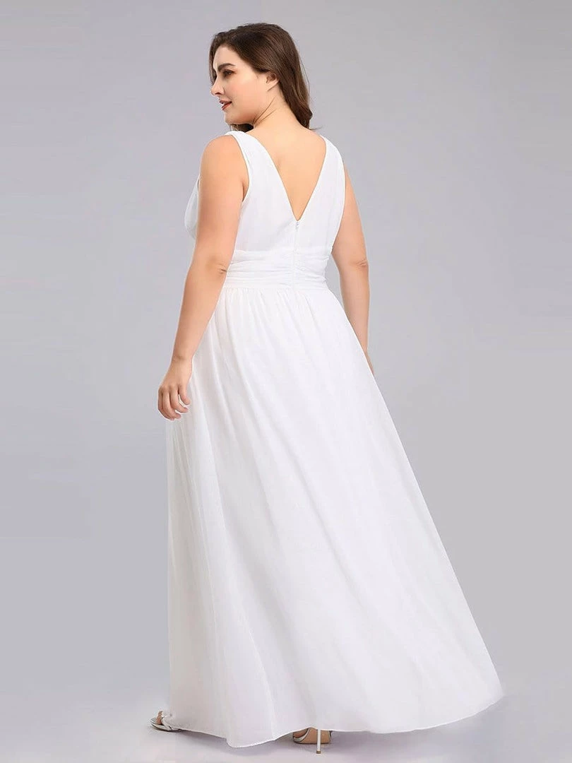 This plus size simple wedding dress is perfect for any occasion you are attending. The sleeveless chiffon wedding dress will be a hot addition to your wardrobe with its daring plunging neckline. The fit and flare design of this causal wedding dress is an absolute beauty as it will look gorgeous on all body types.