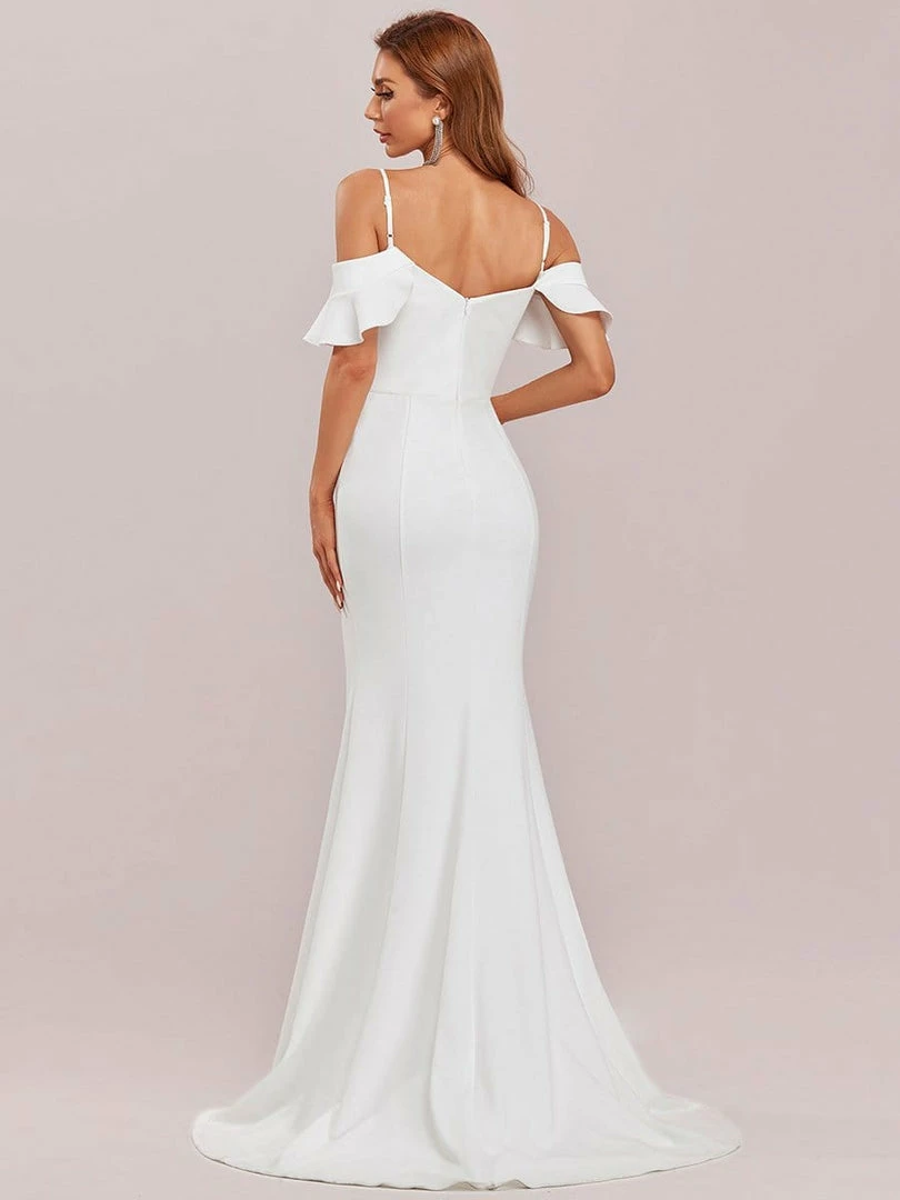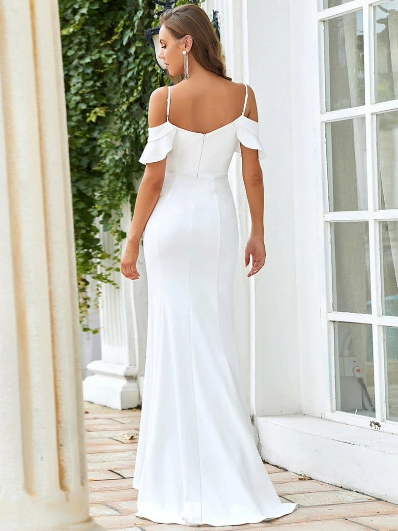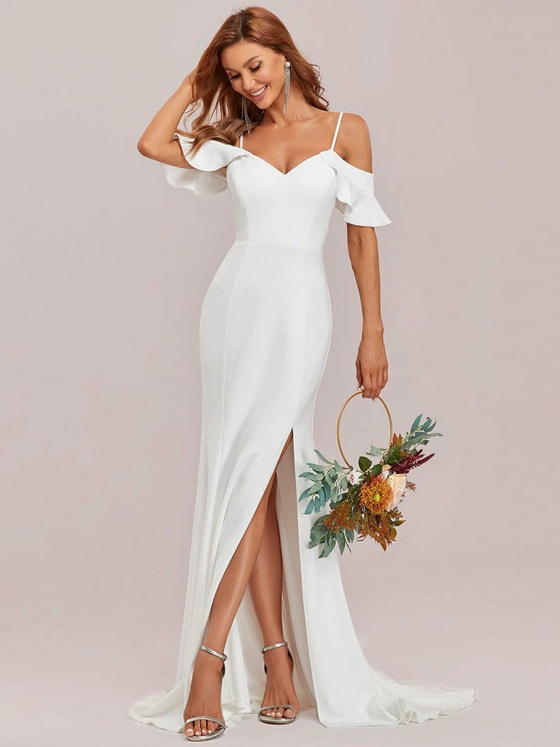 This sultry bodycon wedding dress is perfect for summer with its refreshing silhouette that is right on-trend. A ruffled off-shoulder spaghetti strap top elegantly graces the collarbone, along with a V-neck collar and high slit in the front, perfect for showing off your wedding shoes in pure style.