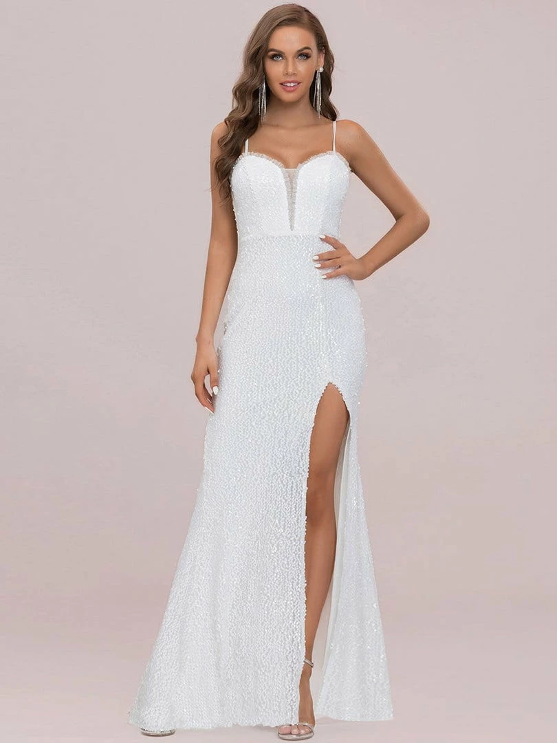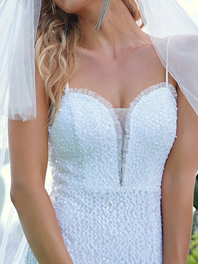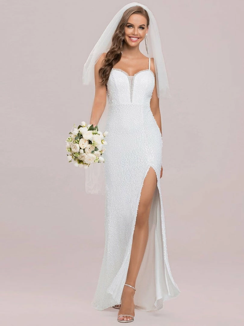 This stunning V-neck wedding dress is covered in glittering sequins all over and has a high split to accentuate the figure in a sophisticated style. The fishtail hemline gives this beautiful bridal elegant vibe and it is perfect for any wedding theme. Wear this stunning gown to shine on the most important day.