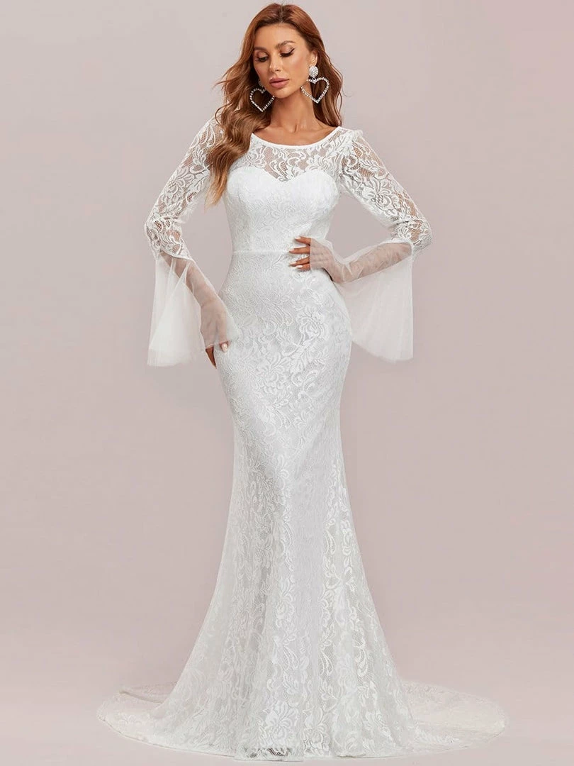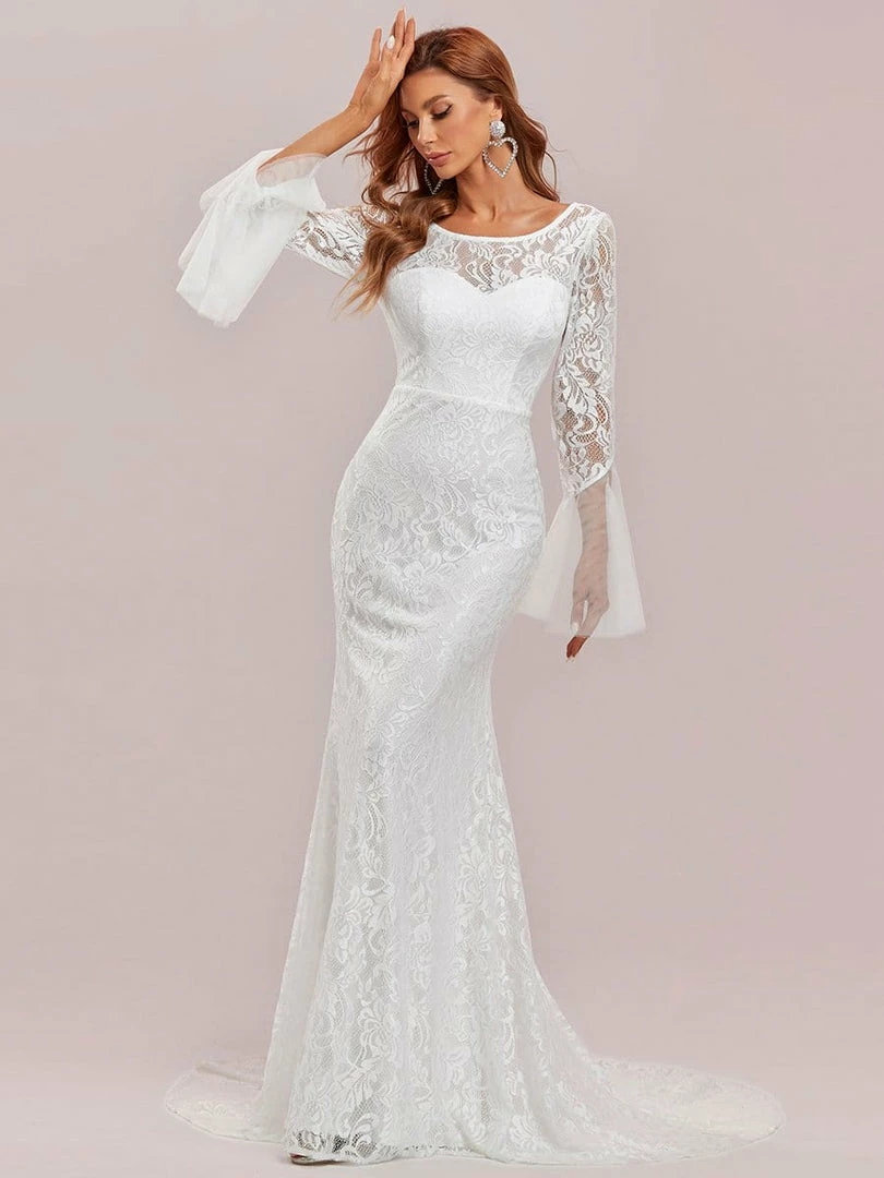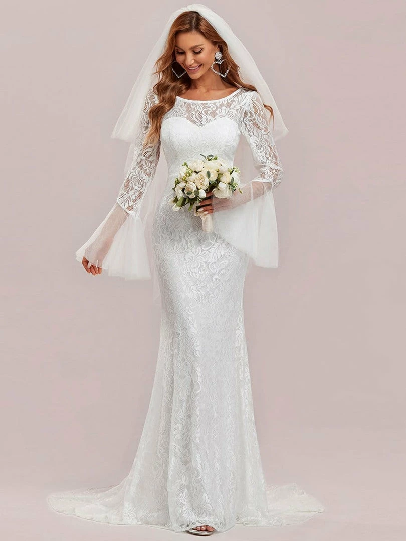 This bodycon floor-length long lace sleeve wedding dress features a gorgeous all-over floral lace, sweetheart neckline, and sheer top, giving it a look of vintage inspiration. The cinched bodice and flowing mermaid bottom exude a pure elegance, ideal for any time of year.