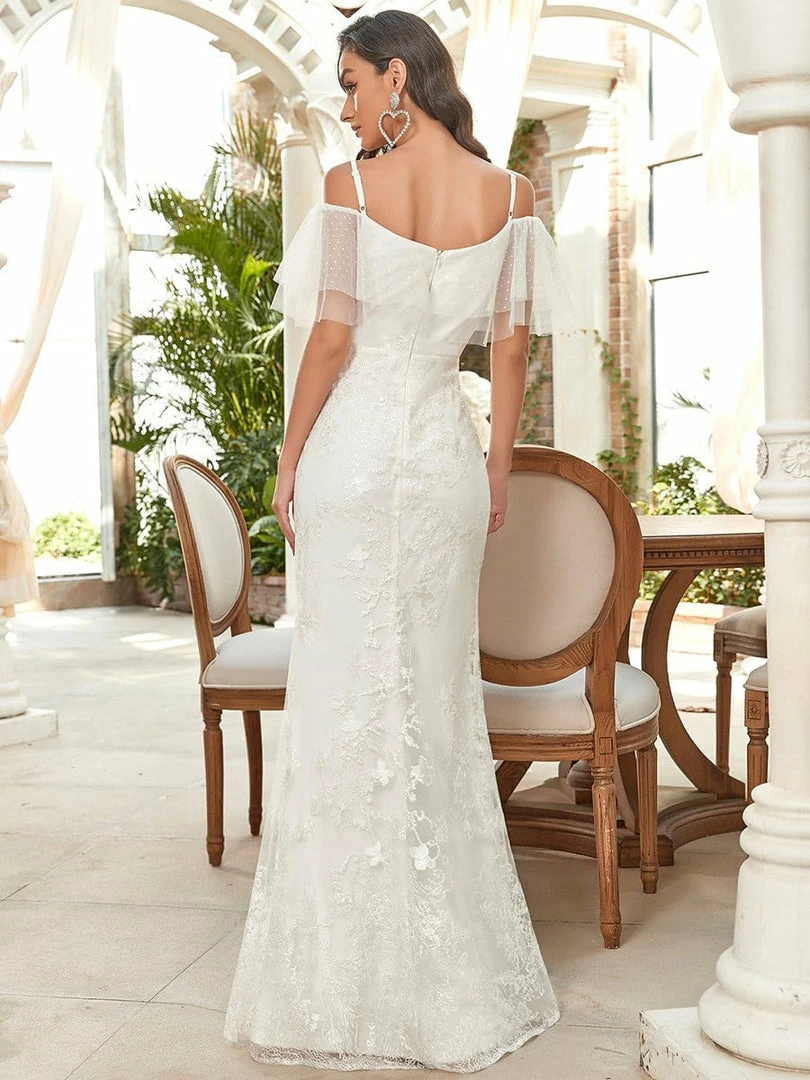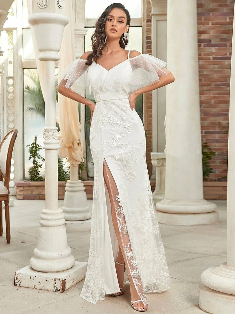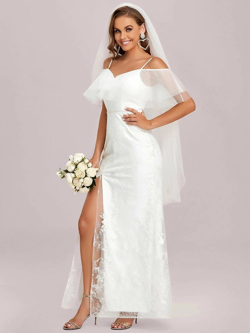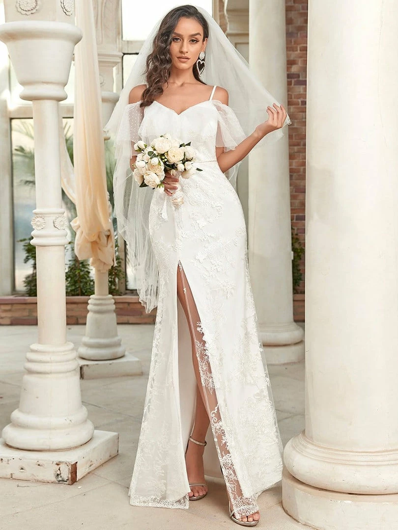 This vintage-inspired cold shoulder wedding dress features beautiful floral lace all over and a high slit on the front. A v-neck collar and sheer polka dot tulip sleeve overlay give this a-line wedding dress a magical quality, perfect for making your wedding dreams come true.