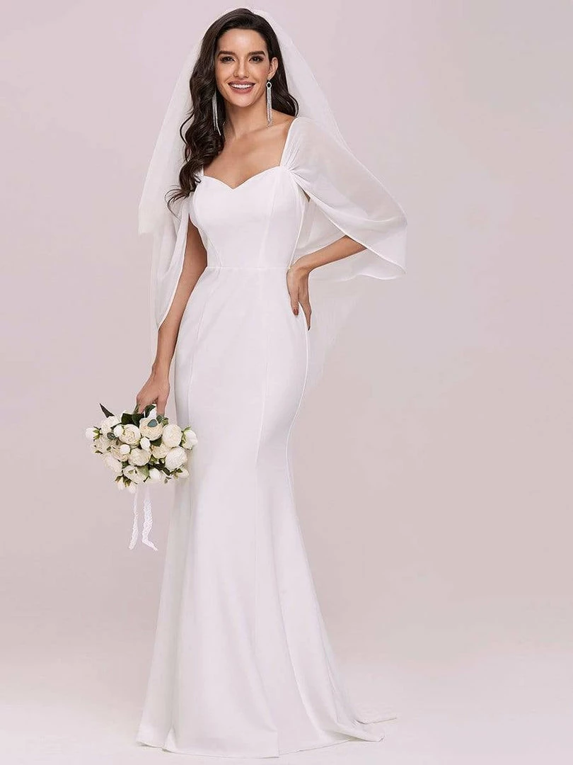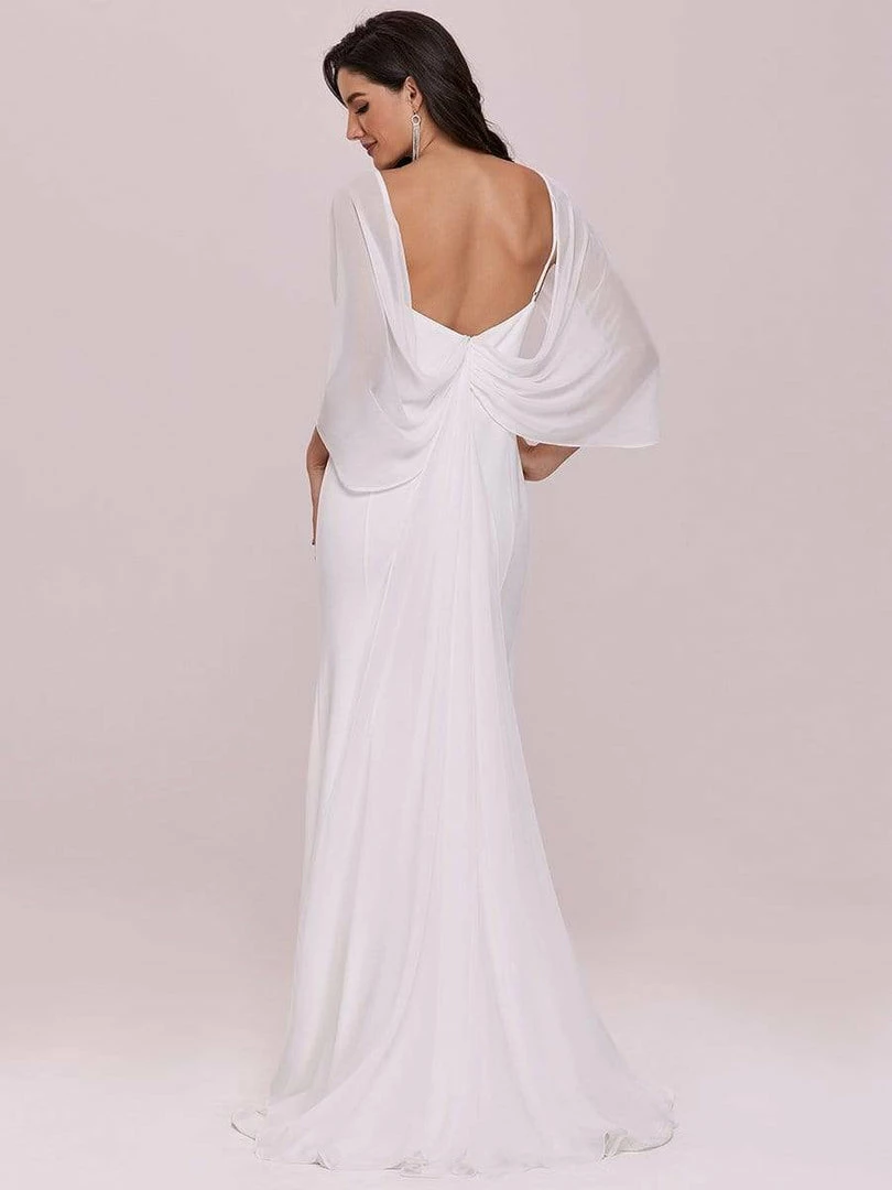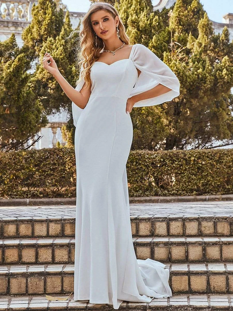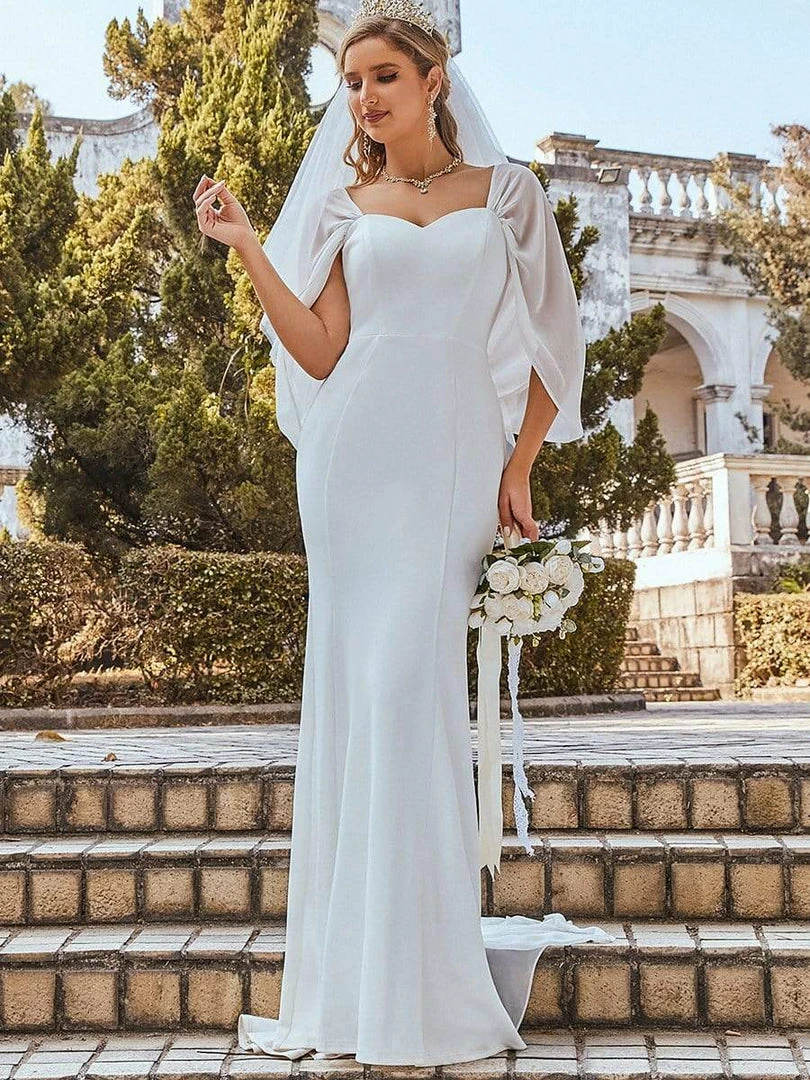 Regally draped swag-sleeves in soft Chiffon Georgette along the neckline and back imbued with a triangular plated trail of matching fabric is a subtle yet romantic outdoor wedding dress for a simply gorgeous bride. The swag-sleeves are perfectly attached to the concealed zipper with an appealing waving-flow coming from front to back. The fishtail style with the floor-length makes your figure even more appealing and mesmerizing. Wear this simple mermaid wedding dress to be uniquely pretty and gorgeous on your big days.
