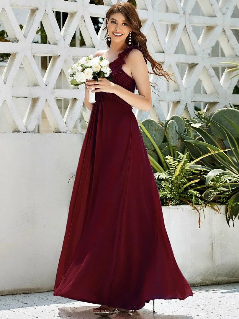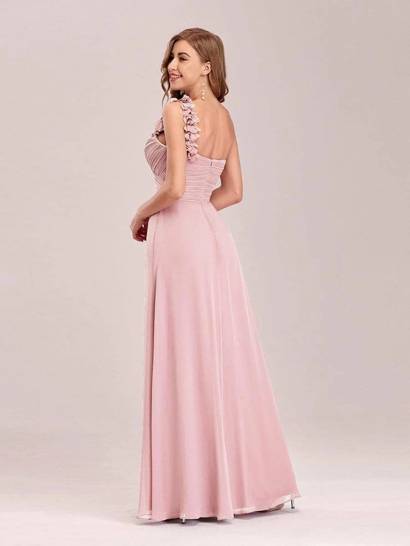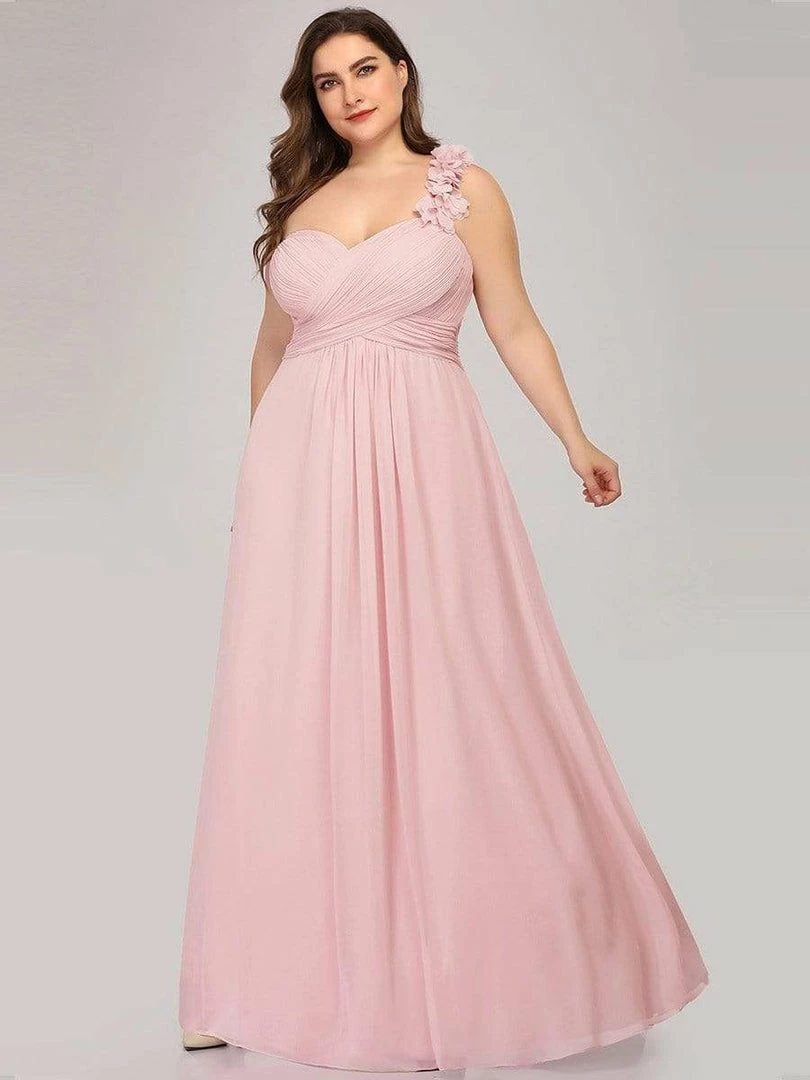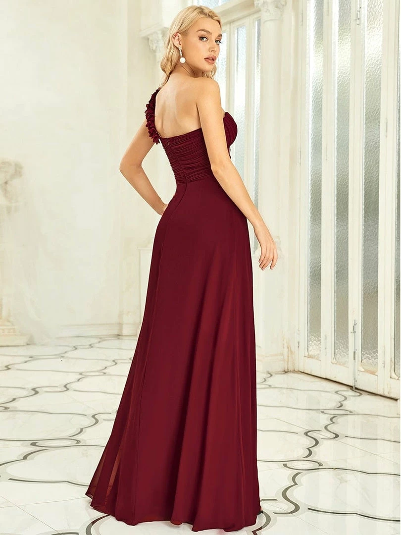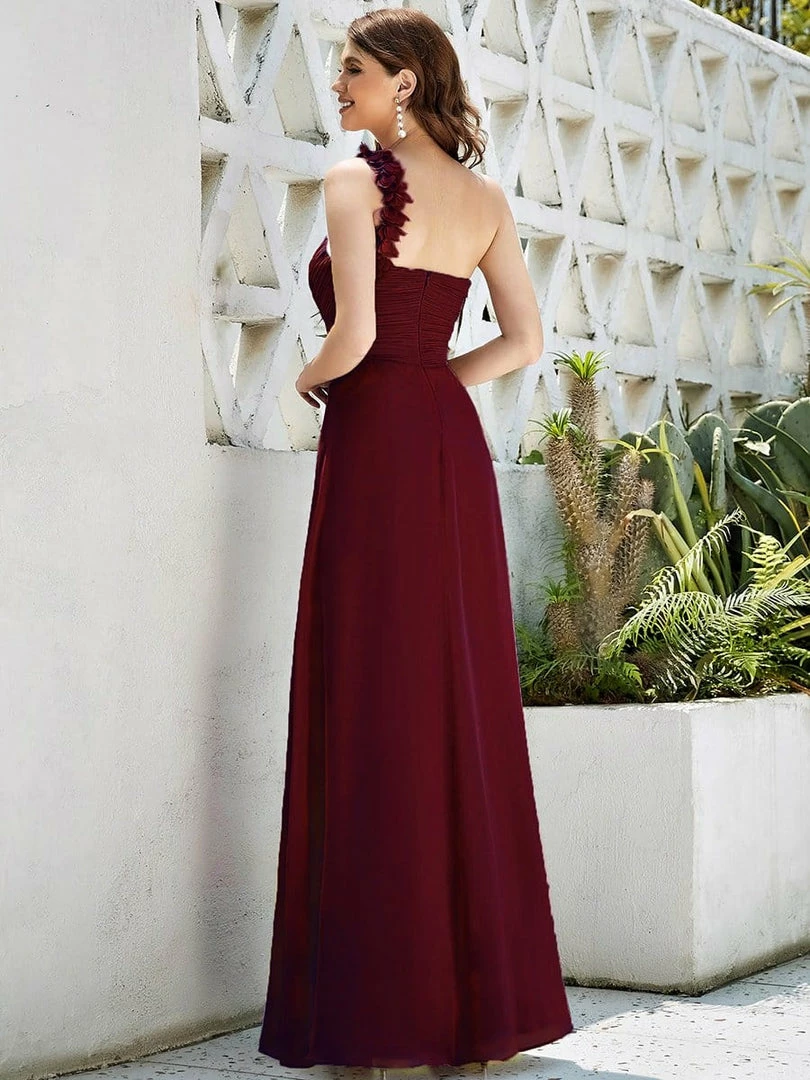 This stunning one strap chiffon bridesmaid dress features a flattering ruched sweetheart neckline with a draping lower design in the lower half of the silhouette. The flower detailing on the single shoulder strap gives the one strap bridesmaid dress a sweet touch. This pleated one shoulder bridesmaid dress has sweet pink color, timeless burgundy, romantic purple, modest grey and more colors for you to choose from. Really perfect for all formal occasions, from evening party, cocktail, weddings to prom, homecoming, and graduation! Prices will vary as certain colors of this style is on sale.