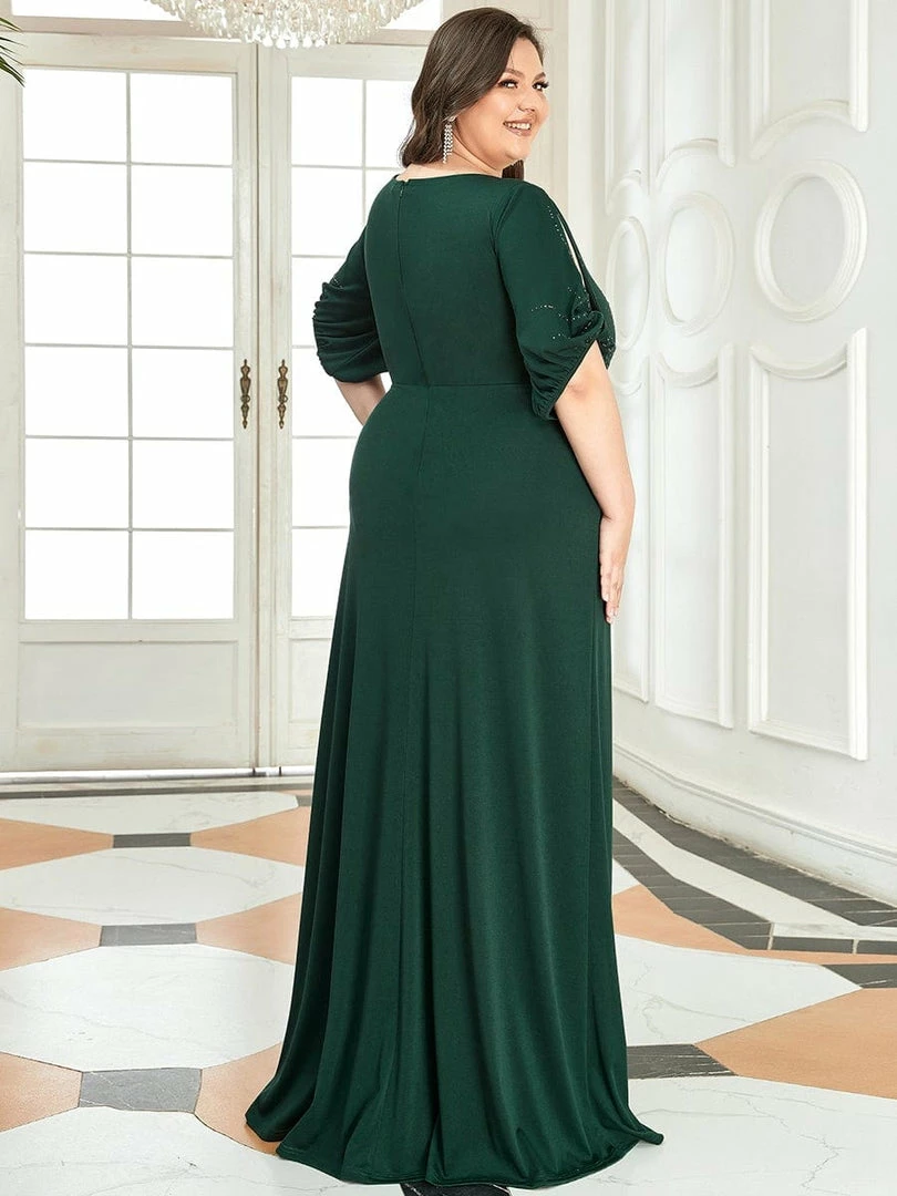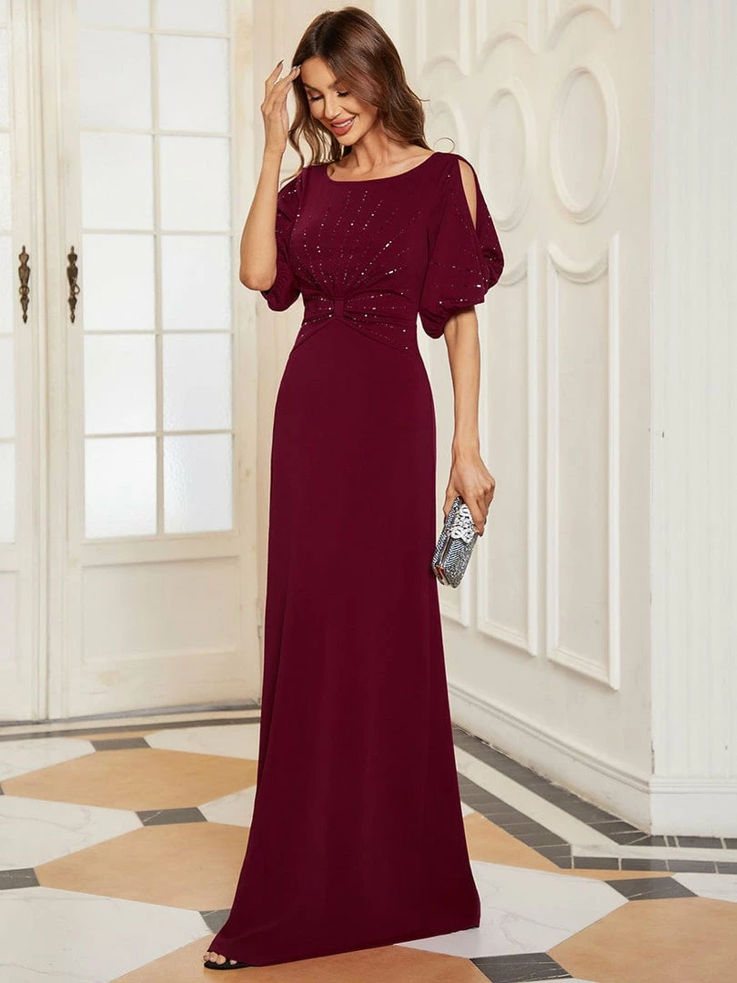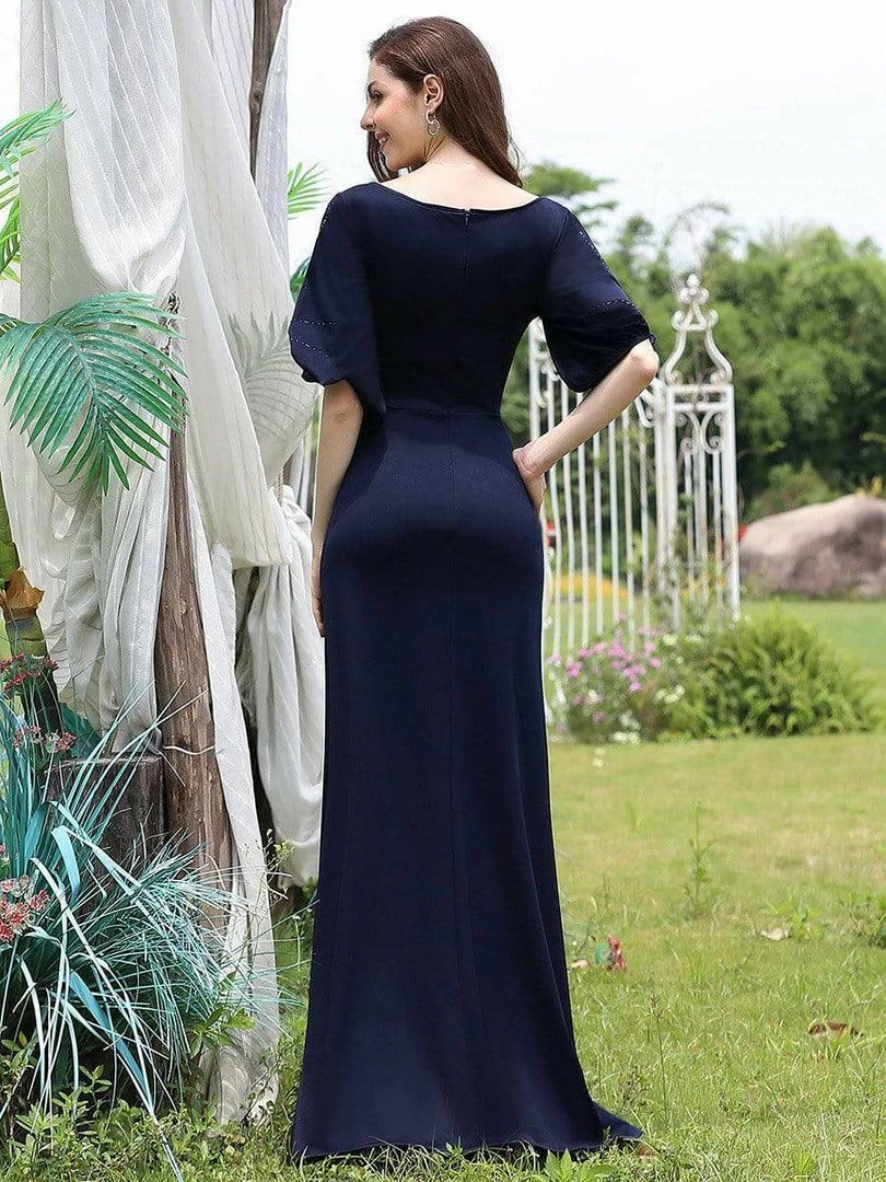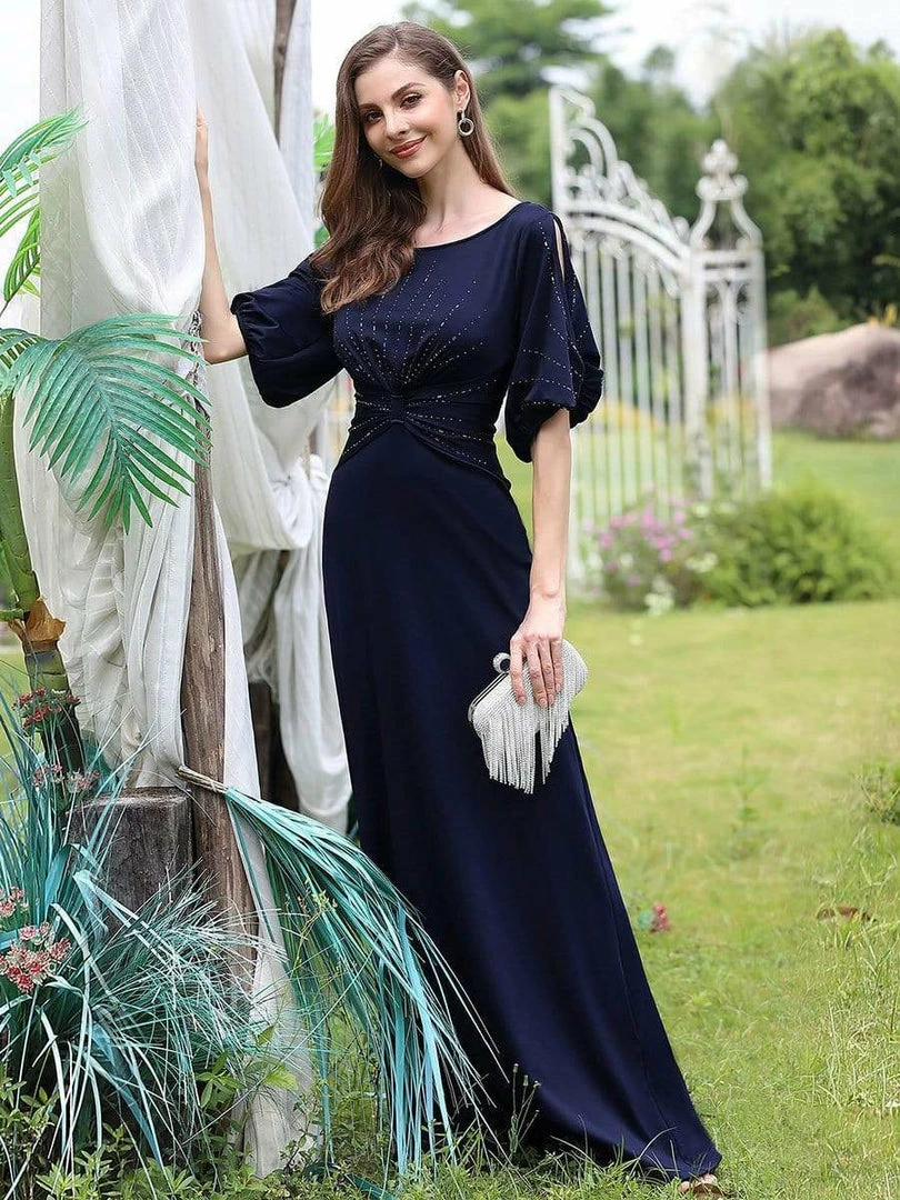 Want to look like a model? If yes, then buy this elegant pretty evening dress with sleeves. It features an A-line silhouette, round neck and half sleeves. The silver hot drill decoration on the evening dress make it look elegant and classy. This gorgeous burgundy and navy blue evening dress with sleeves can easily be paired with silver accessory and you will definitely make all head turns. We think this gorgeous long mermaid evening dress is perfect for all formal occasions, from evening party, cocktail, weddings to prom, homecoming, and graduation!