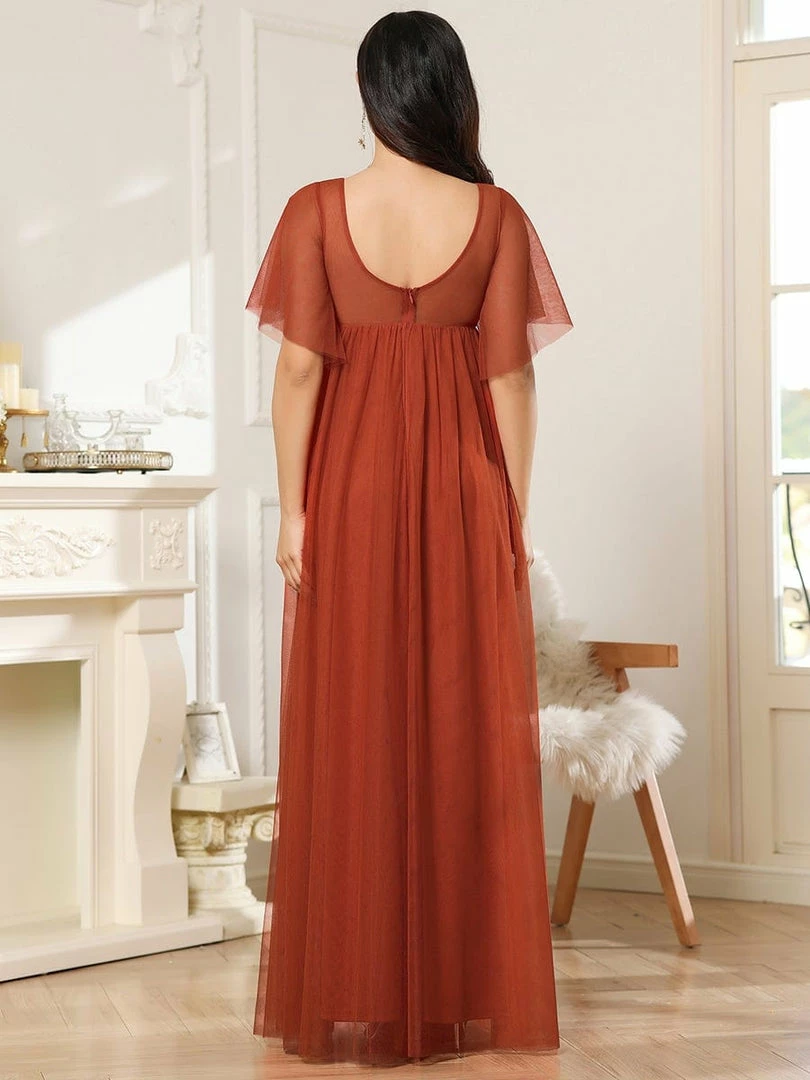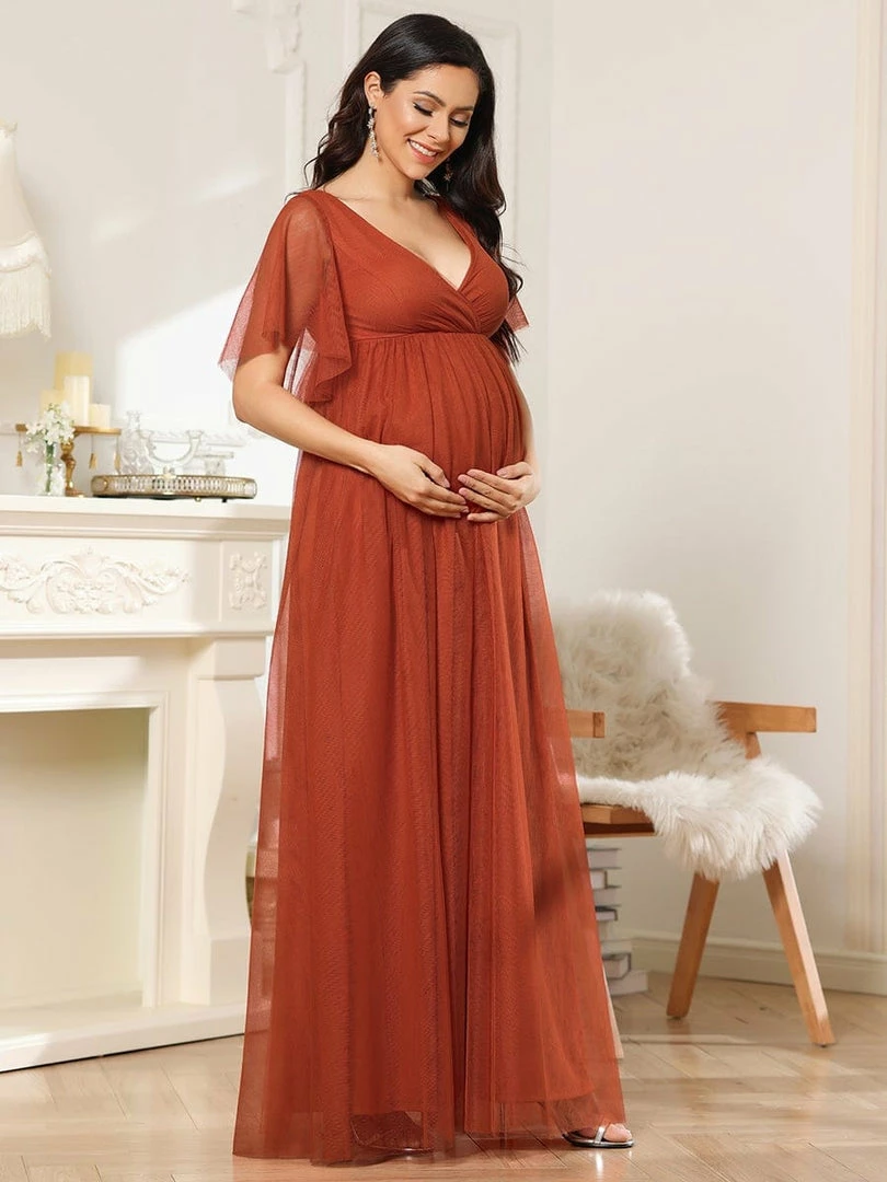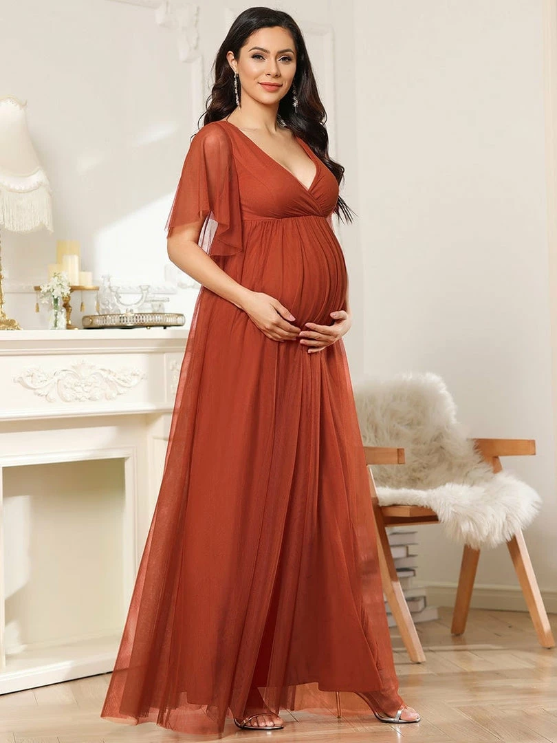 This sophisticated maternity dress features short ruffle sleeves and a plunging v-neck collar. A comfortable A-line silhouette gives this pretty formal/semi-formal maternity dress a bump-friendly fit with an elastic waist. Wear this formal/semi-formal maternity dress to a wedding, as a bridesmaid dress, or other special events.