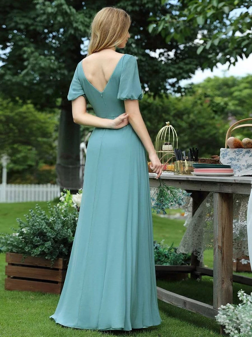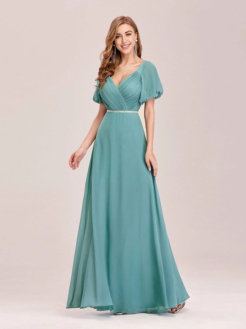 Looking for a bridesmaid dress to gift it to all of your girls? If yes, then this lantern sleeves maxi bridesmaid dress is a complete package and it would suit on everyone else as well. It features a deep V-neck and short lantern sleeves. The pleated design and bead and hot drill decoration make the dress look awesome. This gorgeous long chiffon bridesmaid dress is perfect for all formal occasions, from evening party, cocktail, weddings to prom, homecoming and graduation!