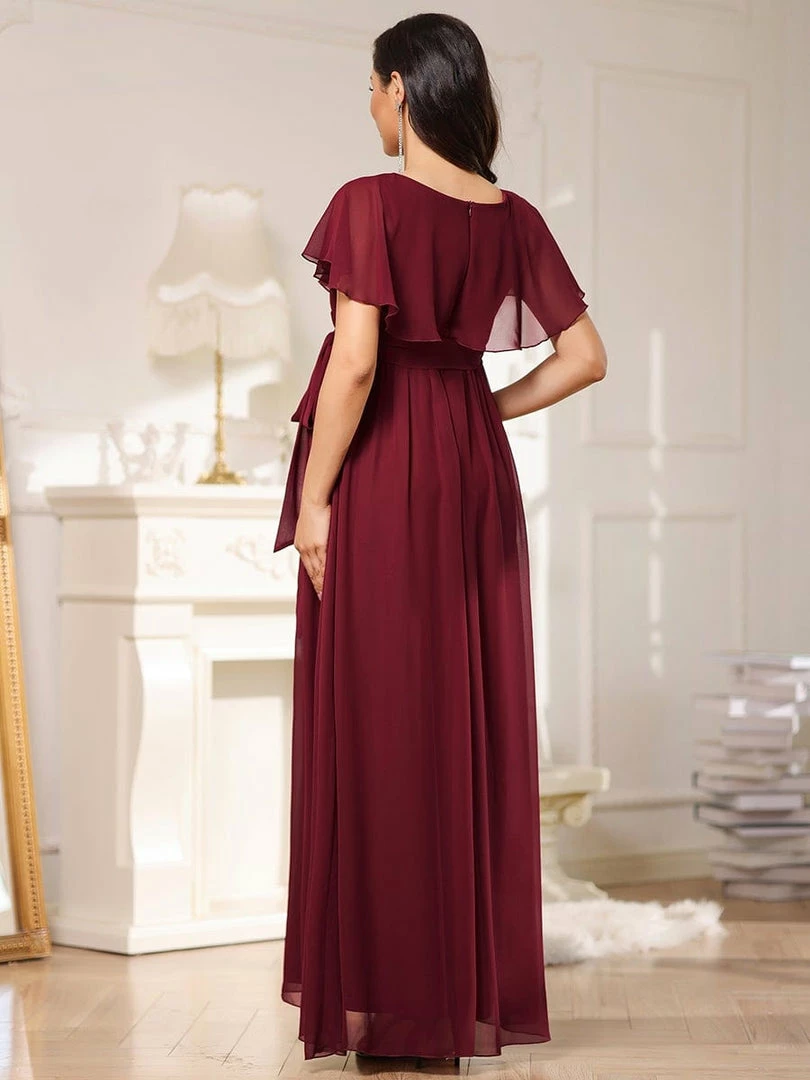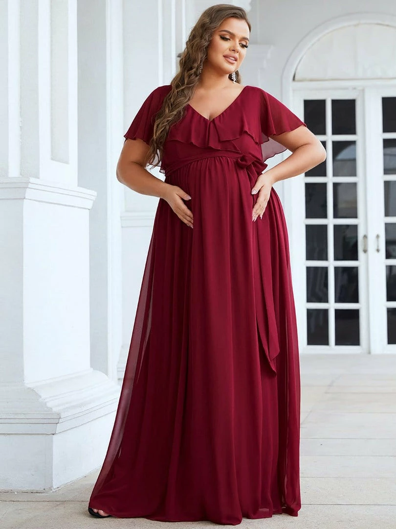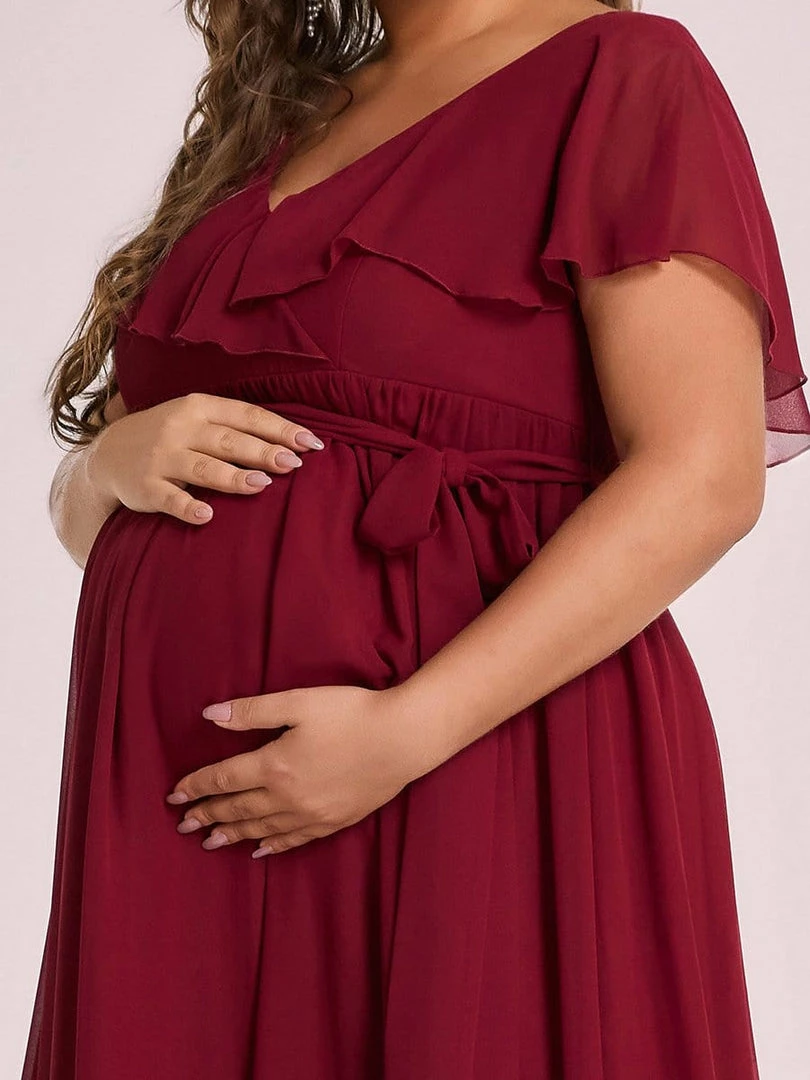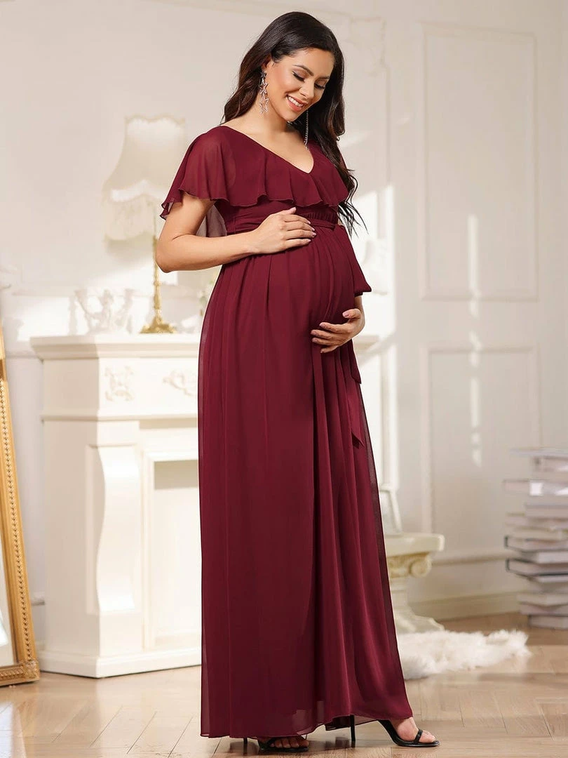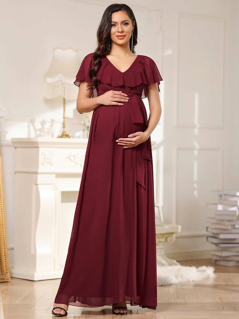 This summer-ready maternity bridesmaid dress features a feminine ruffled V-neck collar, tie waist, and flowing floor-length silhouette, making this beautiful dress versatile and timeless in style. Select this maxi maternity dress for a wedding, black-tie, concert, or other formal events with an elegant fit.