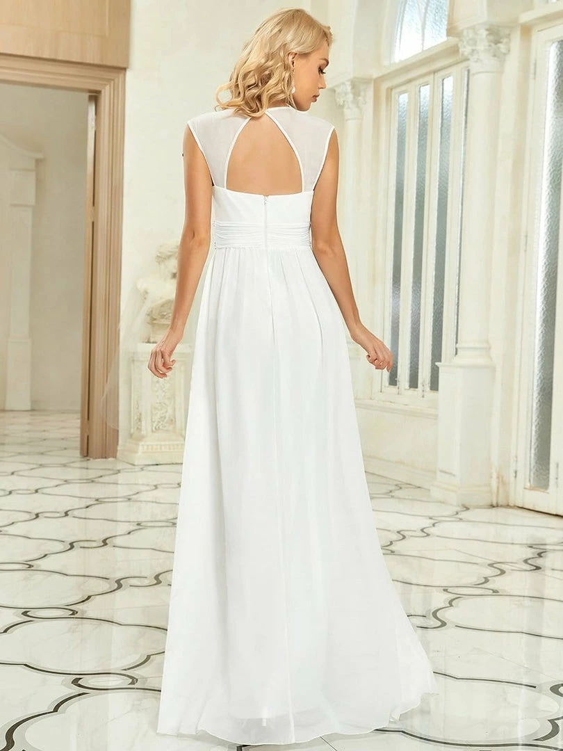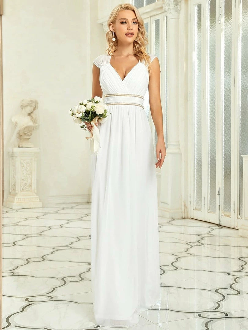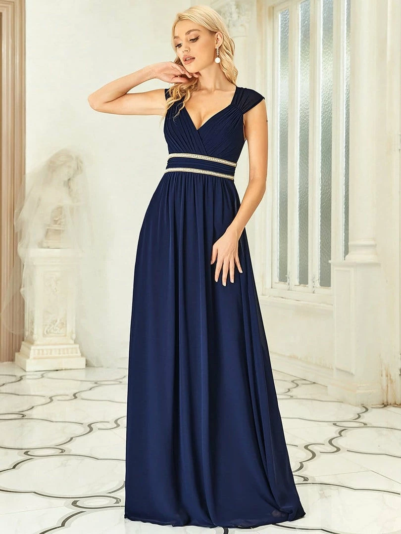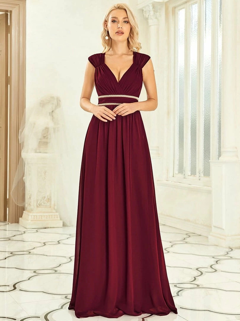 Gorgeous and timeless, celebrate your next formal event in pure elegance with this backless chiffon evening dress with decorative beaded detail on the waist. The plunging v-neck and capped sleeveless top feature flattering ruching throughout, along with a flowing A-line silhouette. Select this floor-length dress for bridal attire, prom, a bridesmaid dress or any formal and informal event.