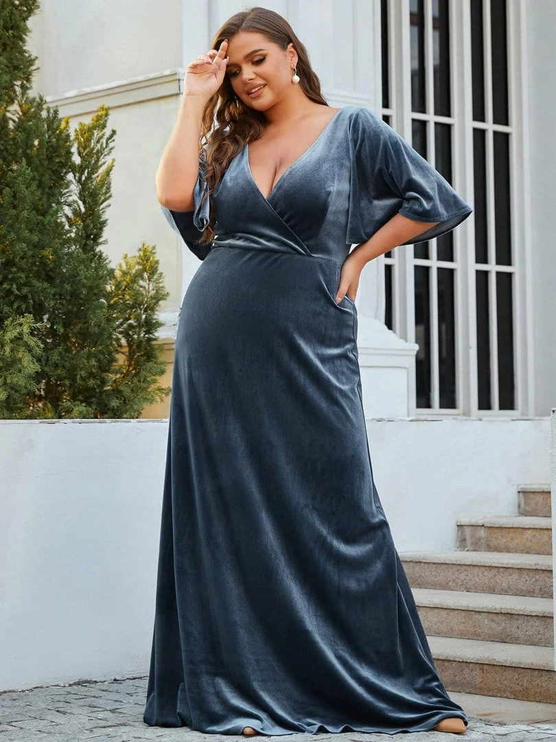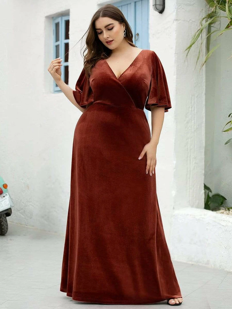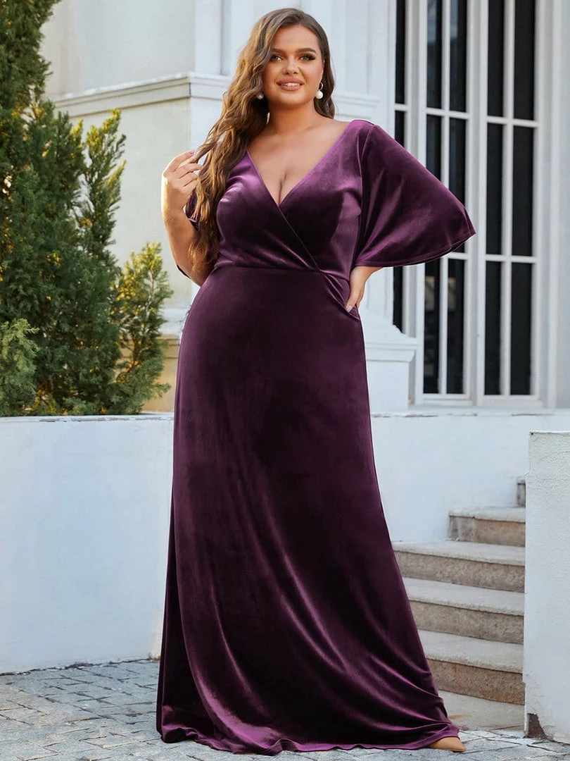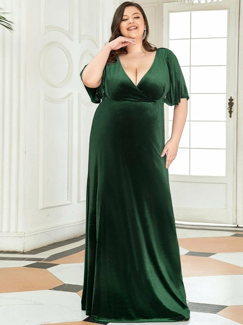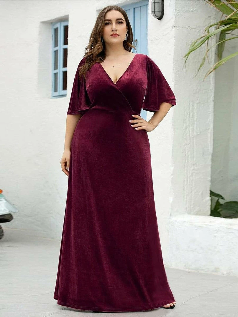 Featuring a double V neckline and ruffles sleeves, this stylish plus size velvet maxi evening dress is your perfect choice for the first event in Fall! Find top quality velvet v neck evening dress for curvy women from Ever Pretty.