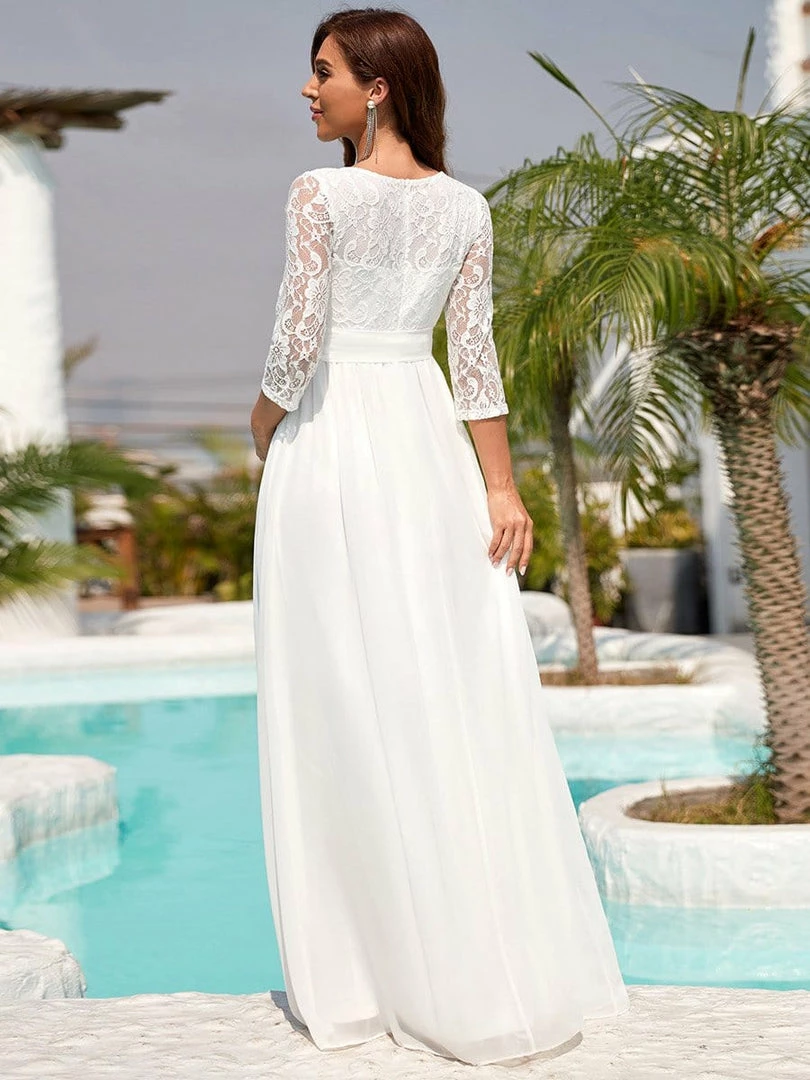 This beautiful floor-length maternity dress features a vintage lace style top complete with 3/4 fitted sleeves and a comfortable elastic waist. A long multi-layered skirt gives this maternity dress a formal style, perfect for any special event.