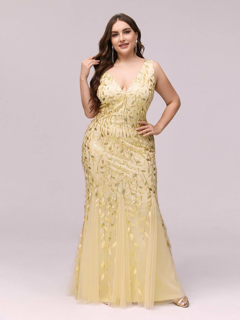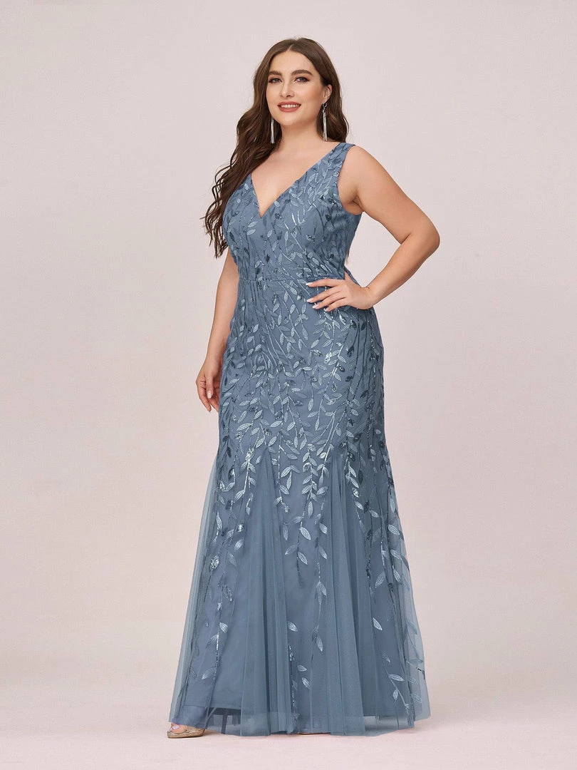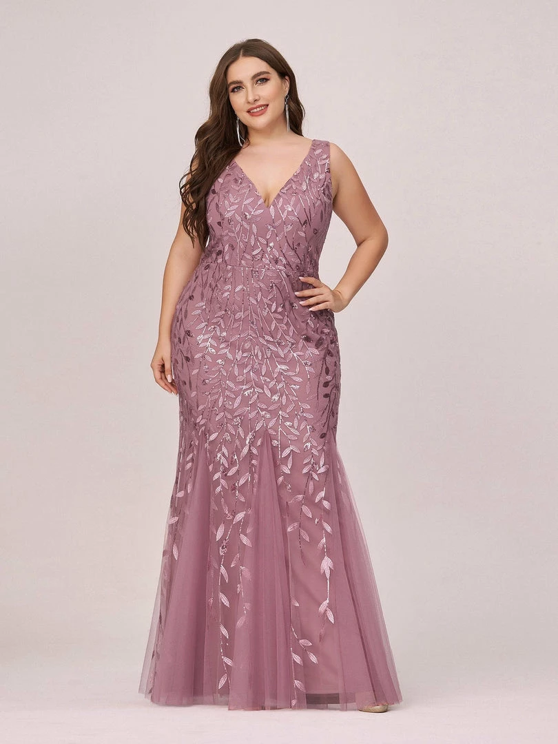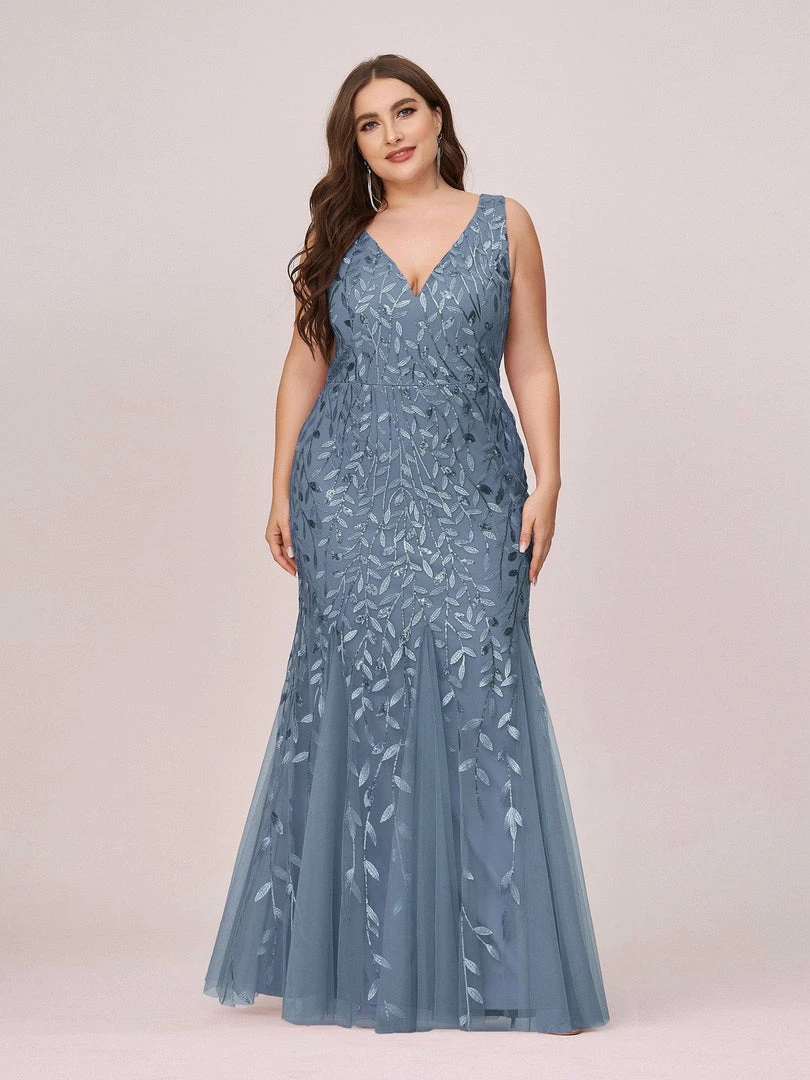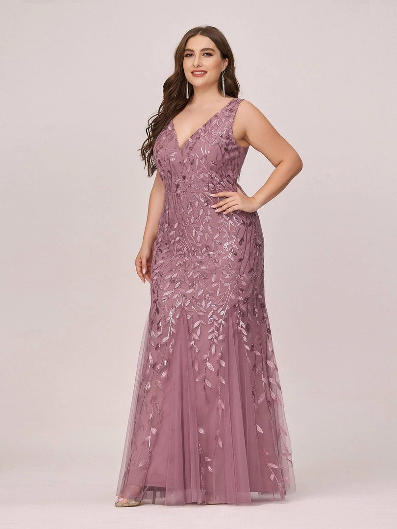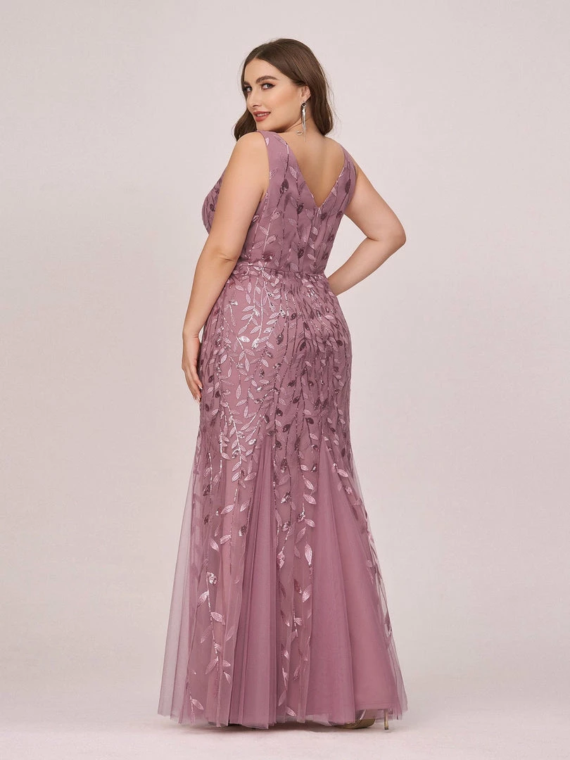 This plus size sequined tulle evening dress features a deep V neckline and fishtail skirt, the shimmery leave design also adds a romantic vibe. It is a perfect choice for people who are looking for an elegant look, but its delicate details add just enough flair to show your taste. Really perfect for evening party, cocktail, prom, homecoming, graduation, weddings, and any other formal affair! Prices will vary as certain colors of this style is on sale.
